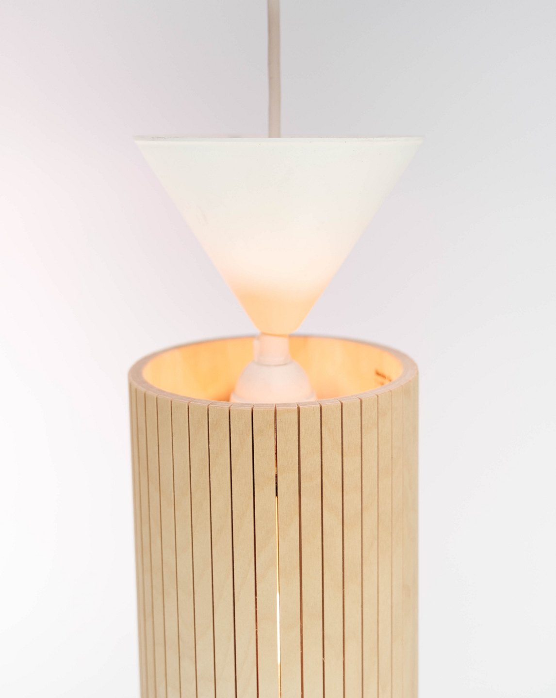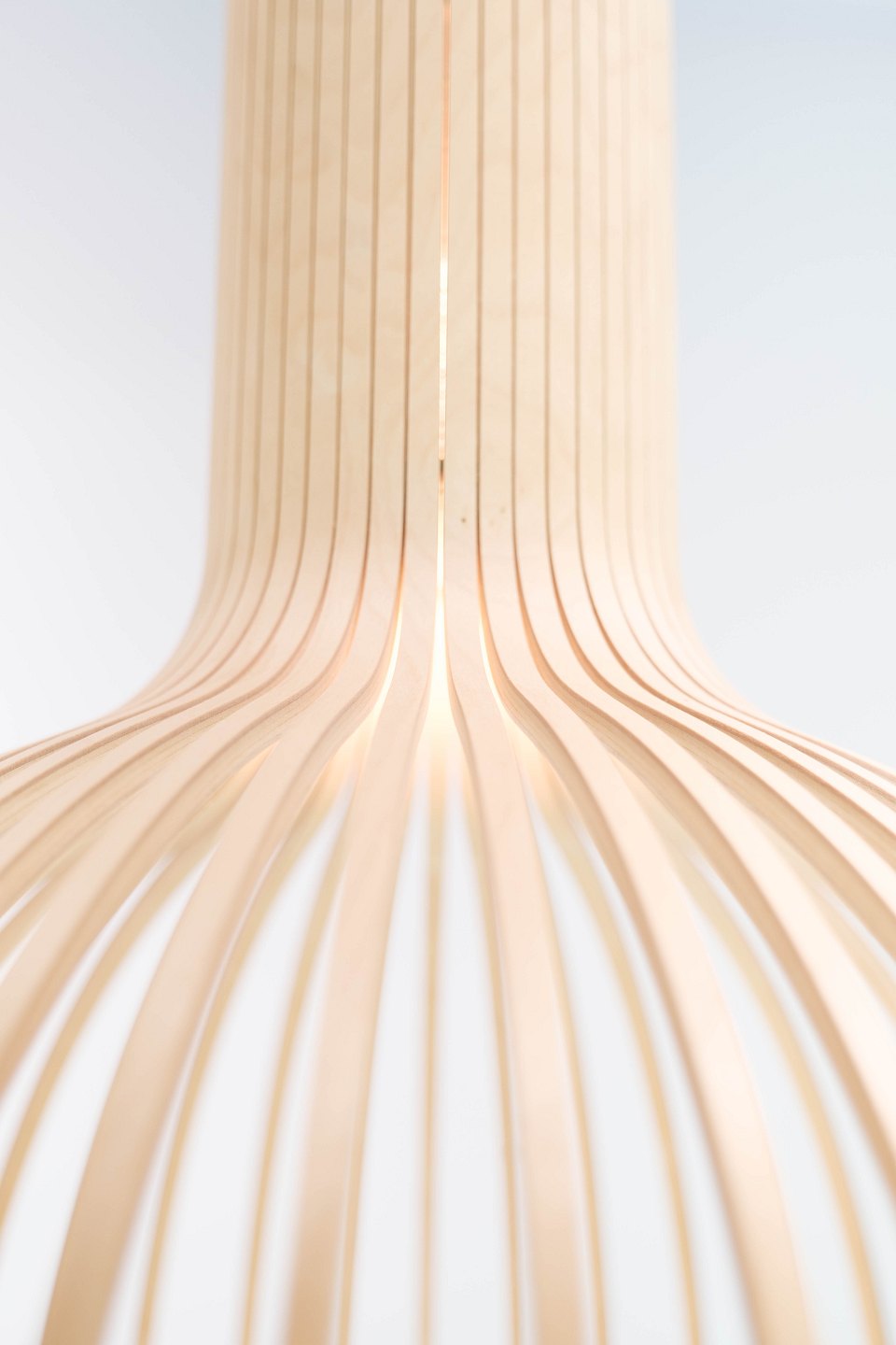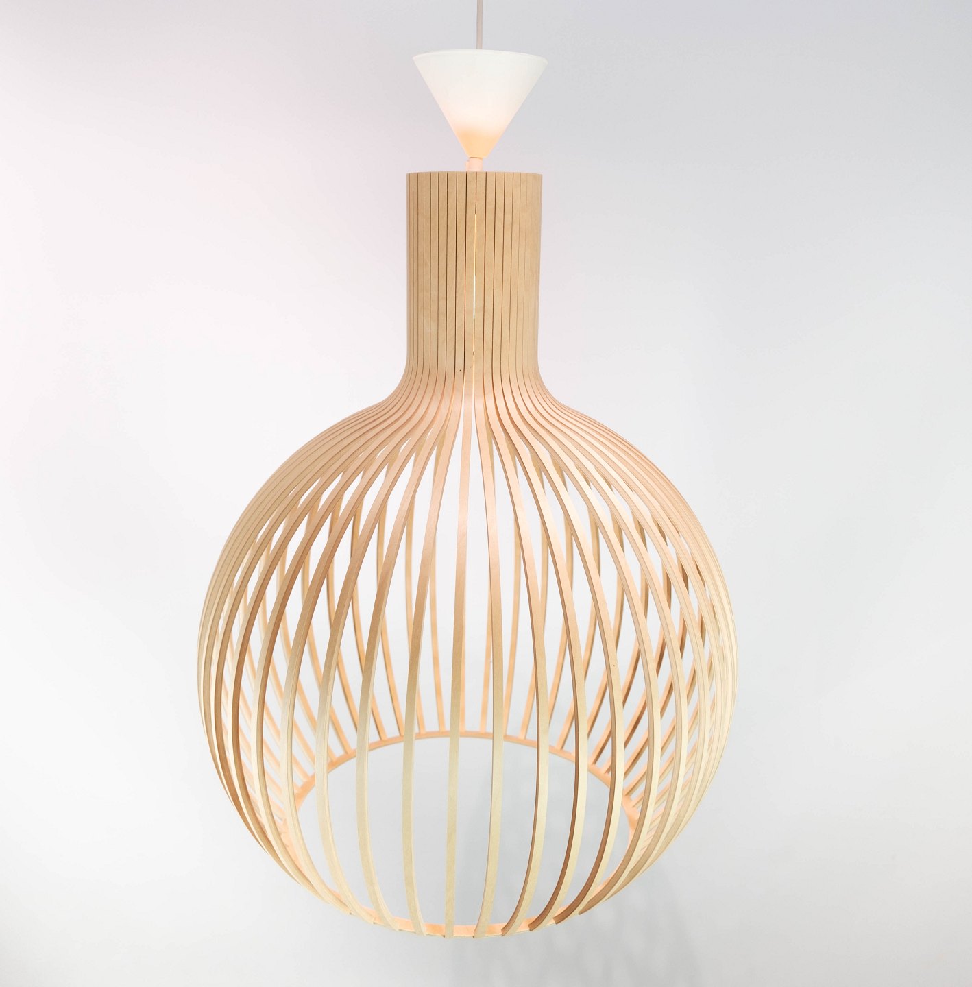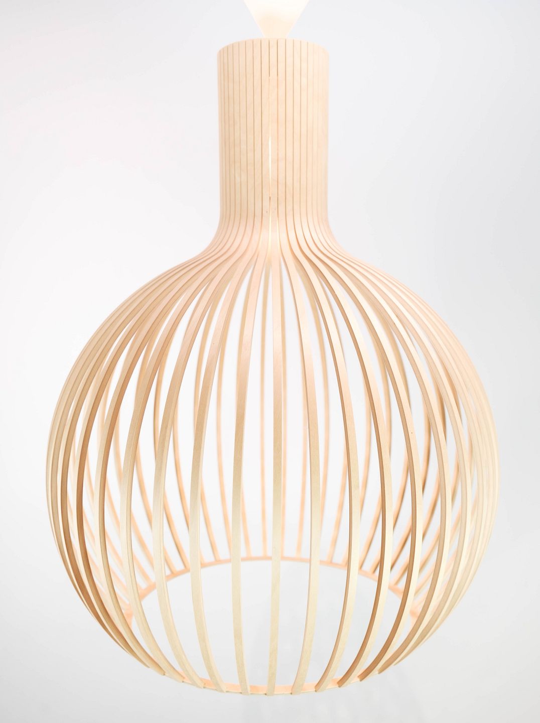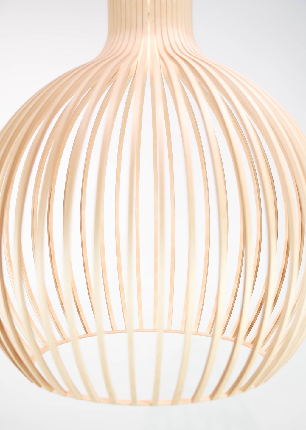 SoldSecto Octo, model 4240, pendant of birch wood, of Finnish design. Very modern form of lighting suitable for any environment. The design is known among decorators and architects. The straw color creates a very neutral base and very smooth in the mood. The lamp is in great vintage condition.
