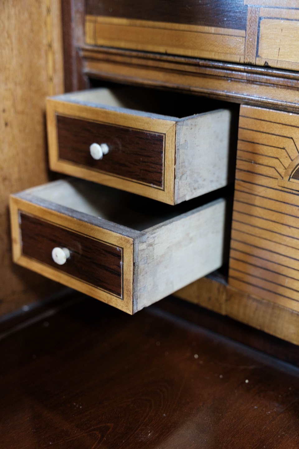 Large Empire bureau of polished mahogany with inlaid wood and decorated with carvings, from the 1840s. The item is in great vintage condition.