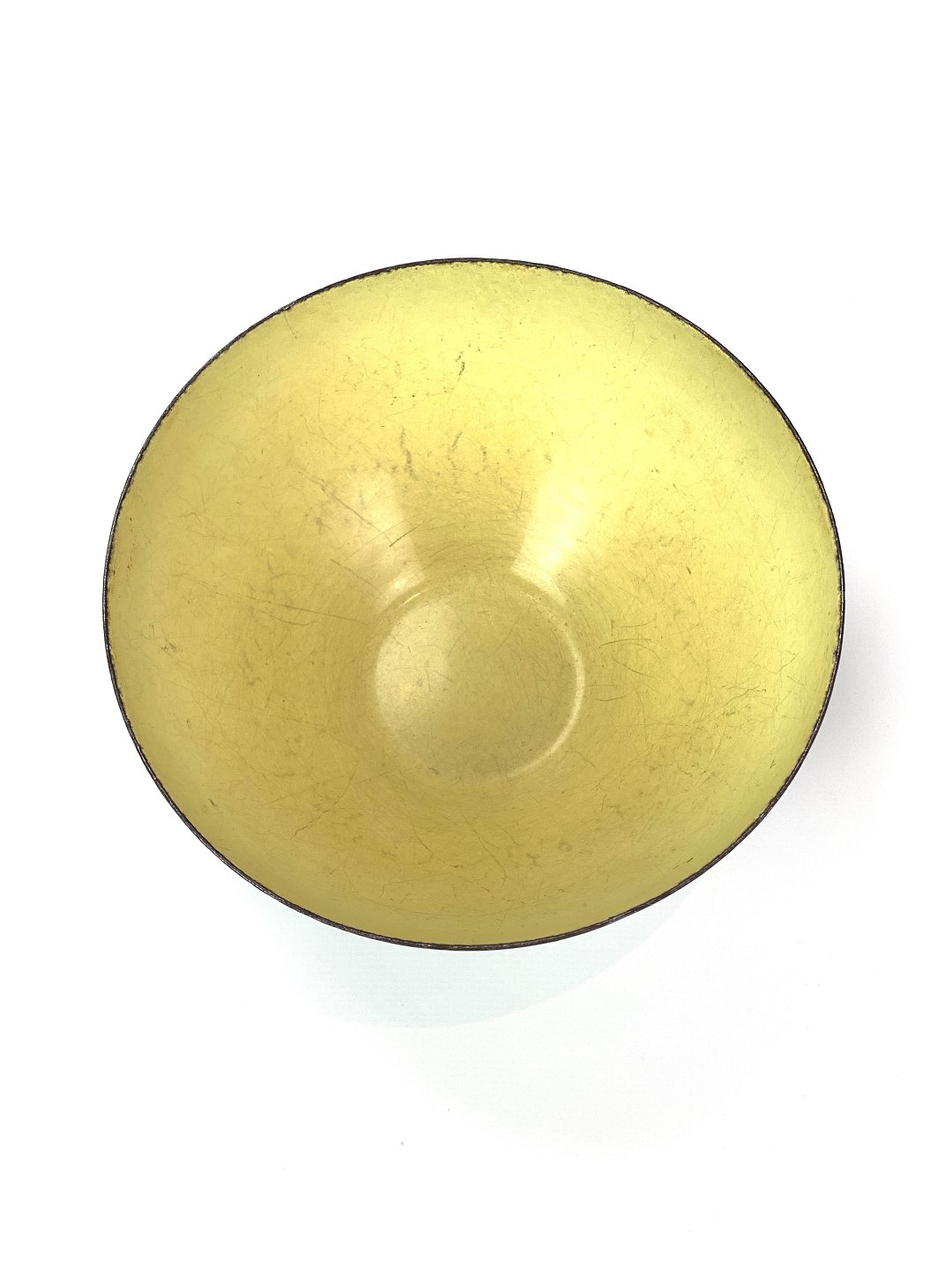 SoldKrenit bowl by Herbert Krenchel of black metal with light green and yellow enamel from the 1960s. The bowl is of danish design and in great vintage condition.