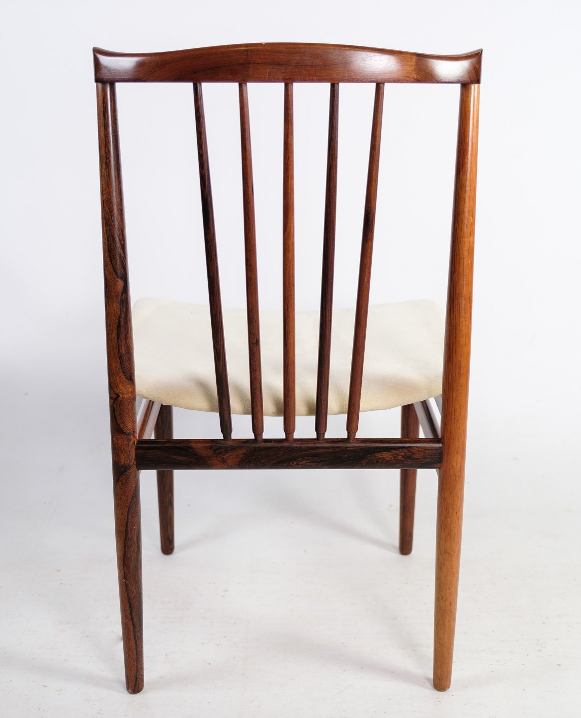 A set of four dining chairs in rosewood designed by Henning Sørensen in 1968. The chairs are in very good condition with light fabric.