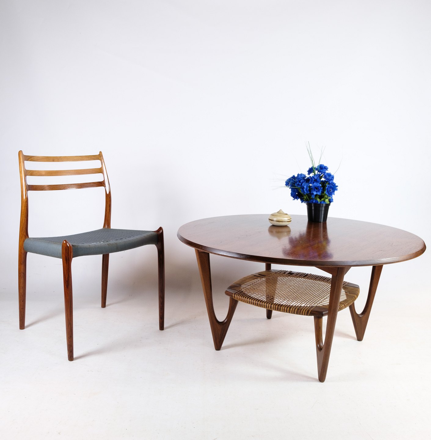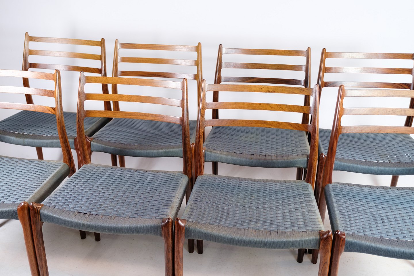 Set of 8 dining room chairs, model NO 78, designed by N.O Møller and manufactured by J. L. Møller Møbelfabrik from around the 1960s. The chairs are in rosewood with blue wicker. In our own workshop we can braid the chairs or cover with leather for an extra price. Write an email to us and we will find out together. Info@osted-antik.dk