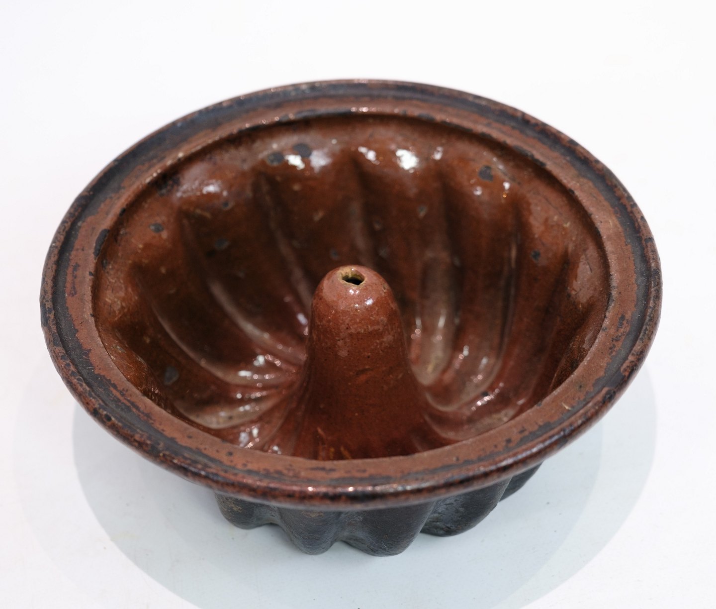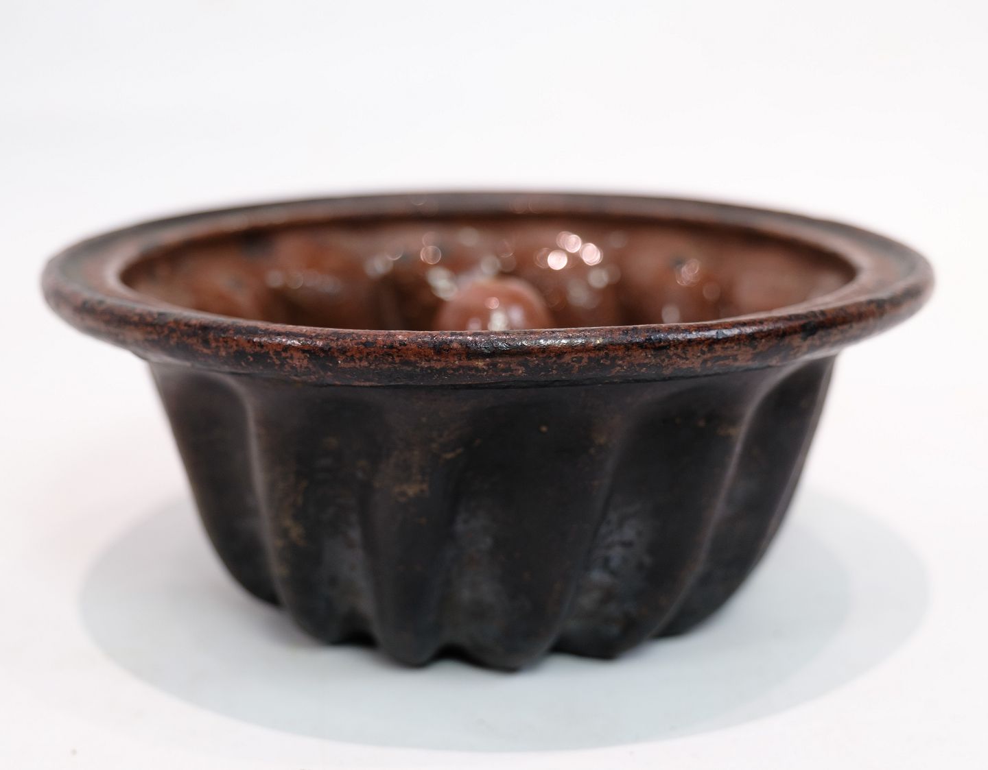 Buddingeform af lertøj i brunlige farver fra omkring år 1930'erne