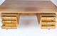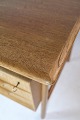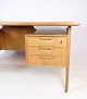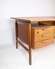 Skrivebordet, du beskriver, er en model 75, designet af den danske møbeldesigner Gunni Omann og produceret af Omann Junior Møbelfabrik i omkring 1960'erne. Det er lavet af lyst teaktræ, hvilket giver det et elegant og moderne udseende.