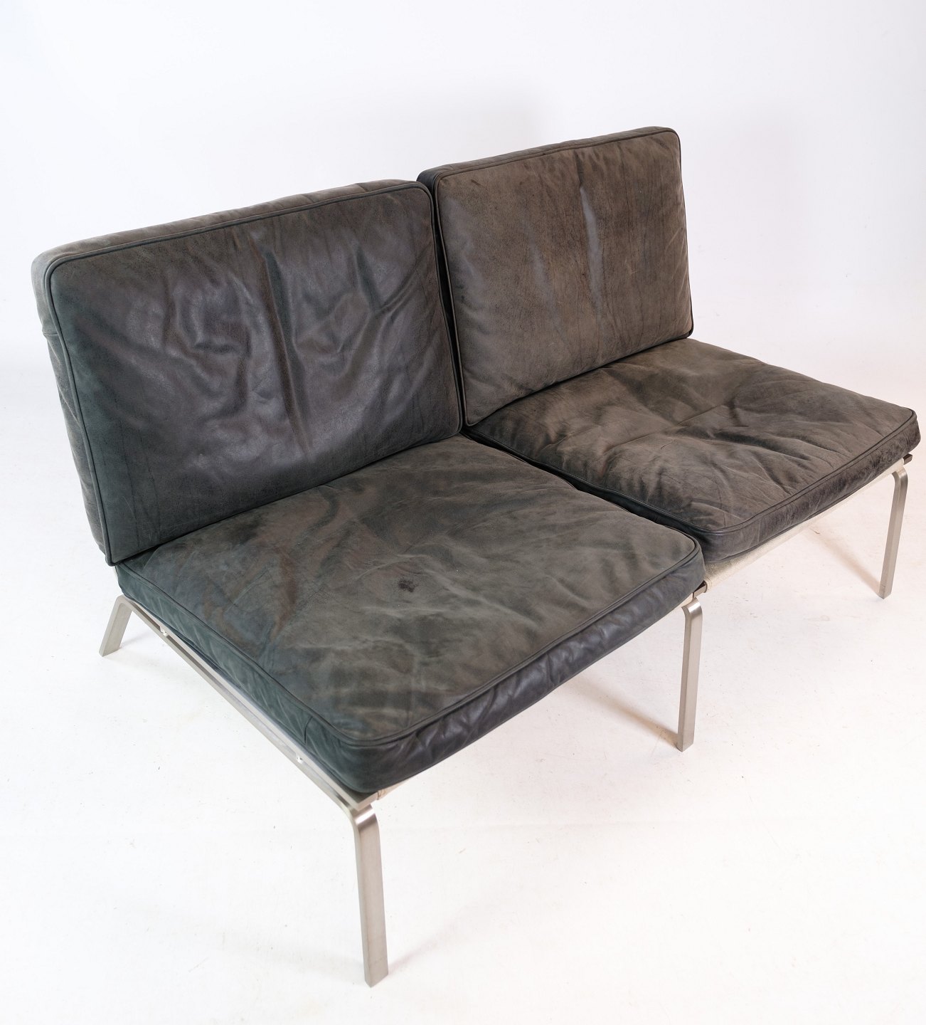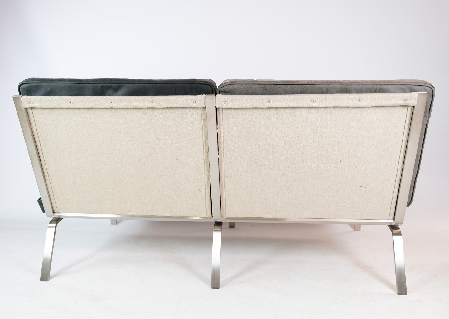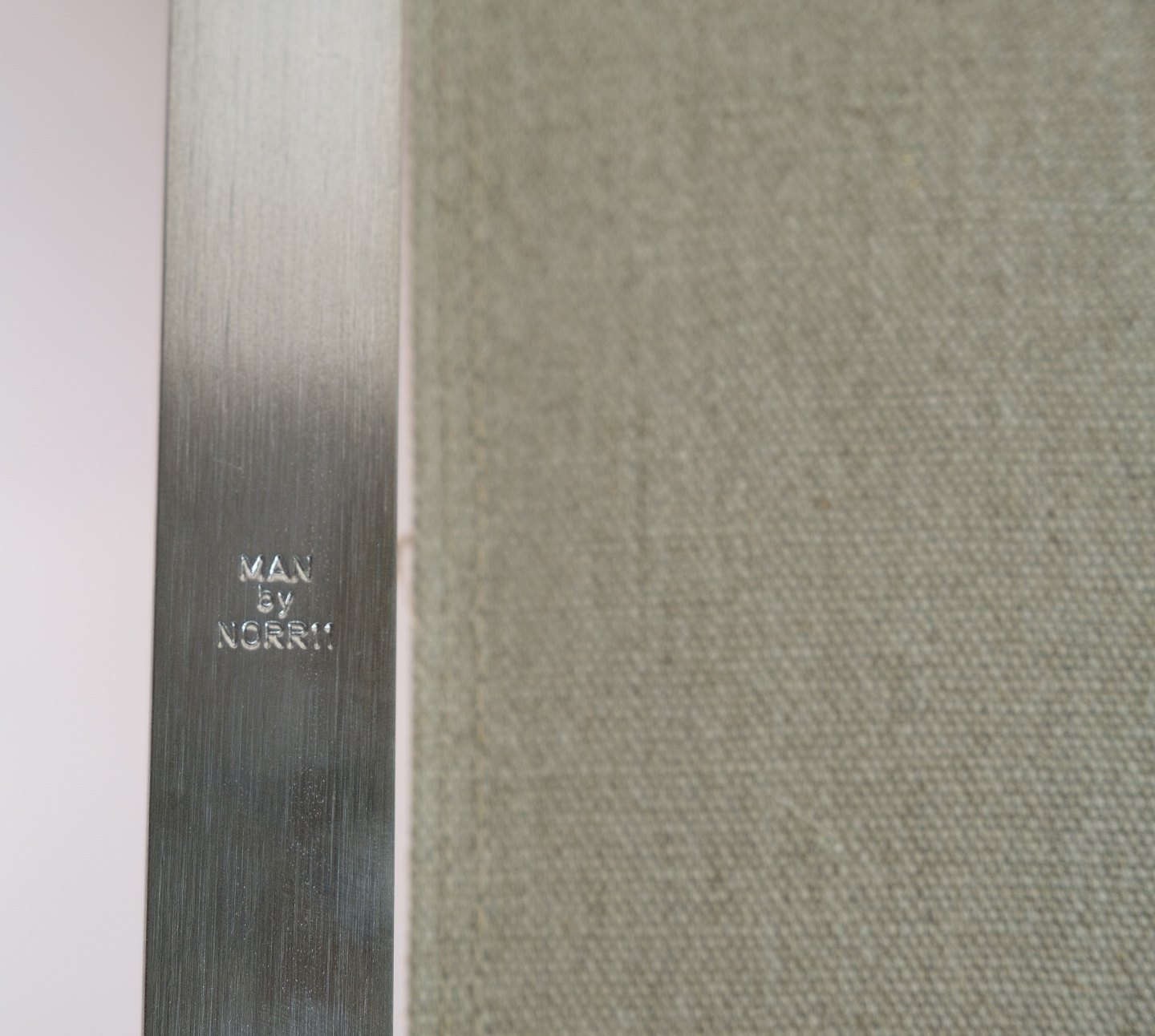 Norr11's 2-personers sofa er et unikt design, skabt med et stel af rustfrit stål og sorte læderhynder, hvilket giver sofaen et stilrent og holdbart udtryk. Denne kombination af materialer gør sofaen både elegant og slidstærk, så du kan nyde den i mange år fremover.
