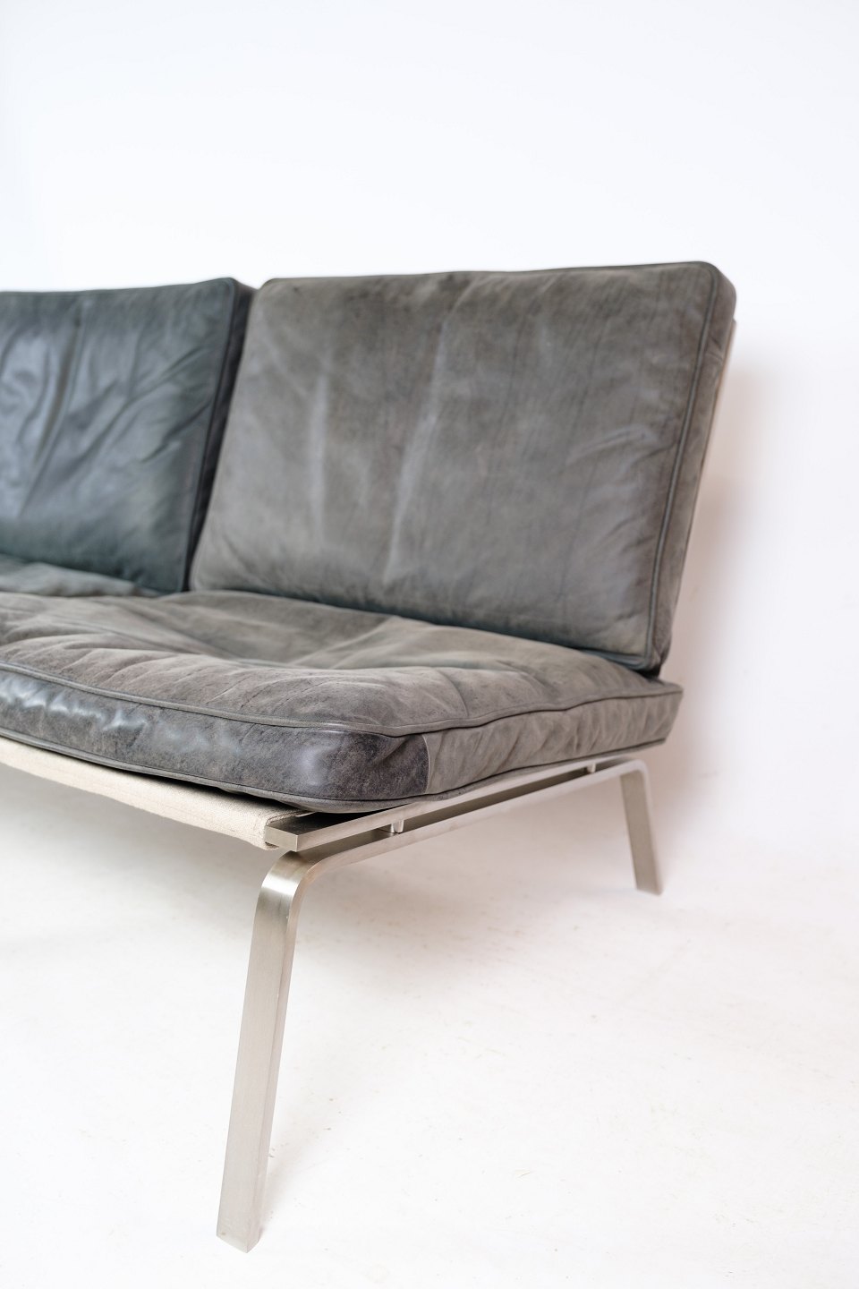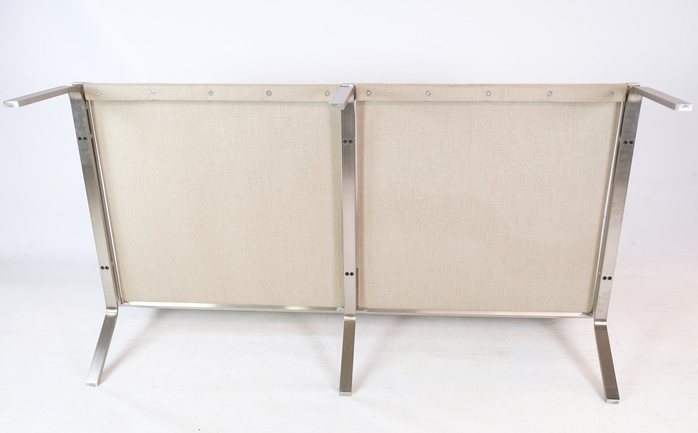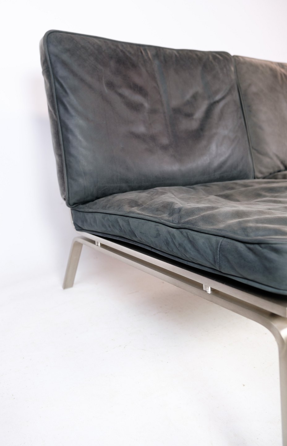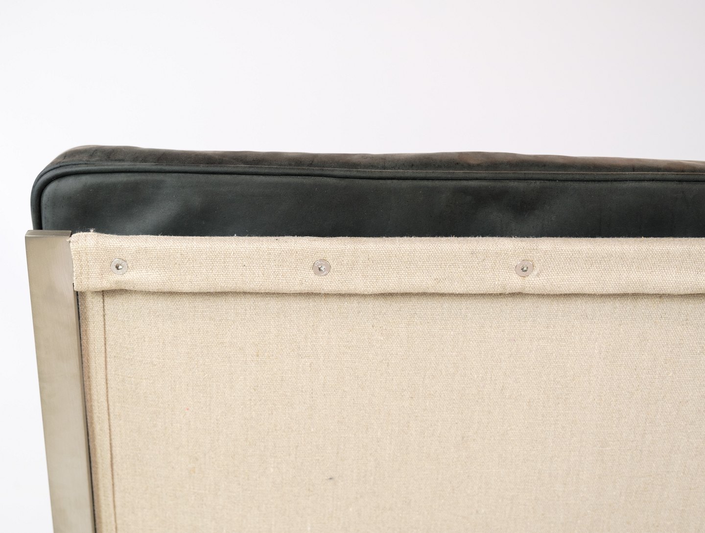 Norr11's 2-personers sofa er et unikt design, skabt med et stel af rustfrit stål og sorte læderhynder, hvilket giver sofaen et stilrent og holdbart udtryk. Denne kombination af materialer gør sofaen både elegant og slidstærk, så du kan nyde den i mange år fremover.