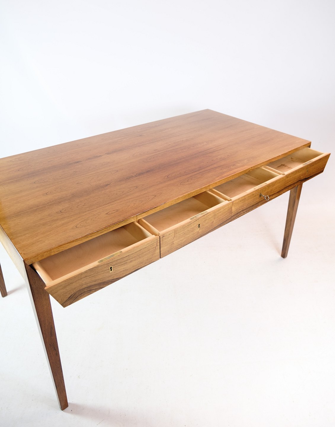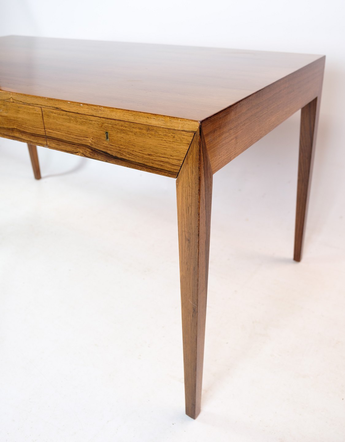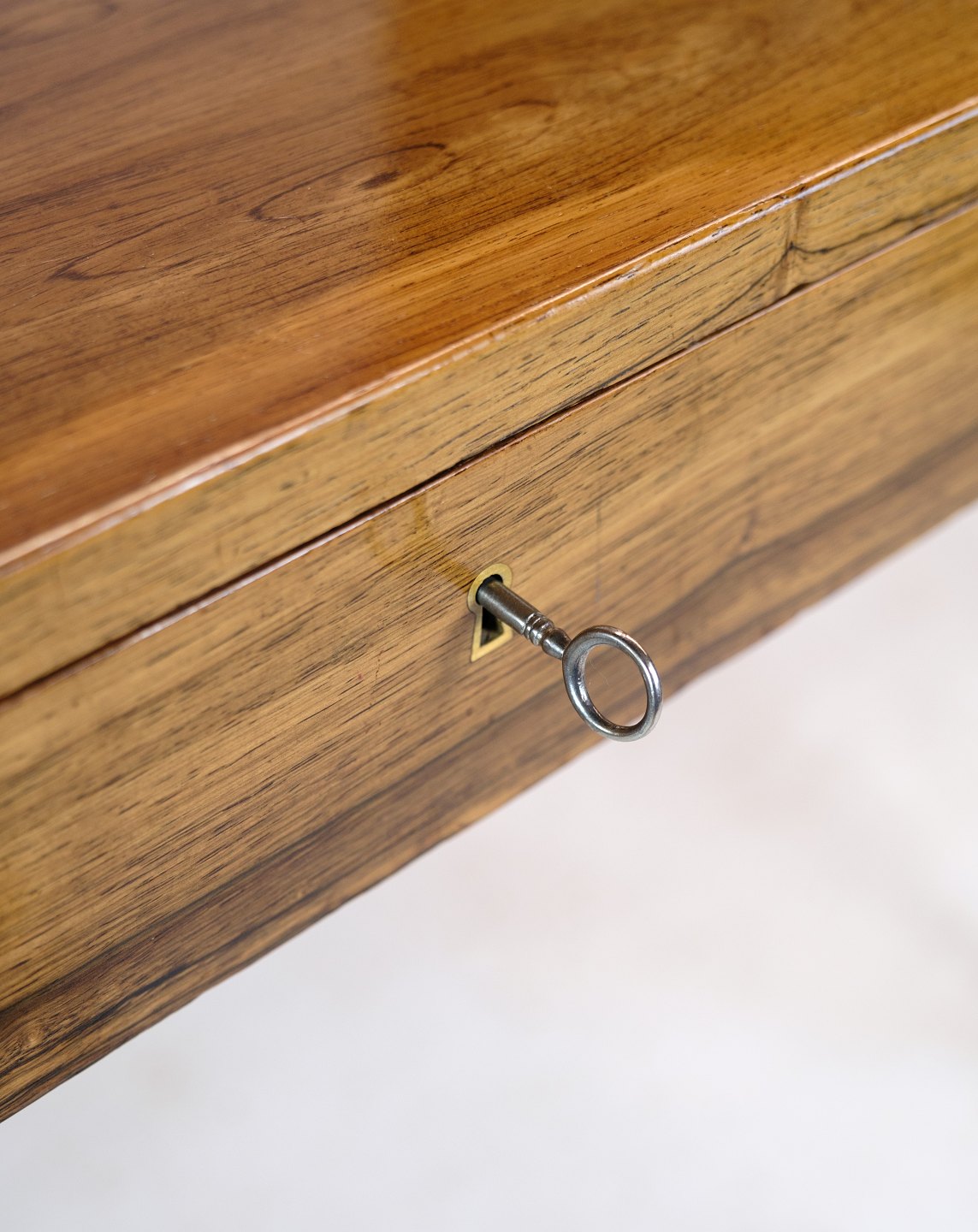 The desk in rosewood, designed by Severin Hansen and manufactured by Haslev Møbelfabrik in 1960, is an example of Danish furniture art at its finest.