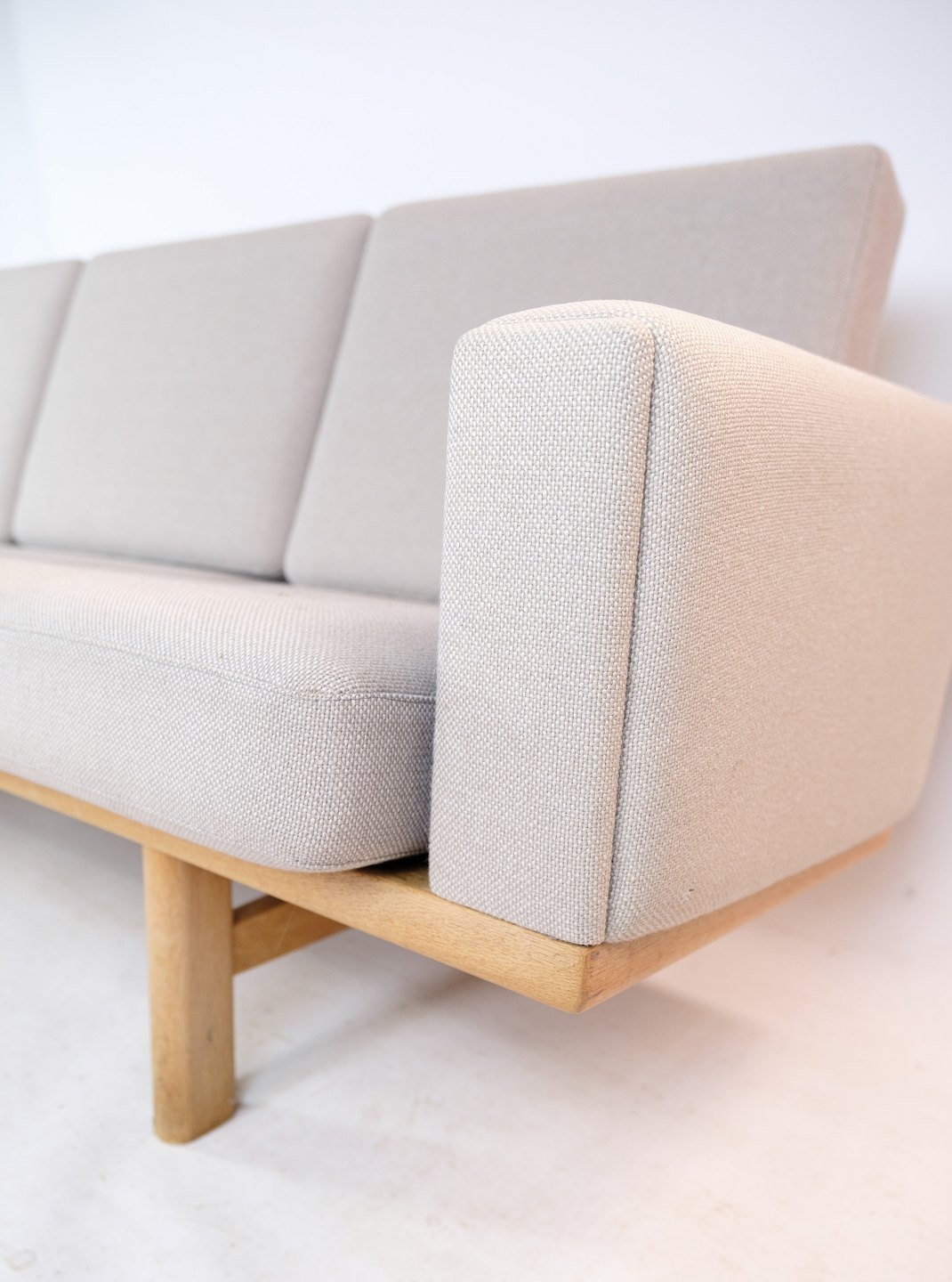 The sofa GE-236/3, designed by Hans J. Wegner and manufactured by Getama in the 1960s, is an elegant and stylish three-seater sofa. It is upholstered with a light wool fabric that gives it a soft and comfortable seat. The frame is made of solid oak, which gives the sofa a robust and durable appearance. The sofa will be an excellent choice for those who want to add a touch of Danish design and craftsmanship to their home.