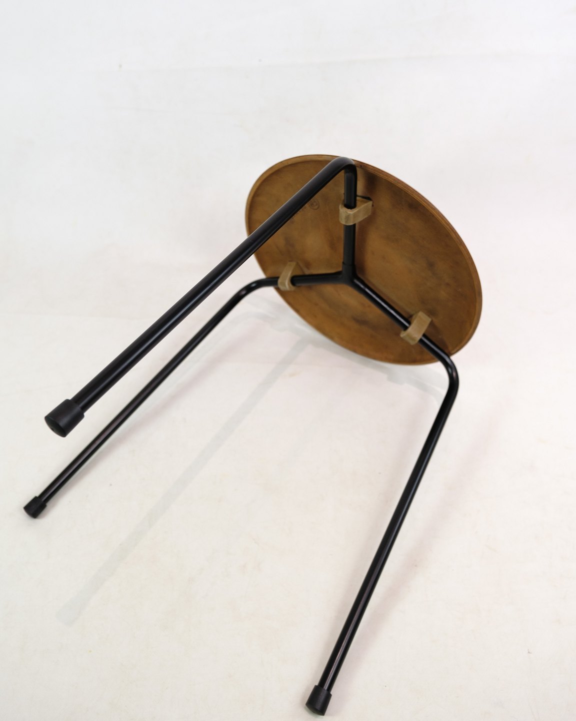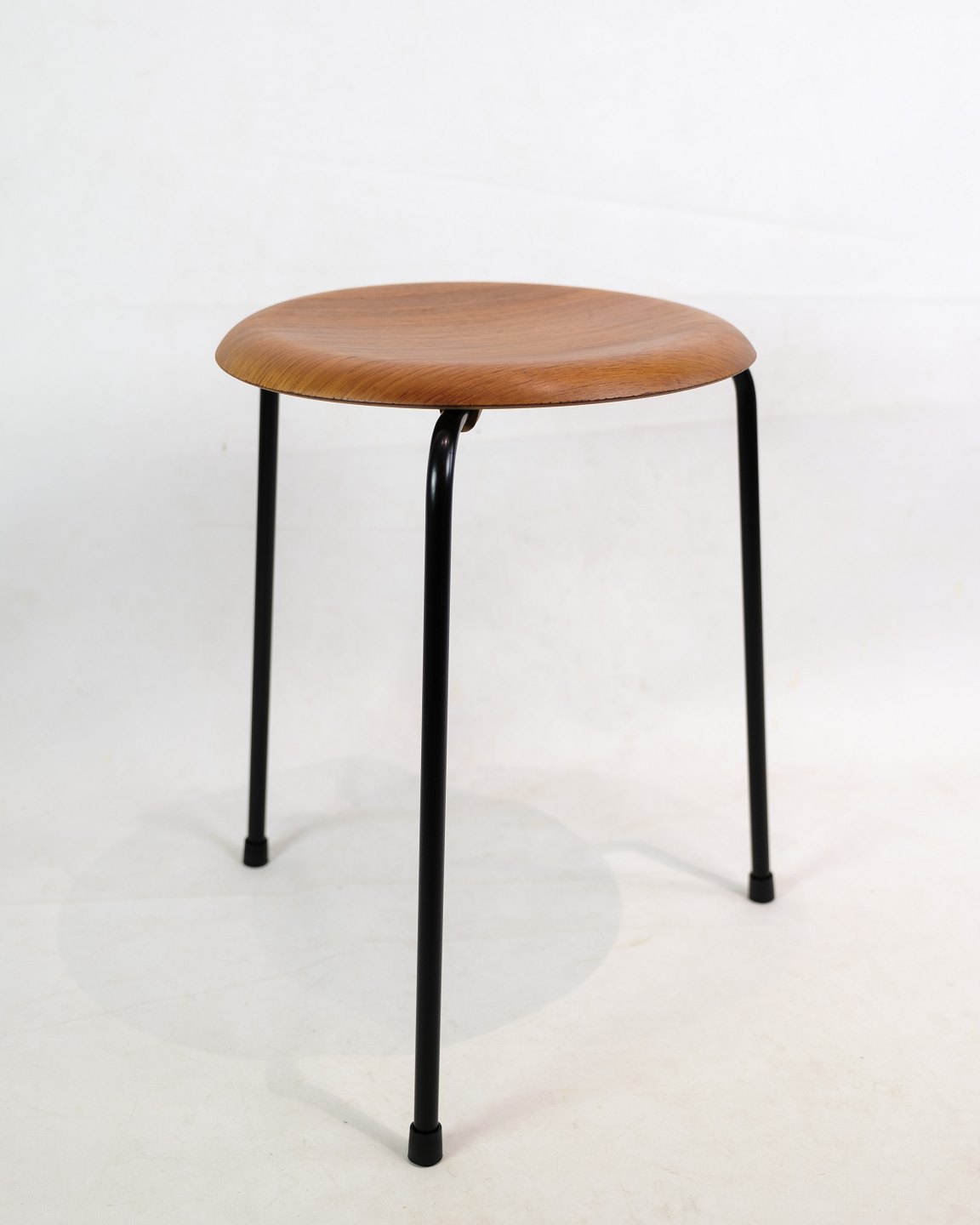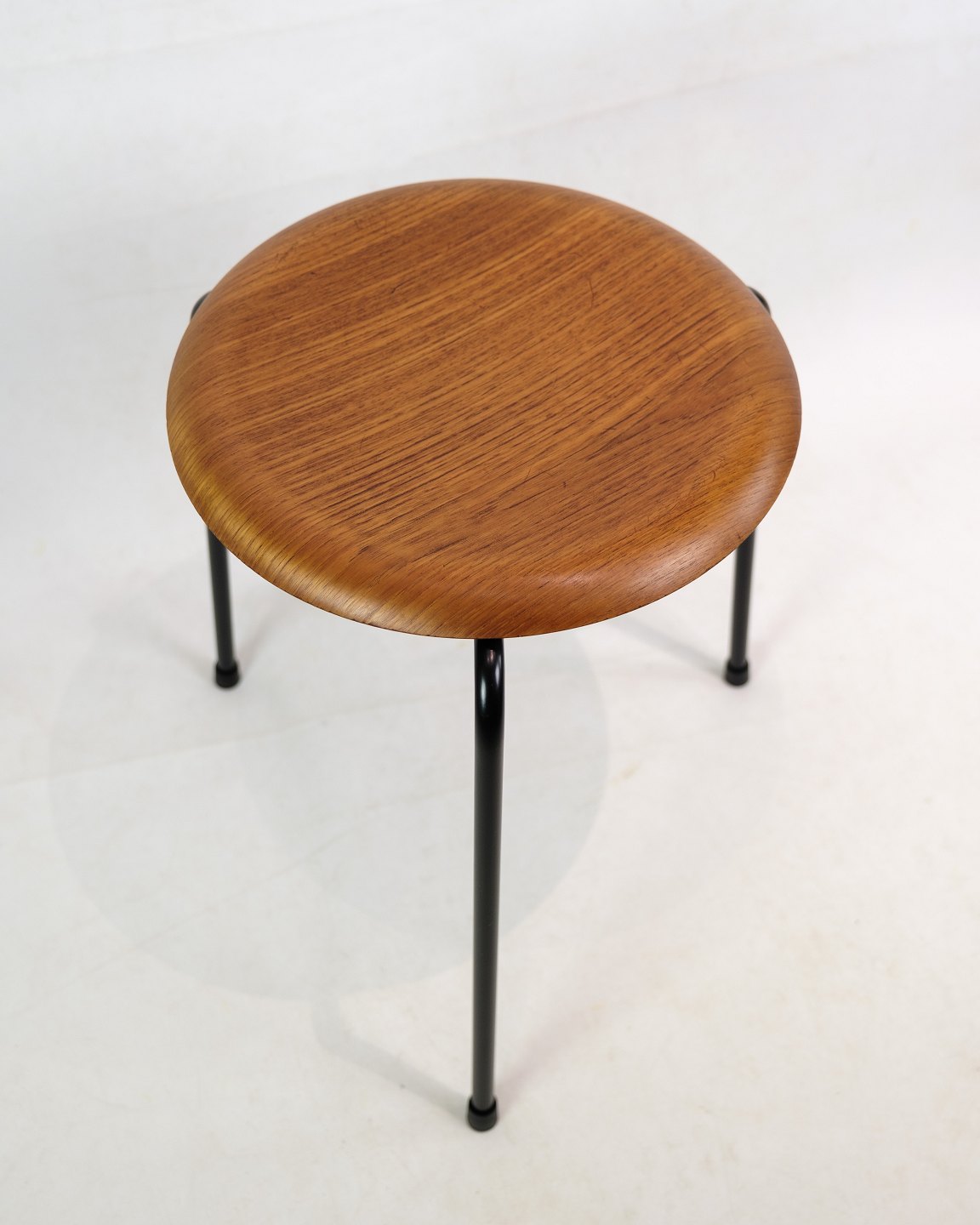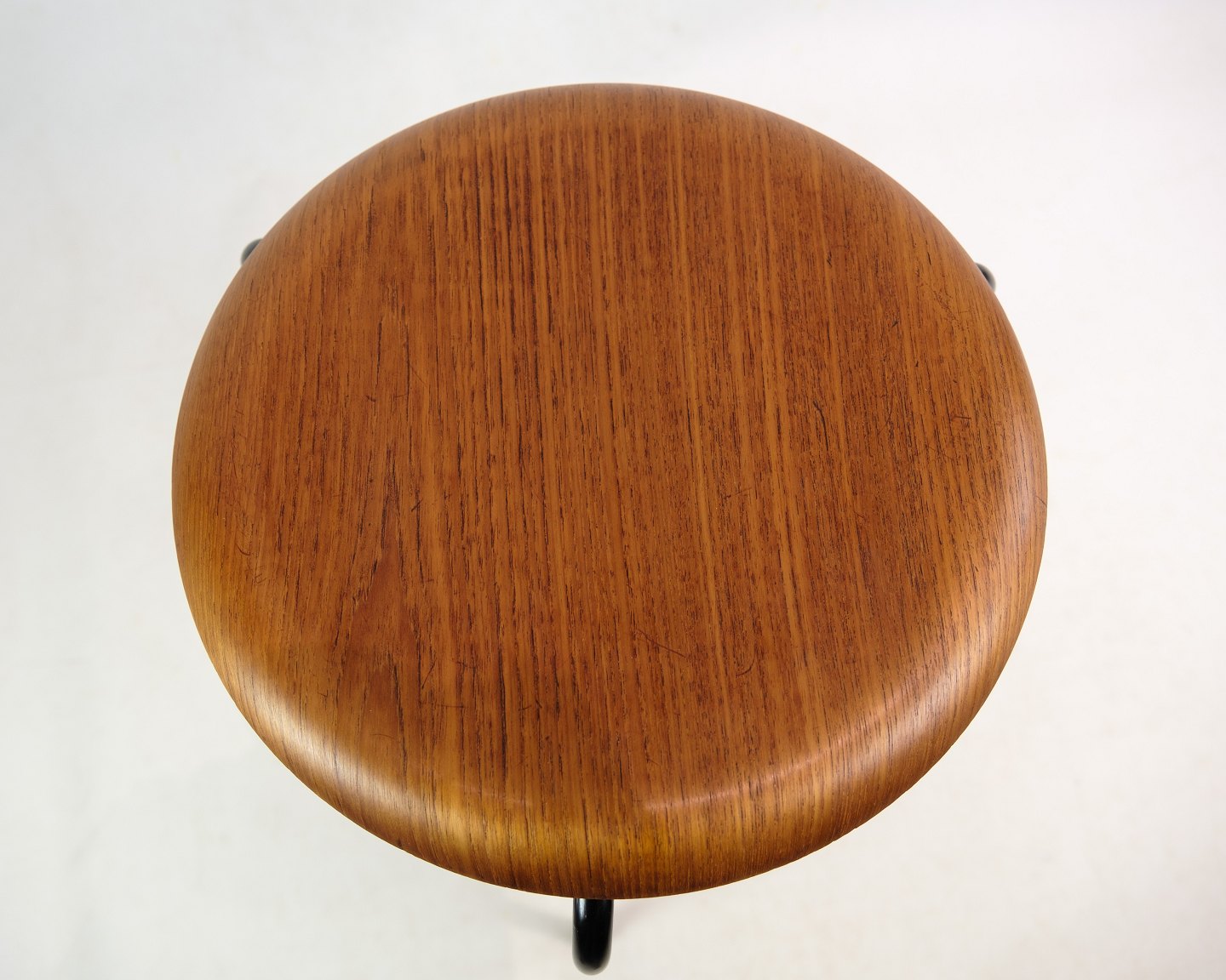 SoldA set of teak stools with a black frame, designed by Arne Jacobsen and manufactured by Fritz Hansen from around the 1950s.