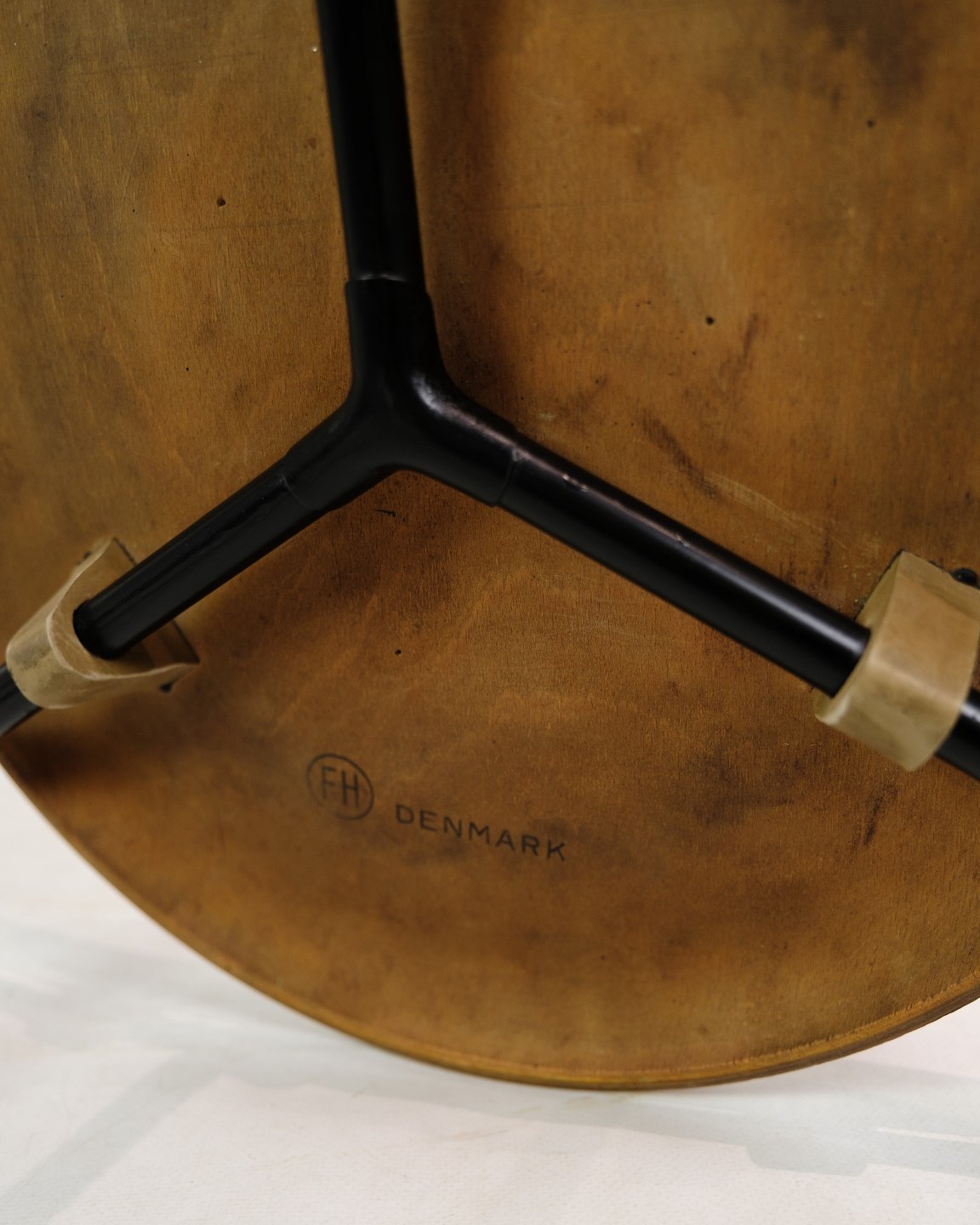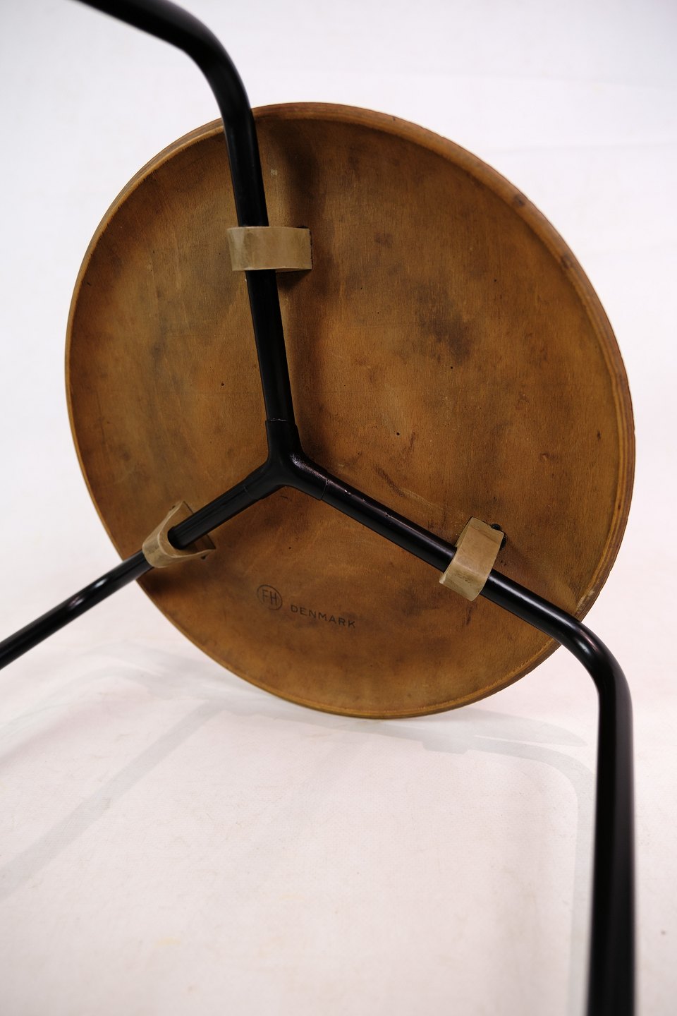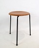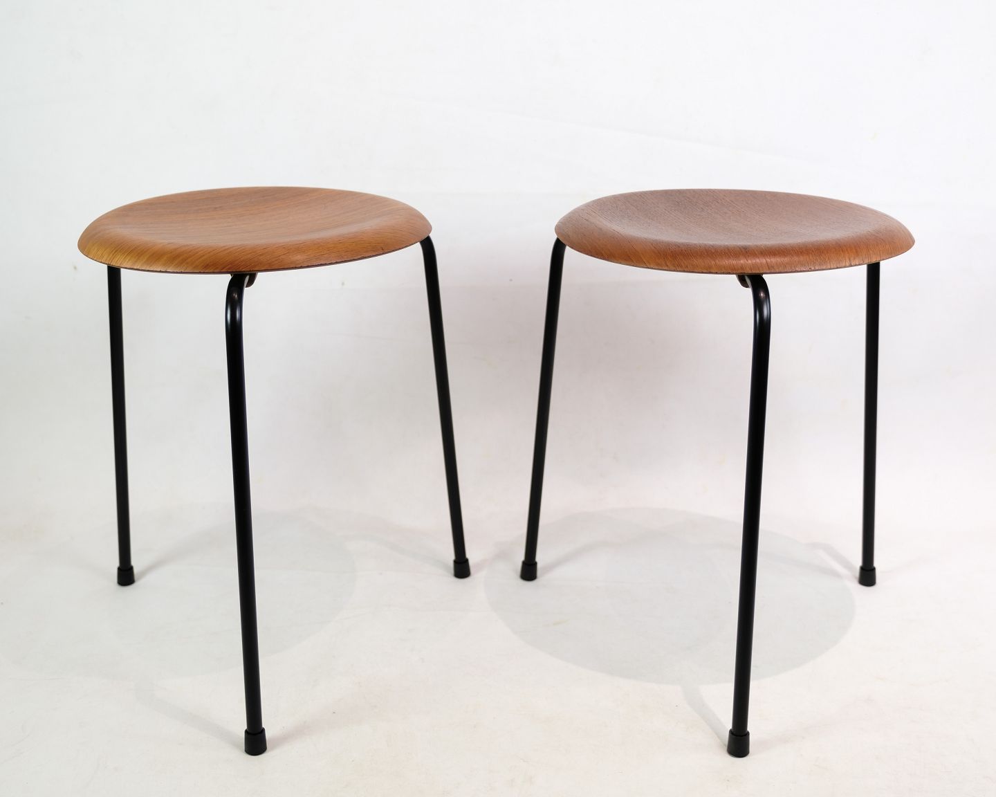 SoldA set of teak stools with a black frame, designed by Arne Jacobsen and manufactured by Fritz Hansen from around the 1950s.