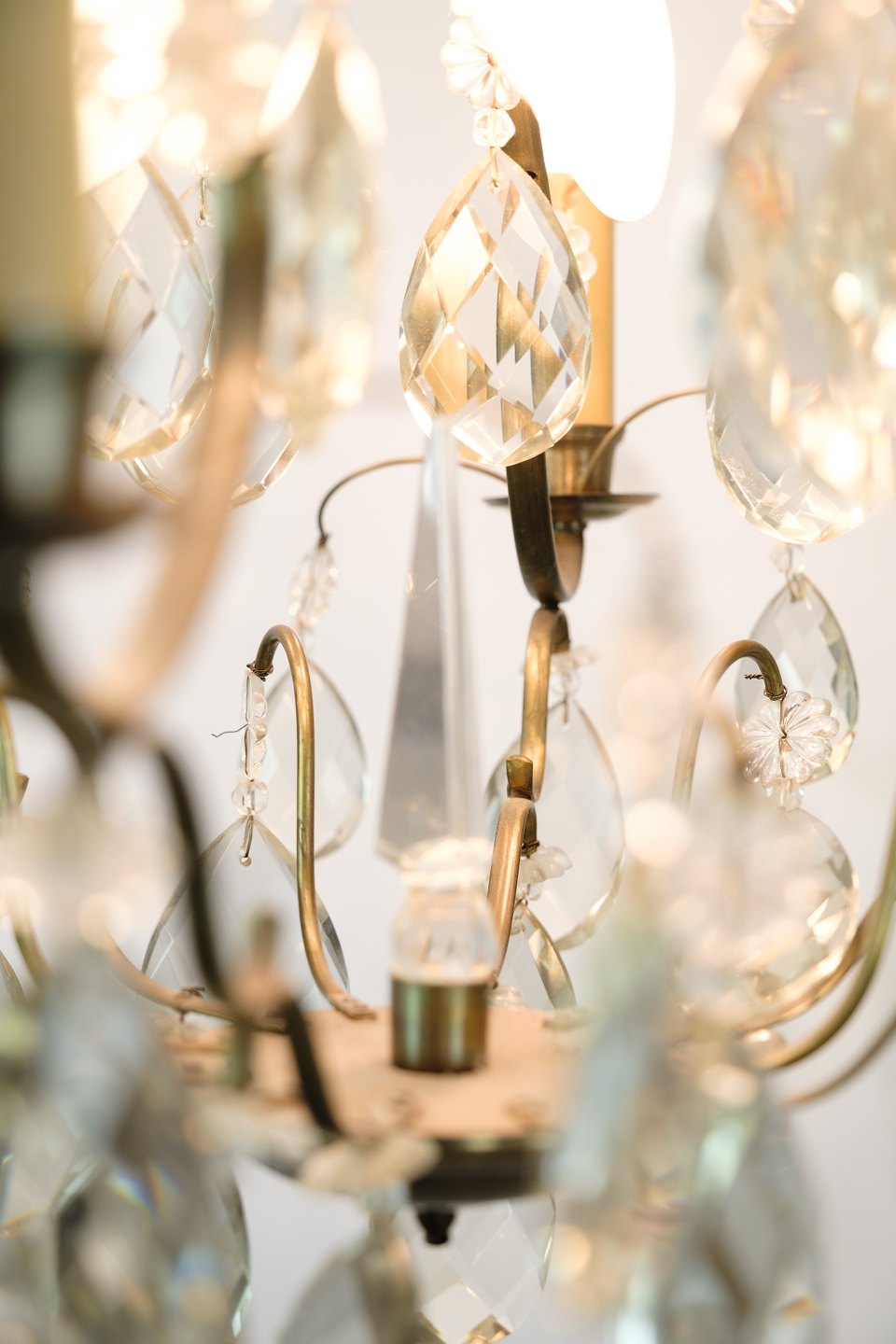 SolgtPrismekrone af messing og slebne prismer fra Frankrig omkring 1920erne. Til lampen medfølger en baldakin i messing.