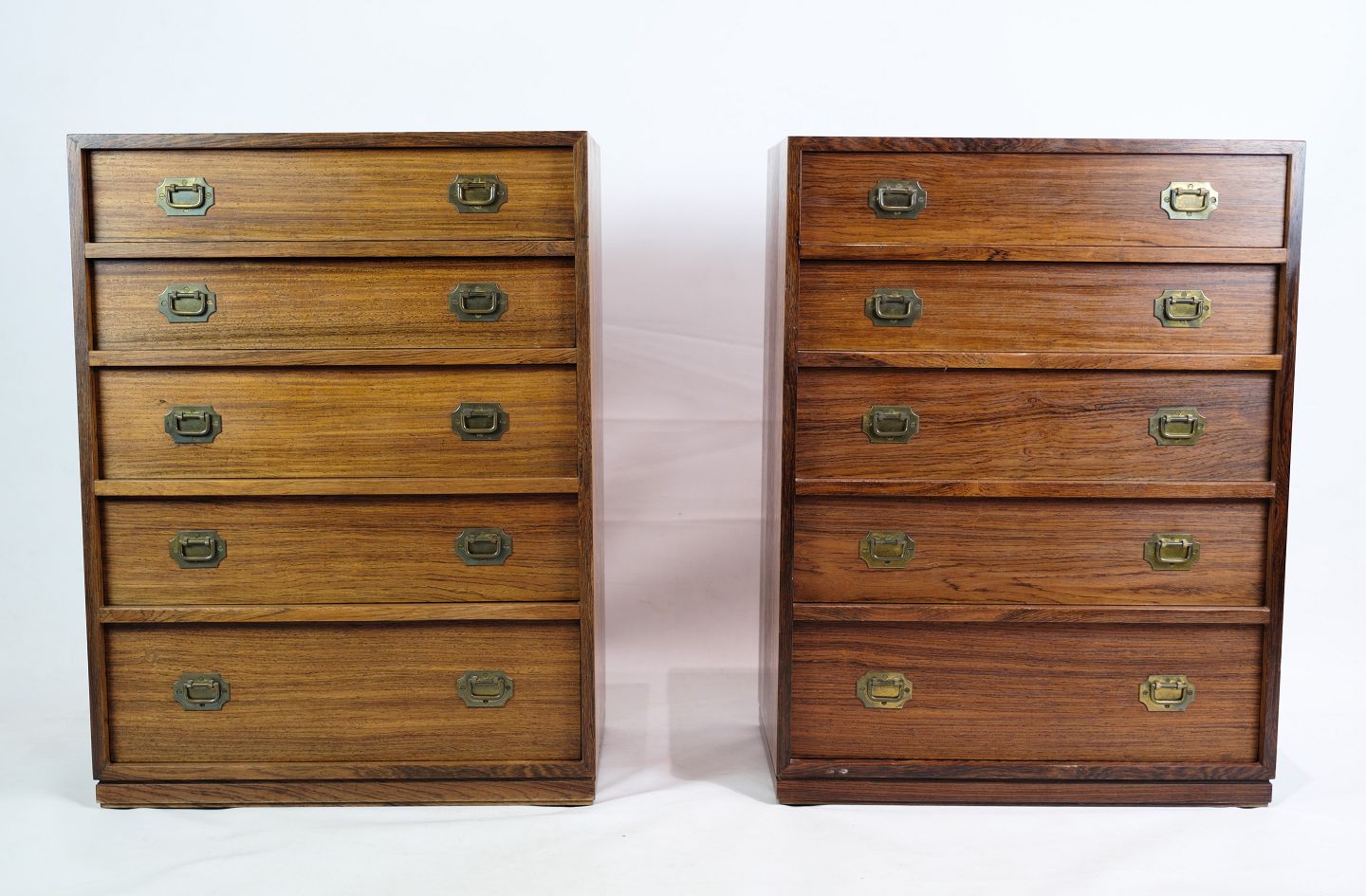 SolgtDette sæt af to kommoder, designet af Henning Korch, er fremstillet i palisandertræ og udgør en elegant og funktionel tilføjelse til ethvert rum. Hver kommode har fem rummelige skuffer med messinggreb, der tilføjer et subtilt touch af luksus til designet. Palisandertræets naturlige varme og smukke tekstur kombineres med den tidløse æstetik og håndværksmæssige kvalitet, som er karakteristisk for Henning Korch's designs. Fremstillet hos Silkeborg Møbelfabrik, er disse kommoder ikke kun smukke, men også holdbare og funktionelle, hvilket gør dem til en værdsat tilføjelse til enhver indretning.