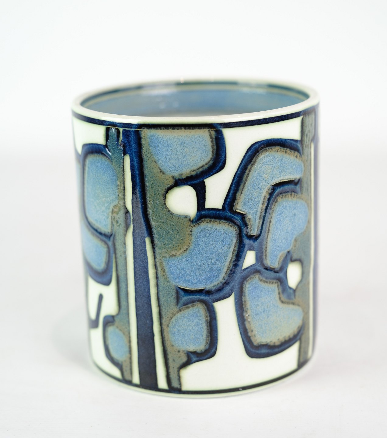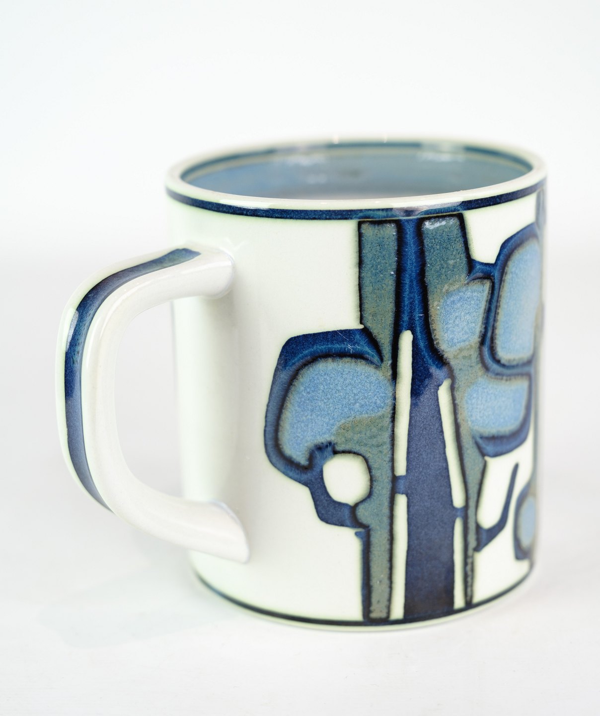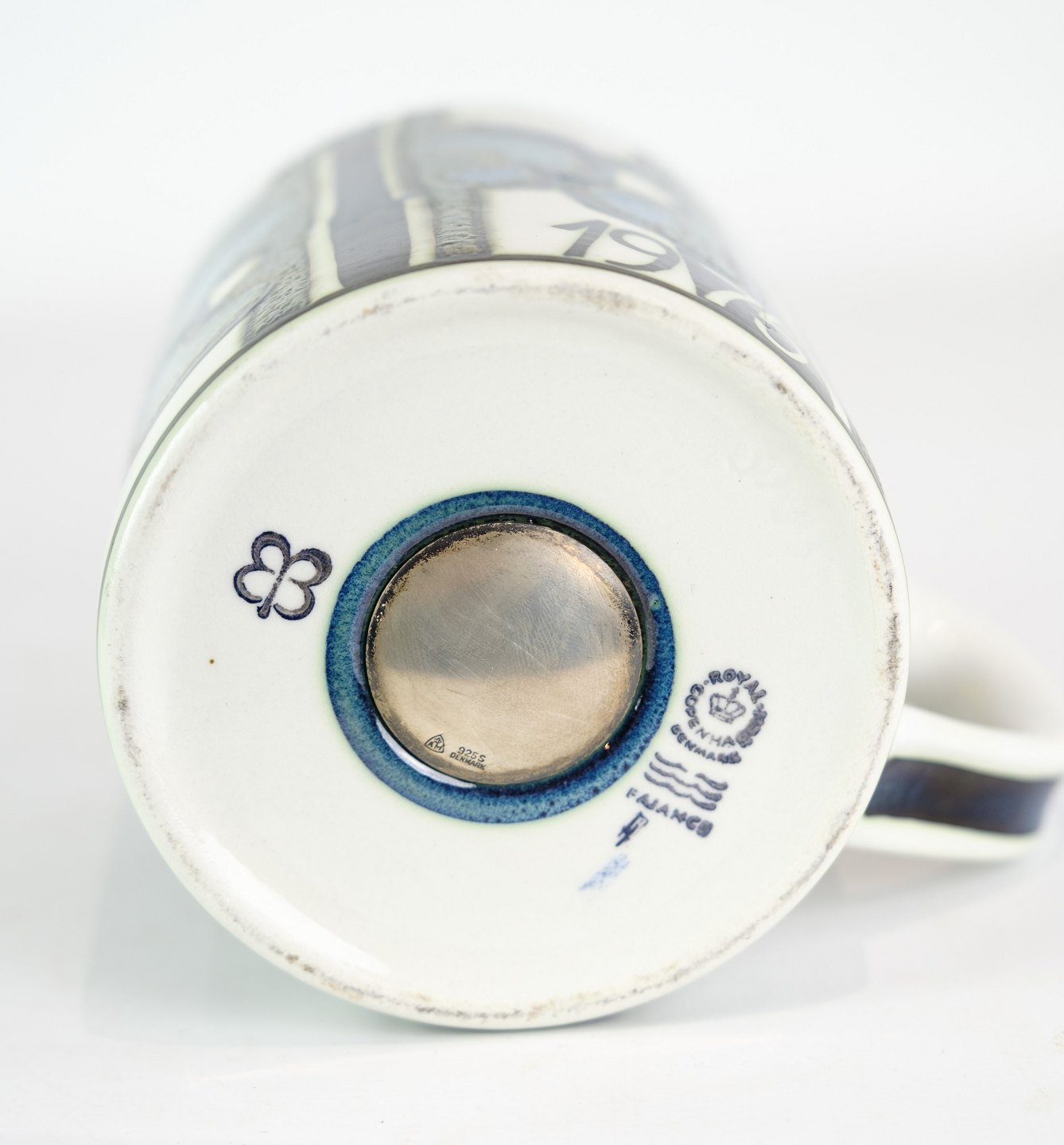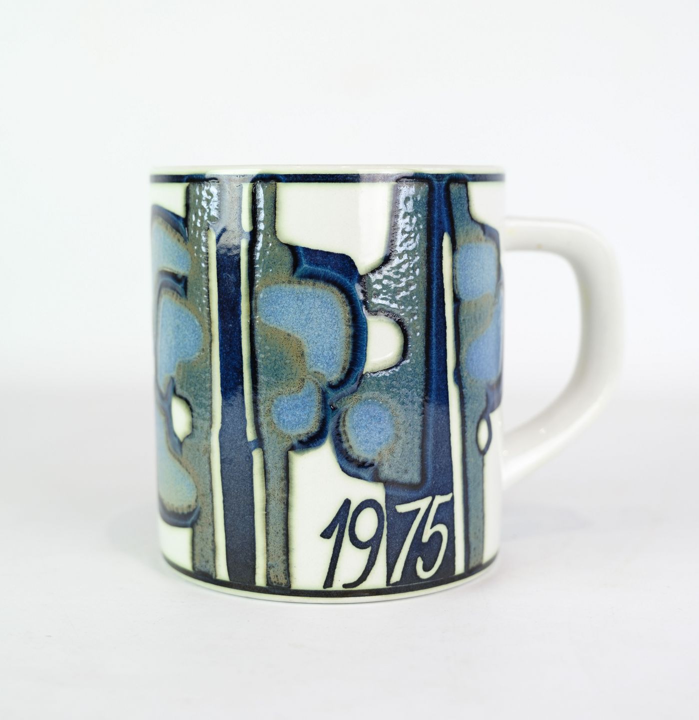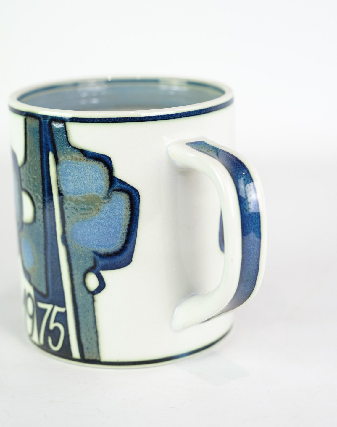 Årskrus, årgang 1975, designet af Bodil Buch for Royal Copenhagen udført i fajance med hvide og blå nuancer.