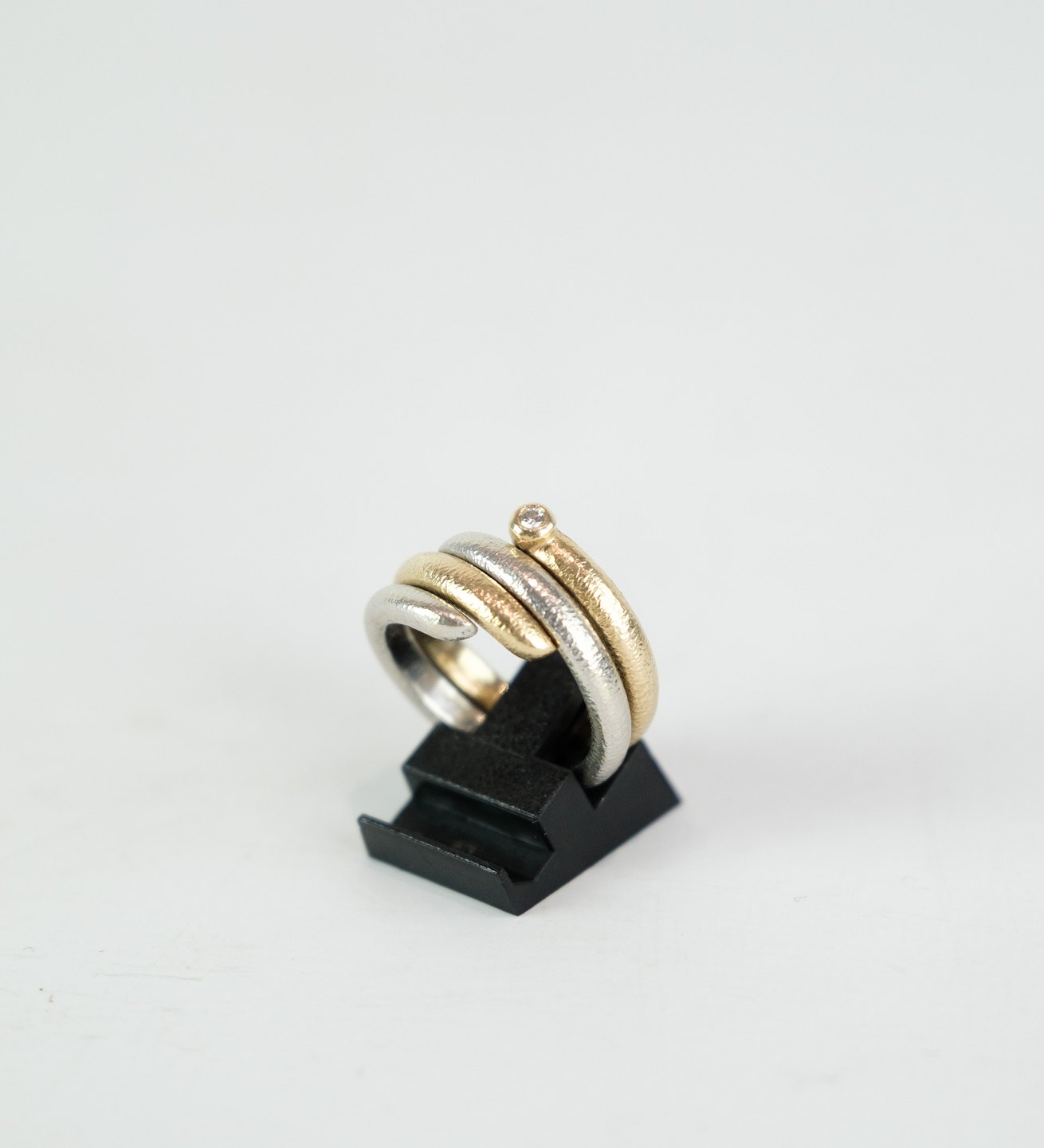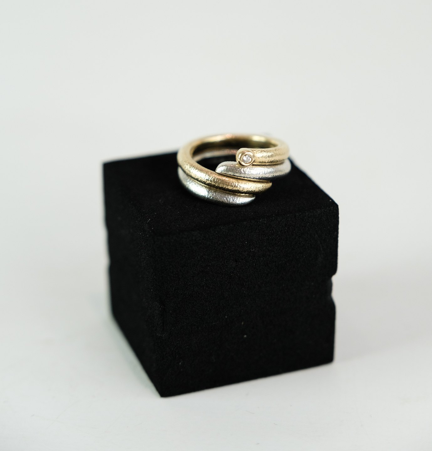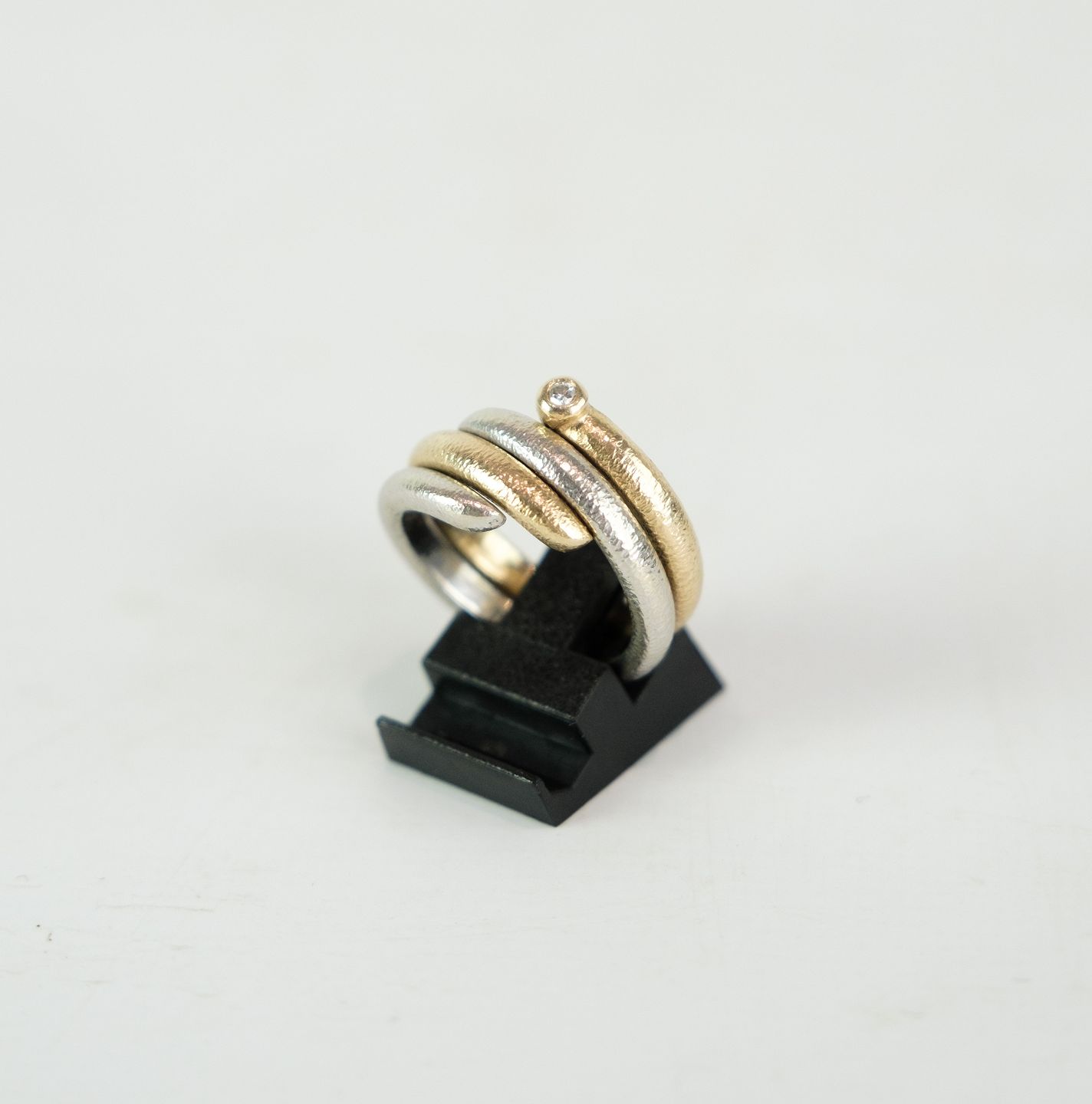 SoldTwo in a ring of 14 carat red and white gold. The ring with red gold has a beautiful diamond 0.04 carat. With a nice raw rustic surface. Stands in very fine condition both.