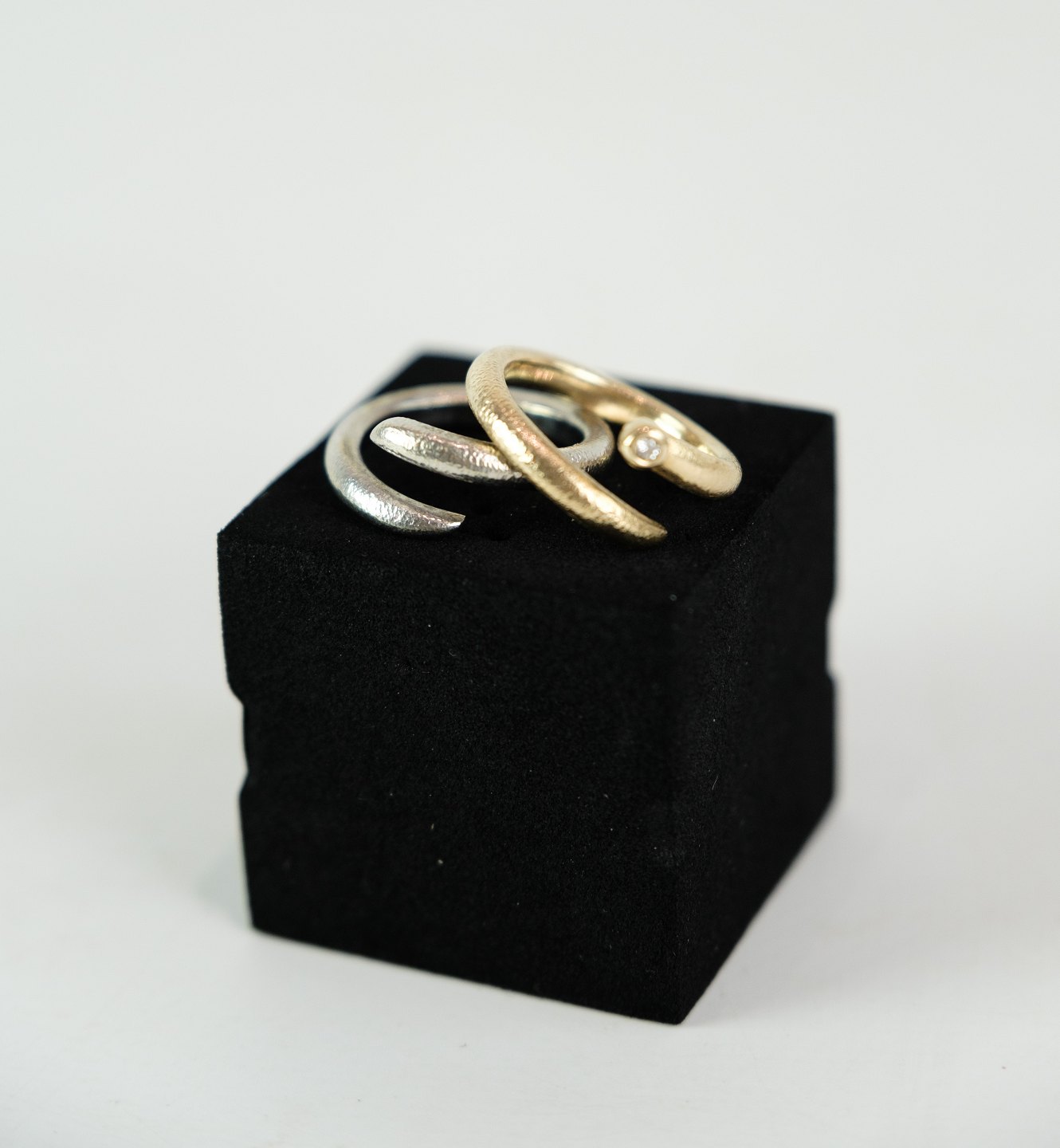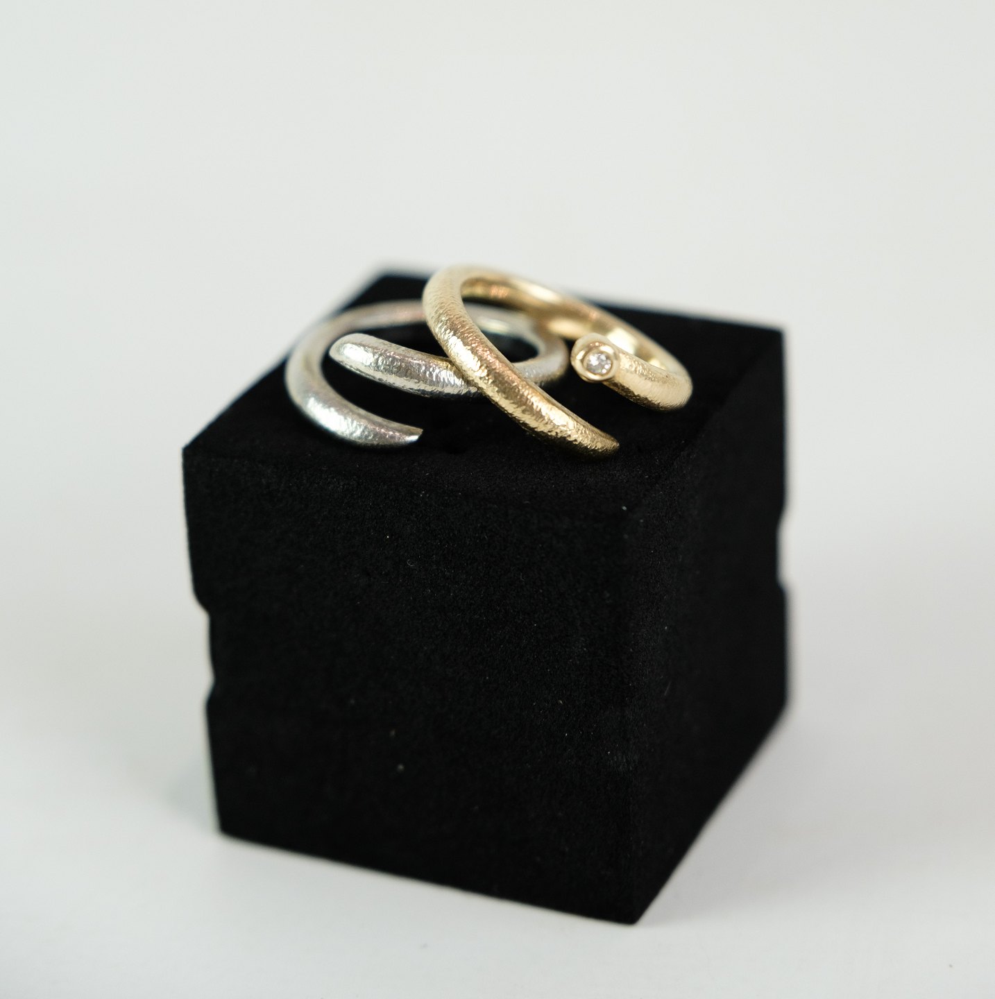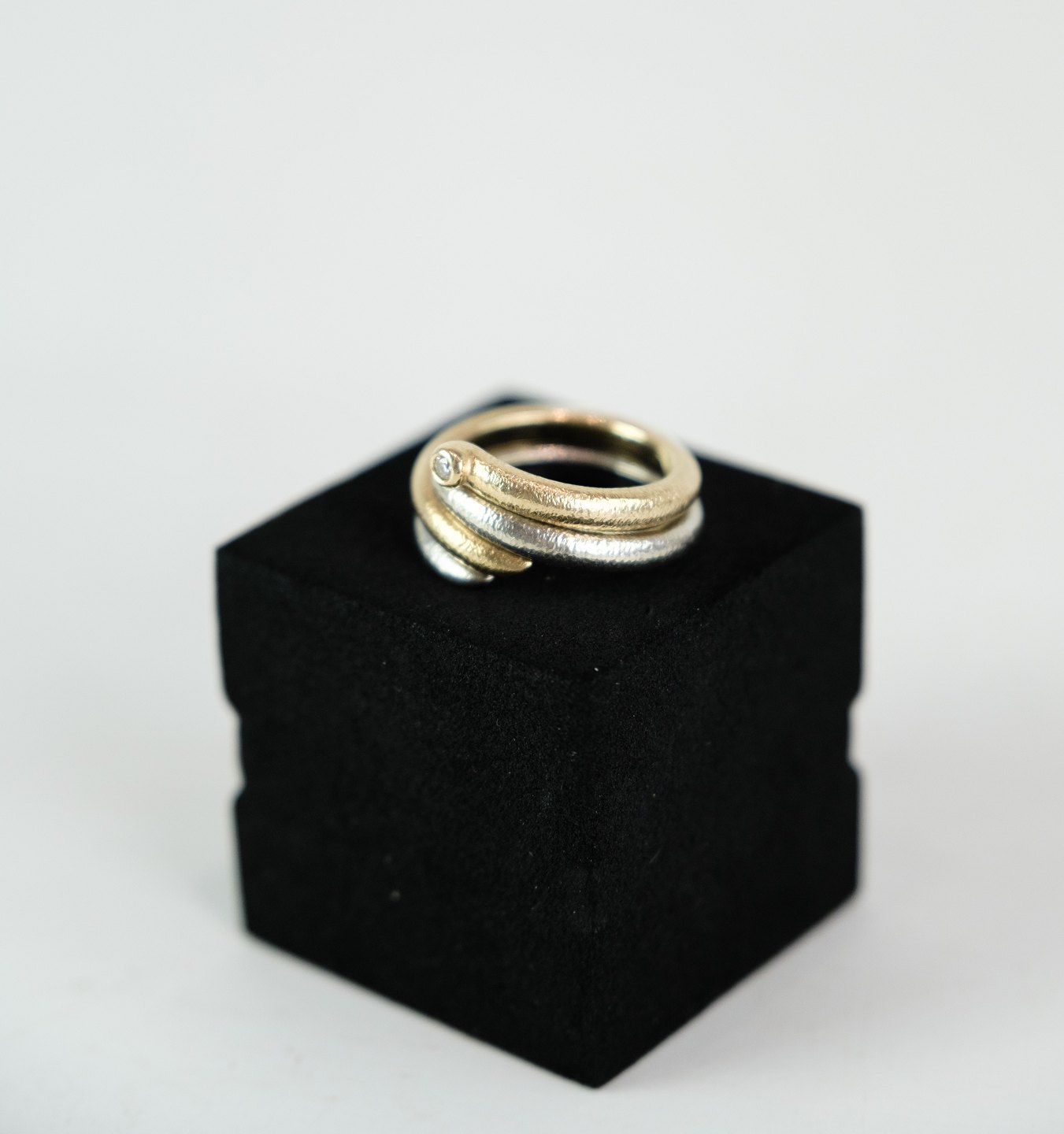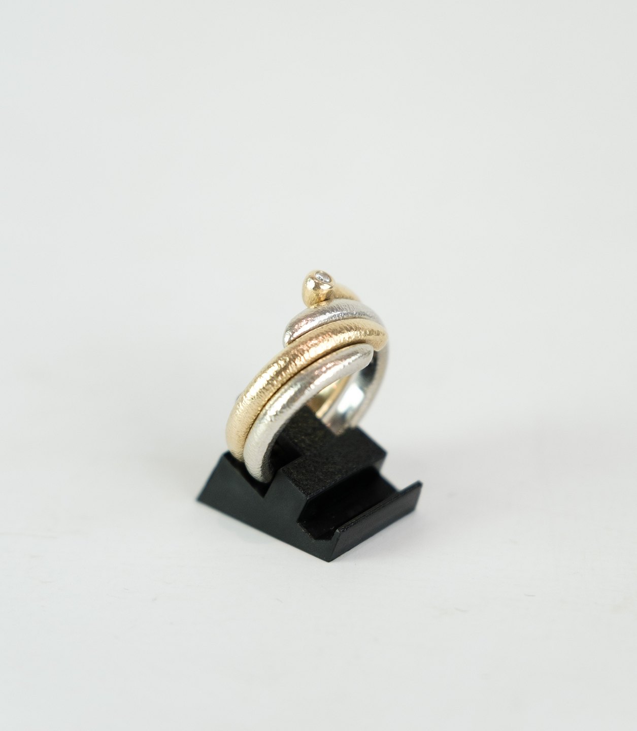 SoldTwo in a ring of 14 carat red and white gold. The ring with red gold has a beautiful diamond 0.04 carat. With a nice raw rustic surface. Stands in very fine condition both.