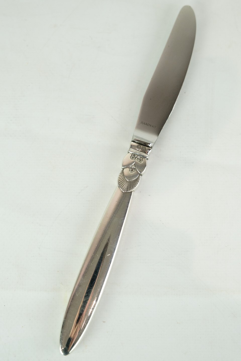 This Kaktus dinner knife is a beautiful and functional addition to your dining table. Designed by Gundorph Albertus in 1930 and produced by Georg Jensen Sølvsmedie in Denmark, this knife is marked with the well-known Cactus pattern. Although in a nice used condition with normal signs of use, it will still bring a touch of elegance to your next dinner. Our stock is limited, so please inquire about available quantities.