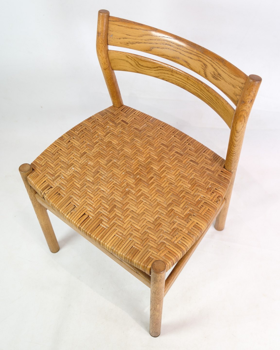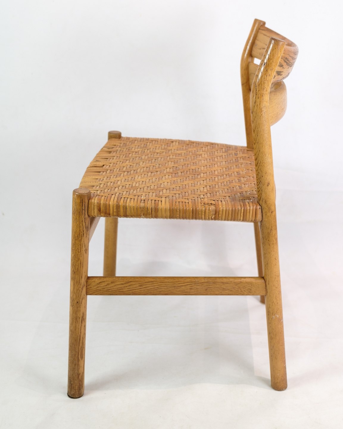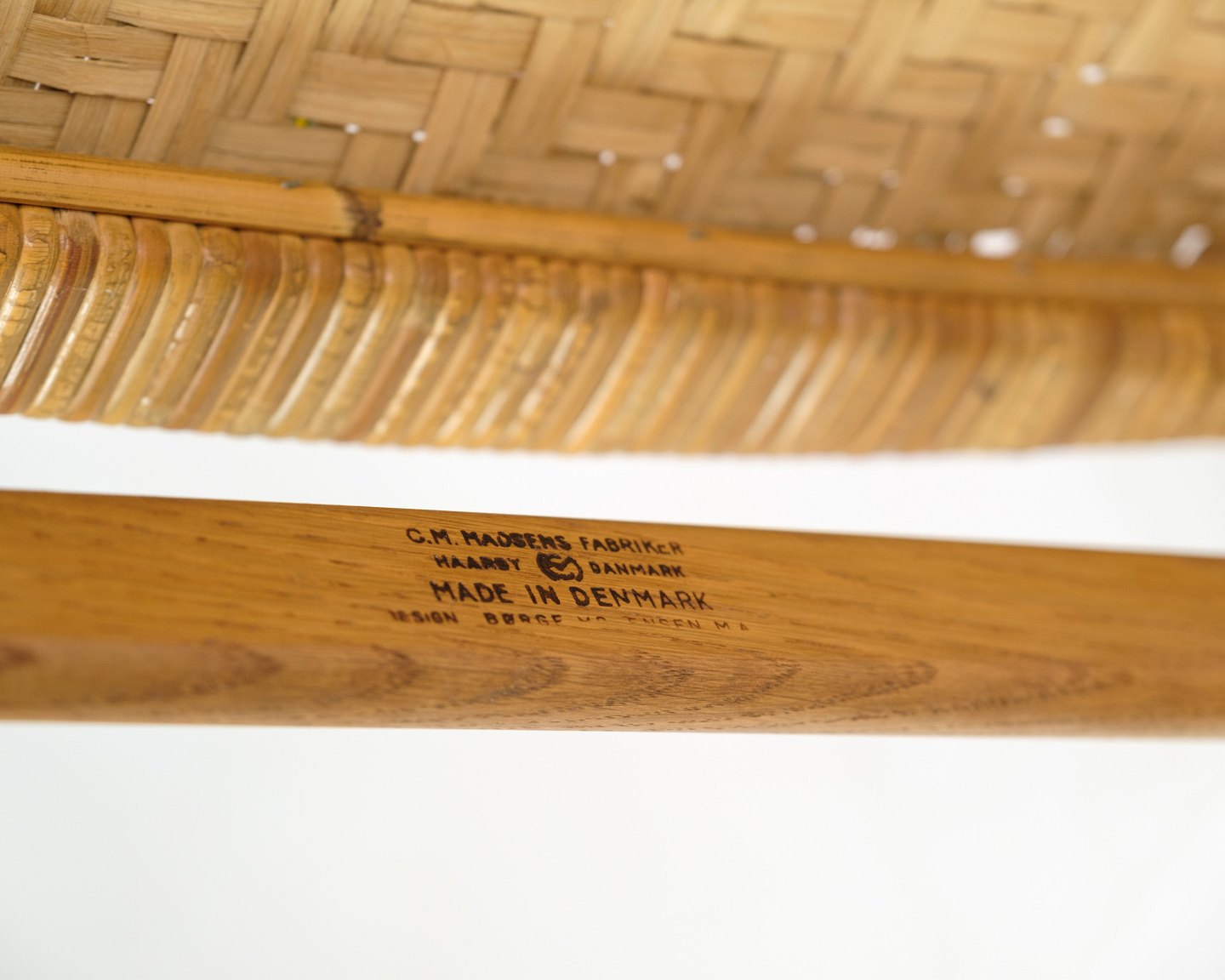 SoldSet of four dining chairs in oak and seat in wicker, designed by Børge Mogensen and produced by C.M Madsen Møbelfabrik in the 1960s. The chairs are in nice vintage condition. Their simple and timeless design makes them suitable for a range of interior styles and will fit into any dining room environment