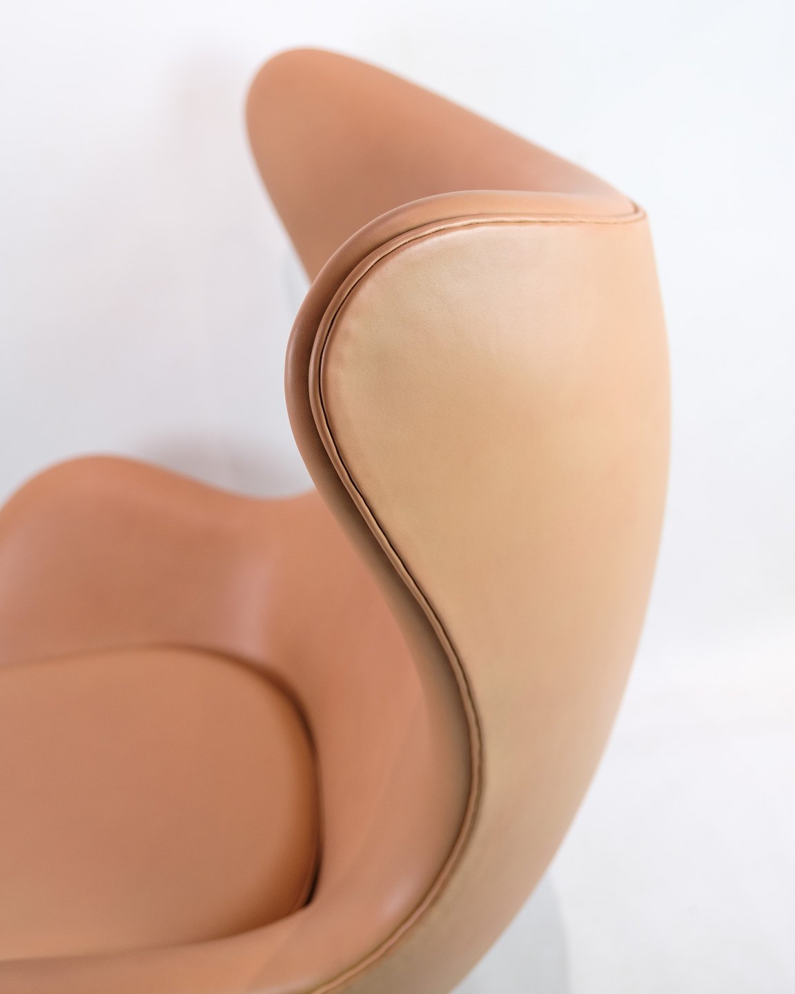 The chair is upholstered in cream-coloured elegance leather, which gives a warm and beautiful look to the chair's simple and organically inspired design. The shape of the chair is ergonomic and follows the curves of the body, which provides a comfortable sitting experience.