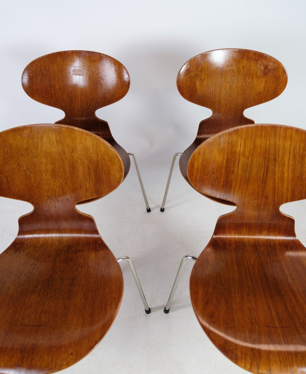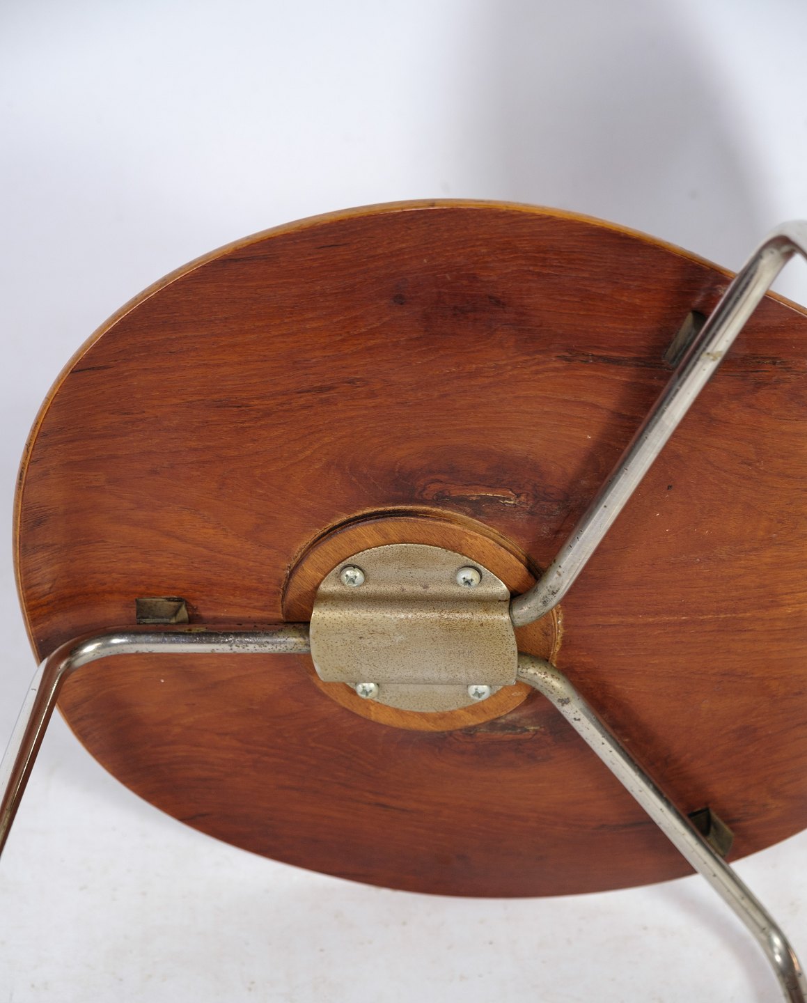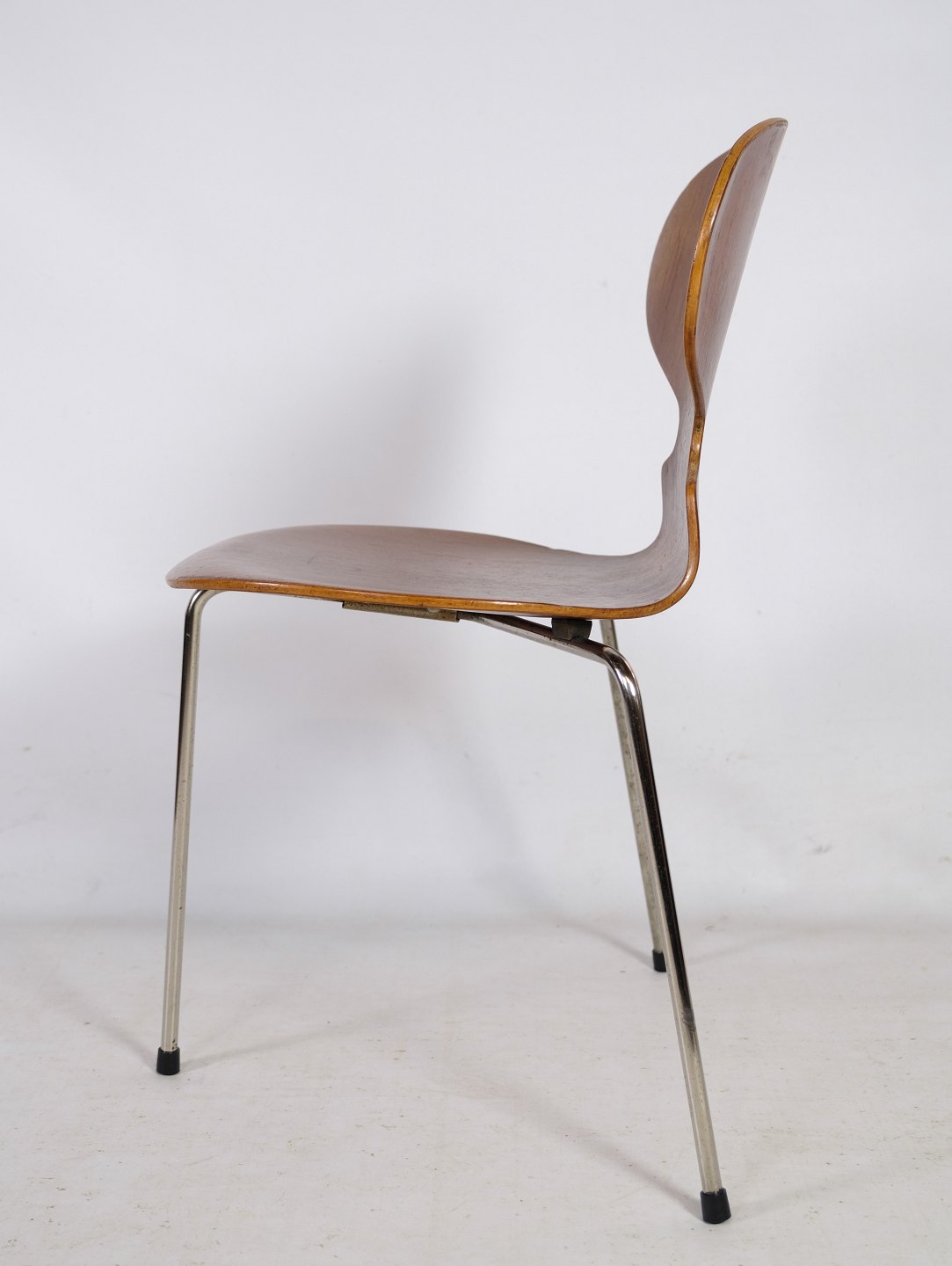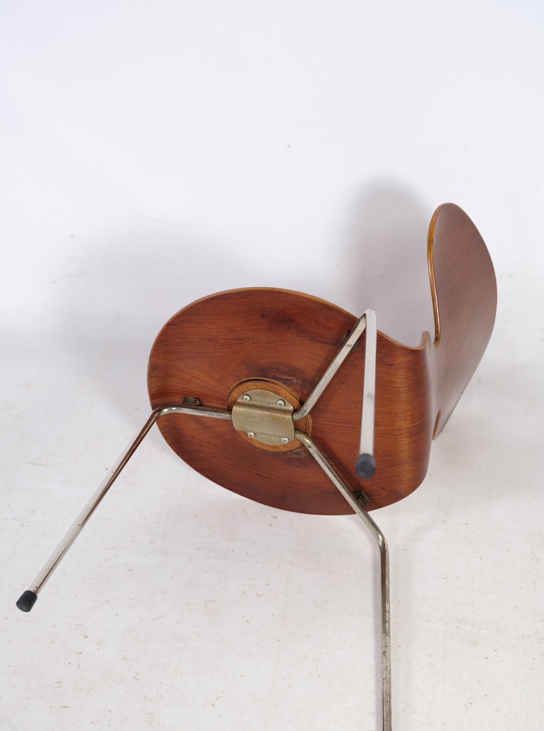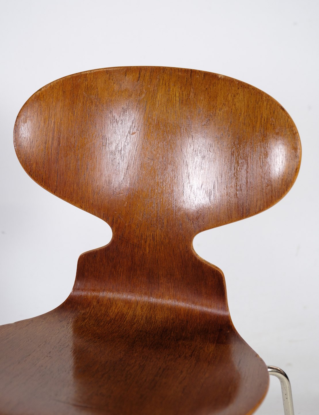 This model is made of teak wood, which is a rarer and more sought after variant than the more common beech wood model. The chair is original and has a nice patina that shows its age and history. The Myren chair's unique shape and minimalist design make it suitable for many different types of interiors and rooms.