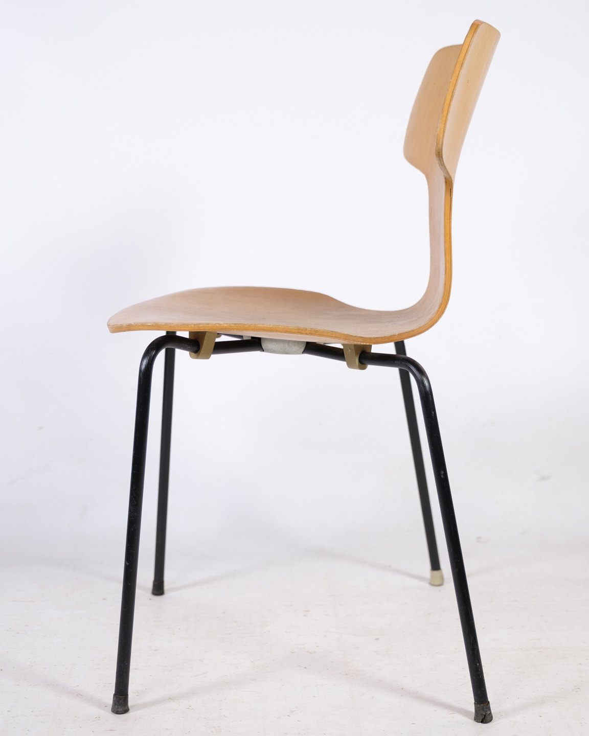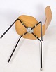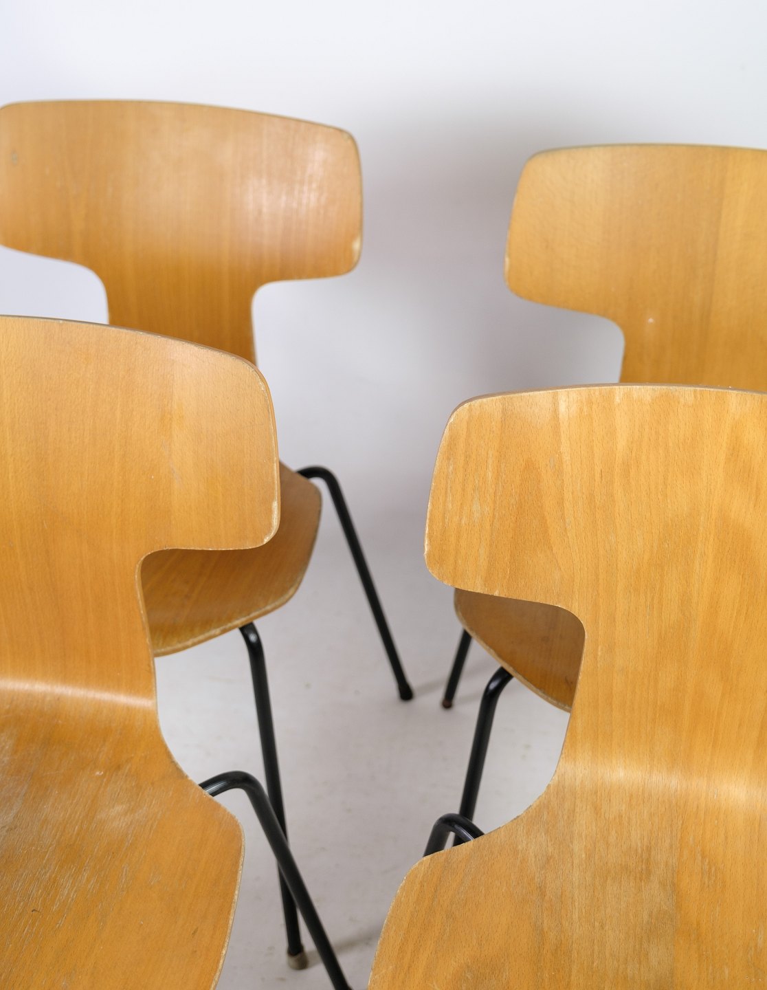 Sæt af fire, model 3103, 'T-stol', af Arne Jacobsen 1902-1971 med skal af formbøjet finéret egetræ, stel af sort rillet gummi-omviklet stålrør. Fremstillet hos Fritz Hansen, 1960erne. tidlig model. Fremstår med brugsspor, mærker, kantslid. Kan laves i værksted inden køb. Send os en besked. Flere sæt på lager