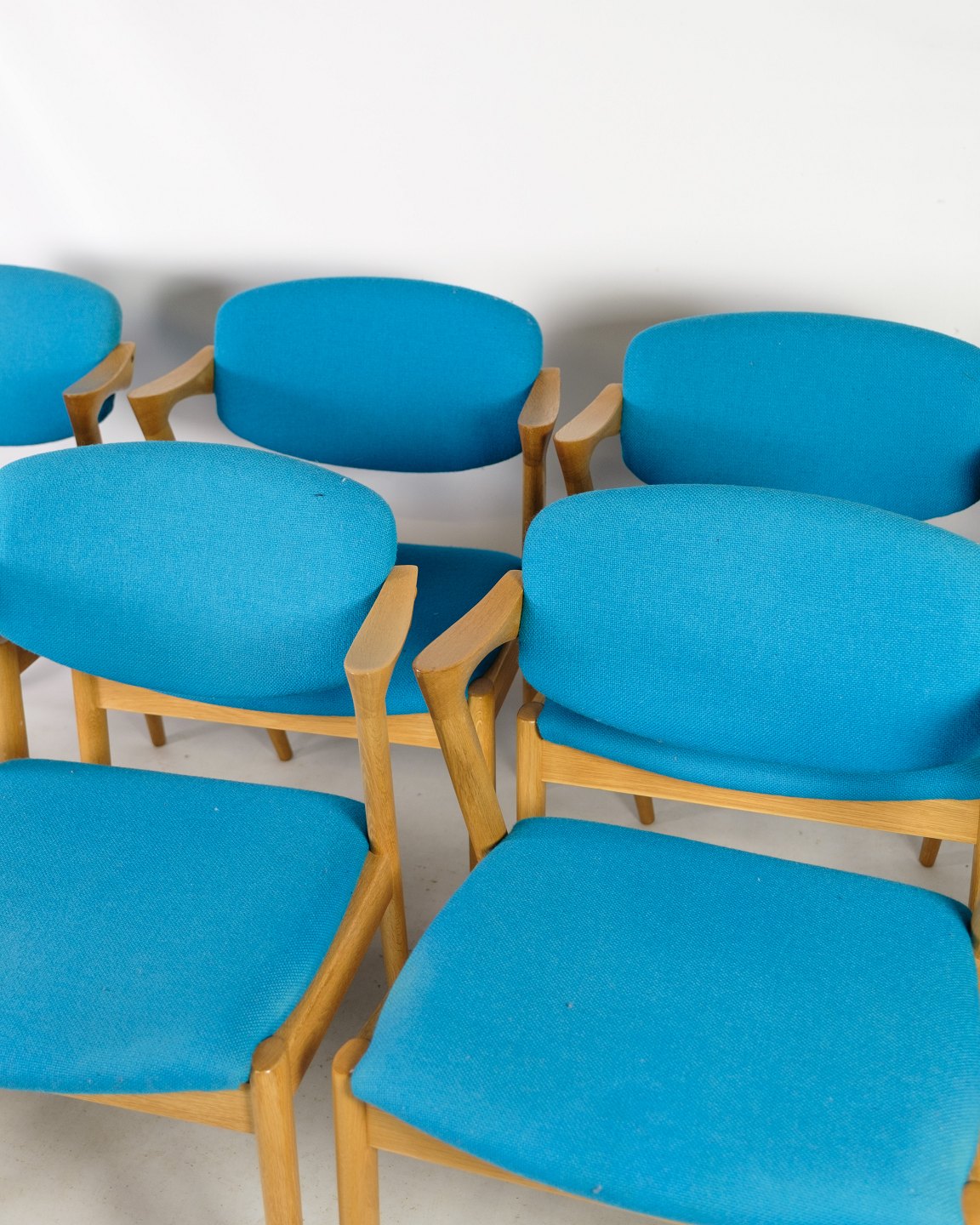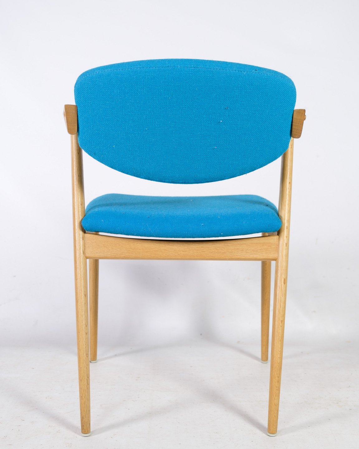 The chairs have a classic and minimalist design with an organic shape that is both comfortable and aesthetically pleasing. The seat is upholstered in blue fabric, which adds an extra dimension of elegance and luxury, while the legs are made of oak.