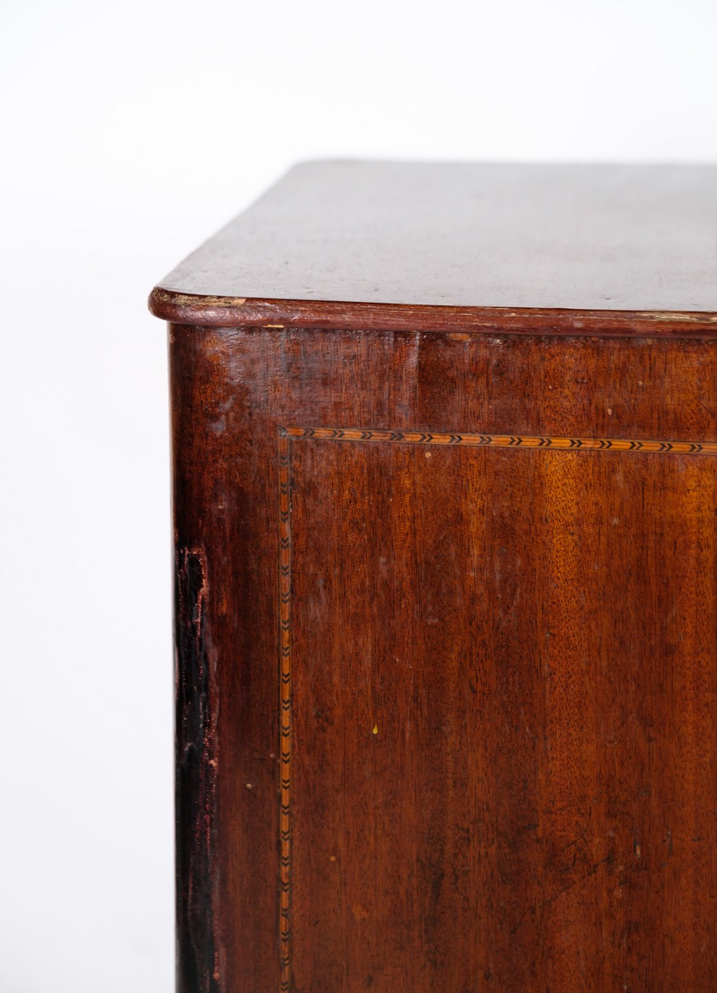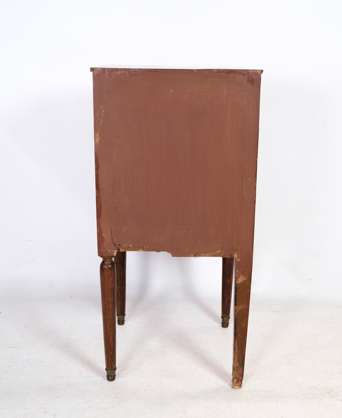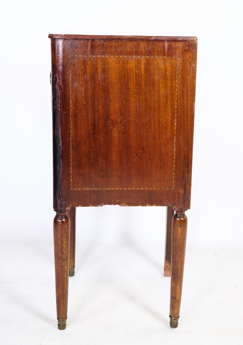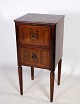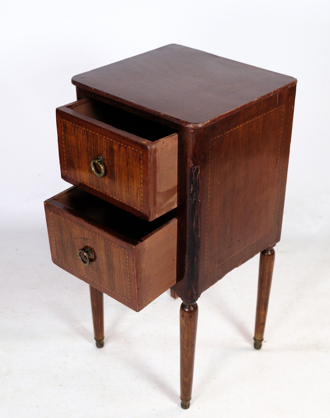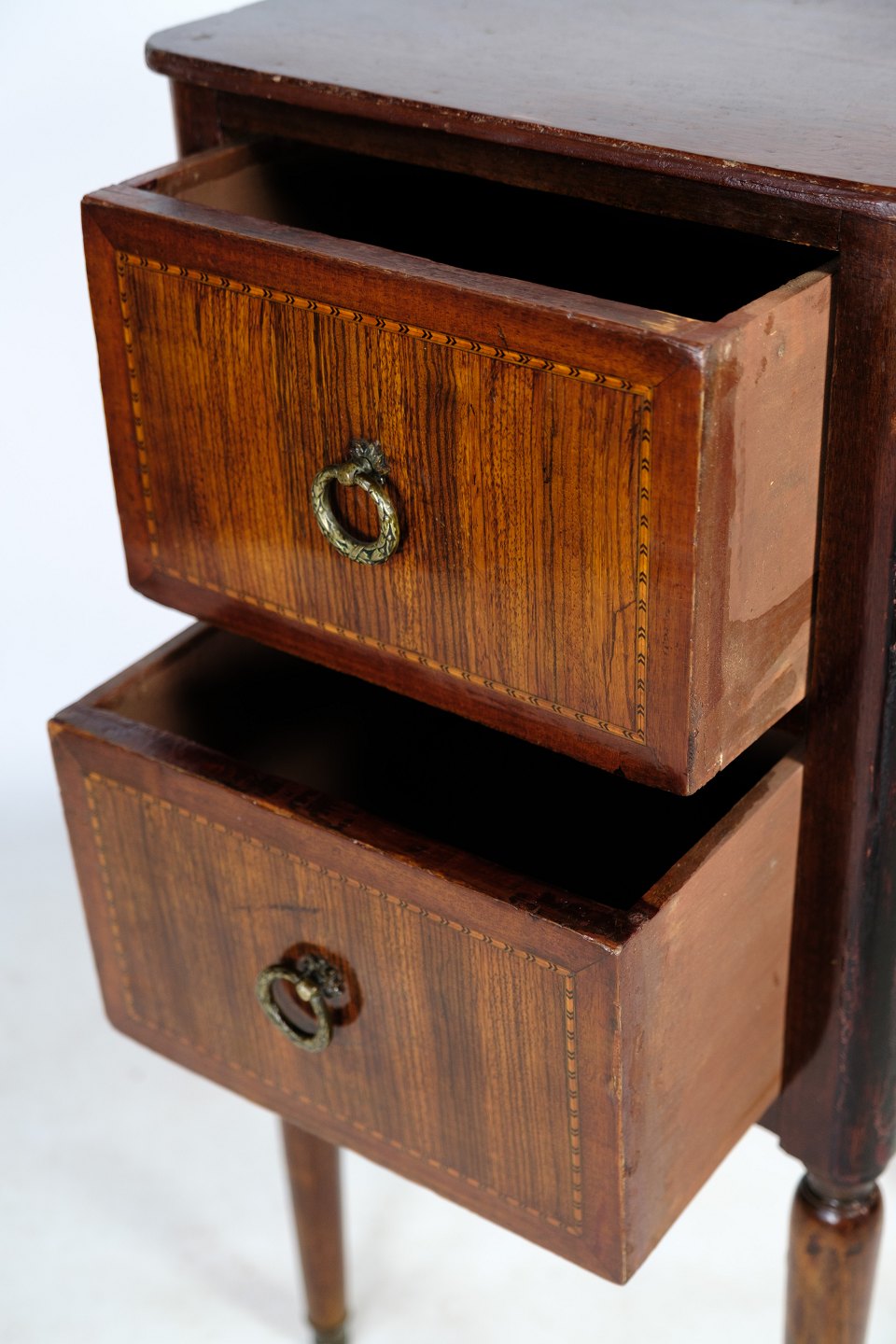 Mahogany side table with walnut marquetry with two drawers with original brass handles from 1860.
