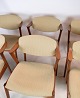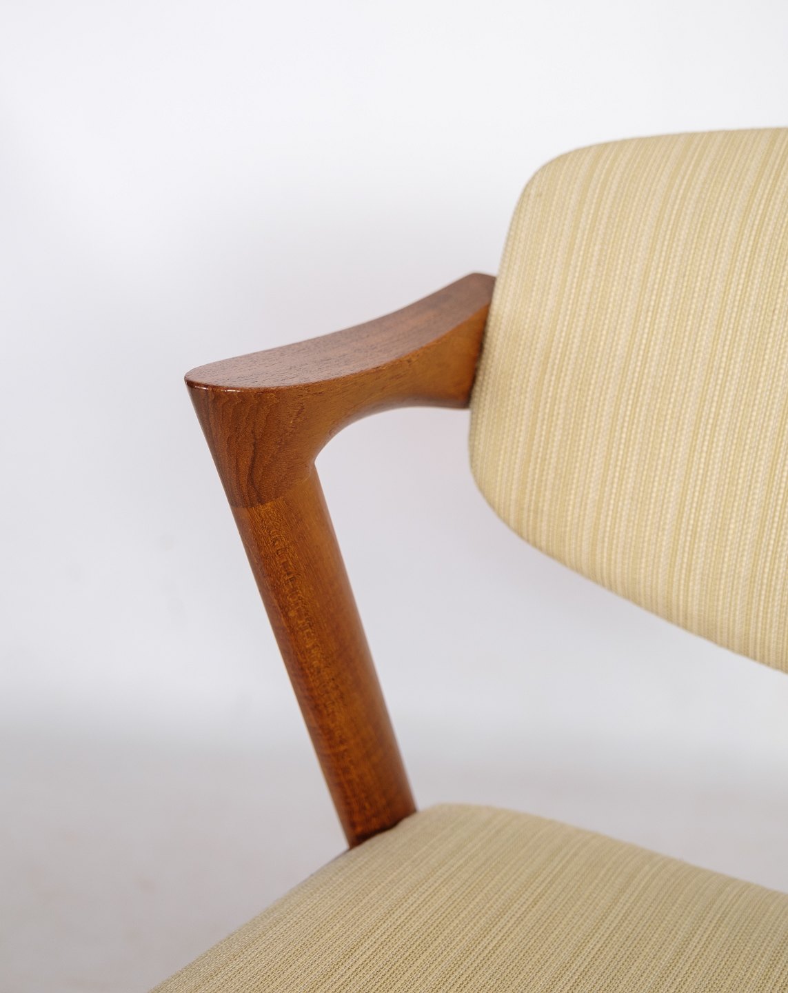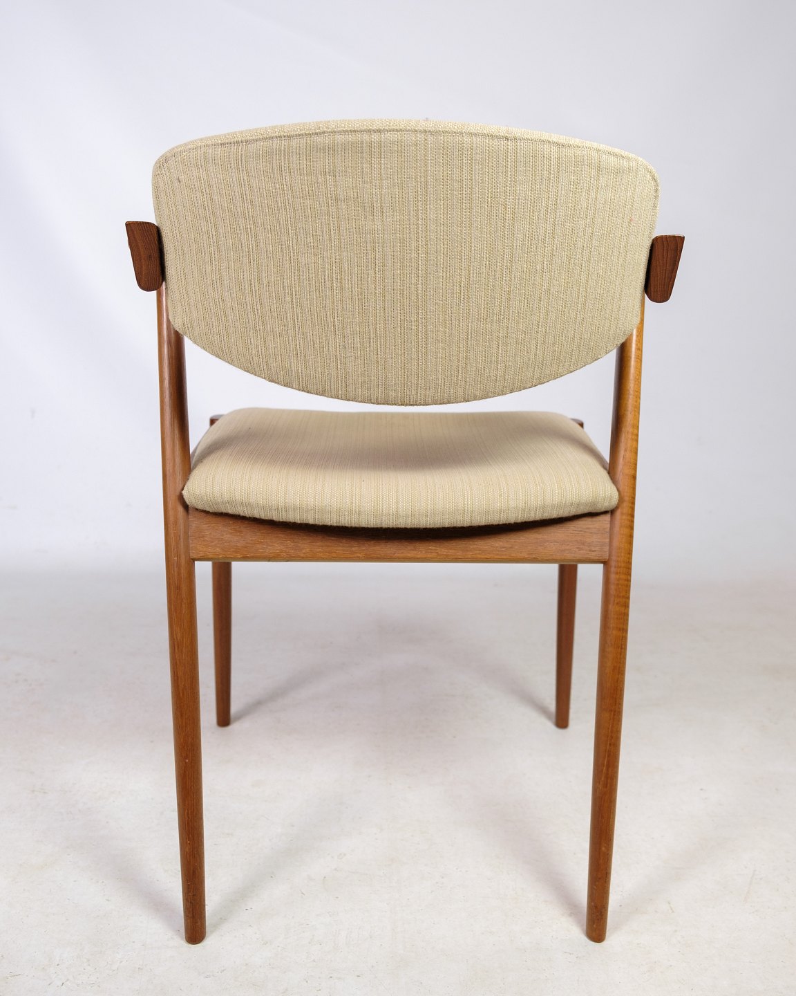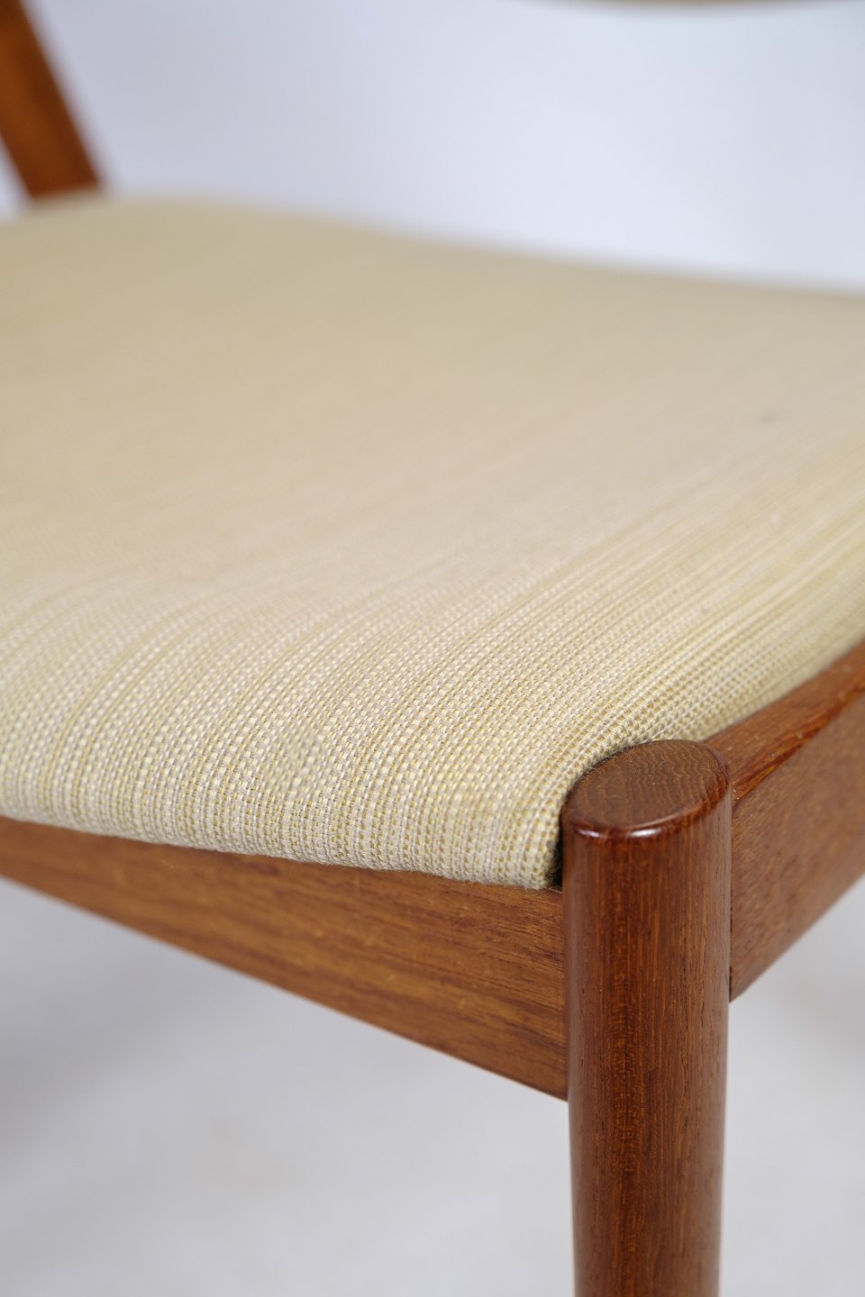 The chairs have a classic and minimalist design with an organic shape that is both comfortable and aesthetically pleasing. The seat is upholstered in light fabric, which adds an extra dimension of elegance and luxury, while the frame is made of teak wood, which provides a warm and natural contrast.