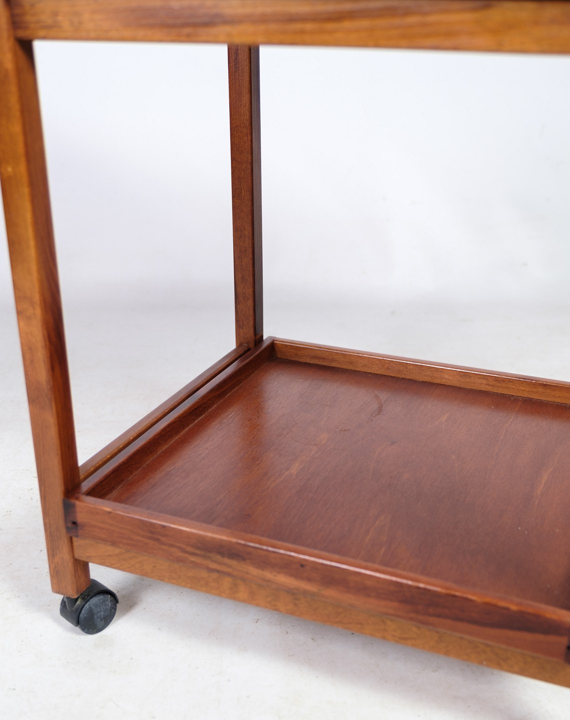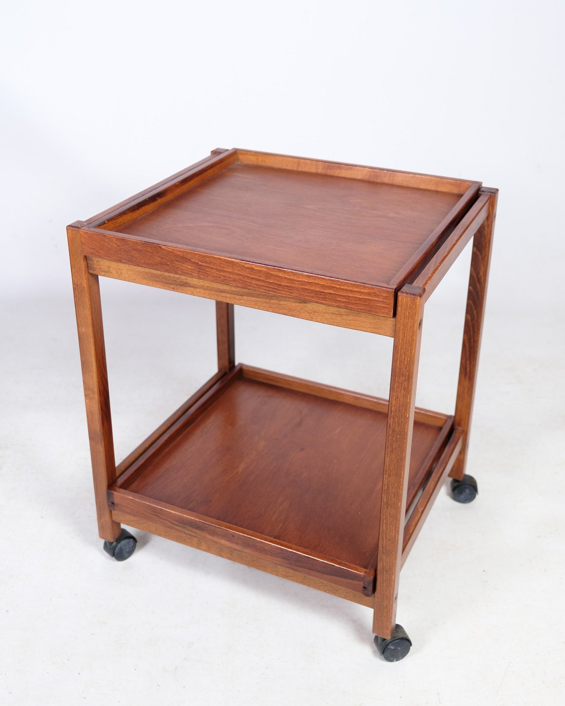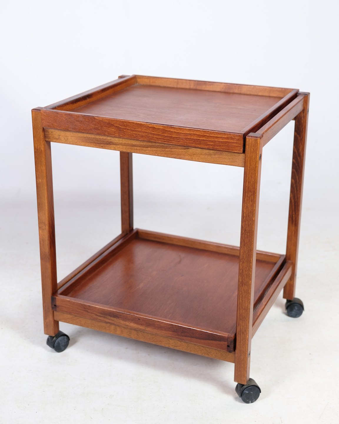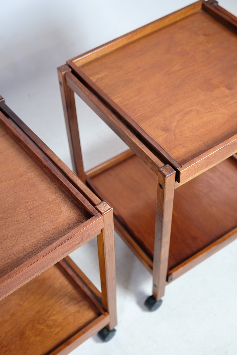 Small round coffee tables with 4 wheels and a serving tray both above and below made in walnut from around the 1960s.