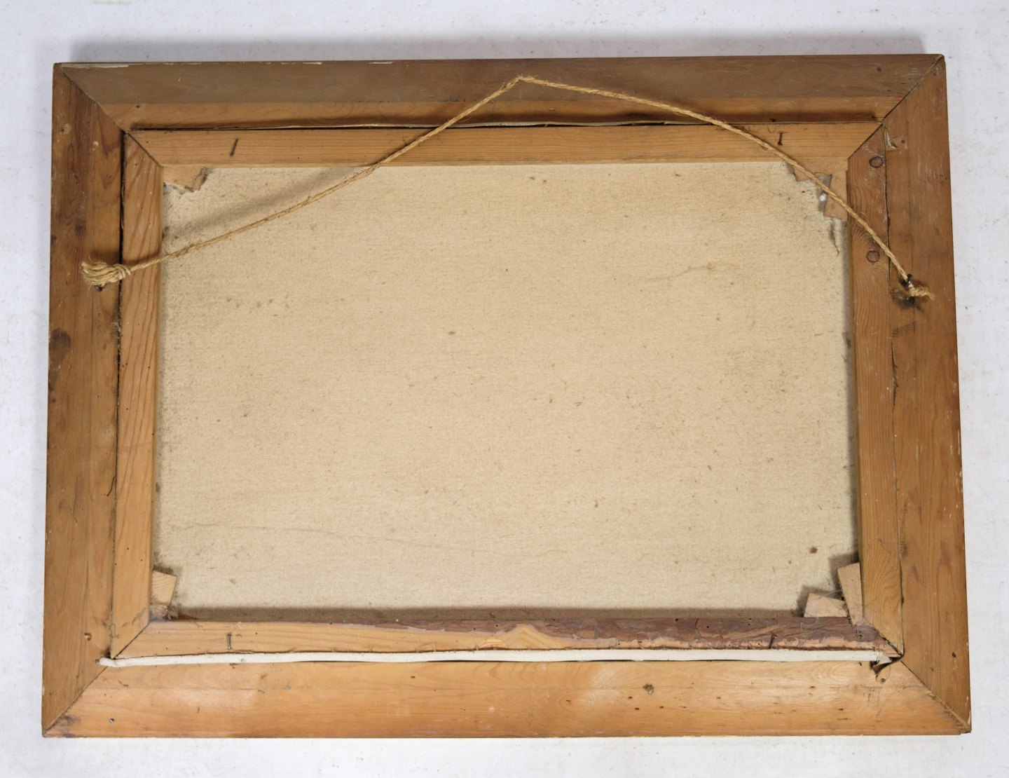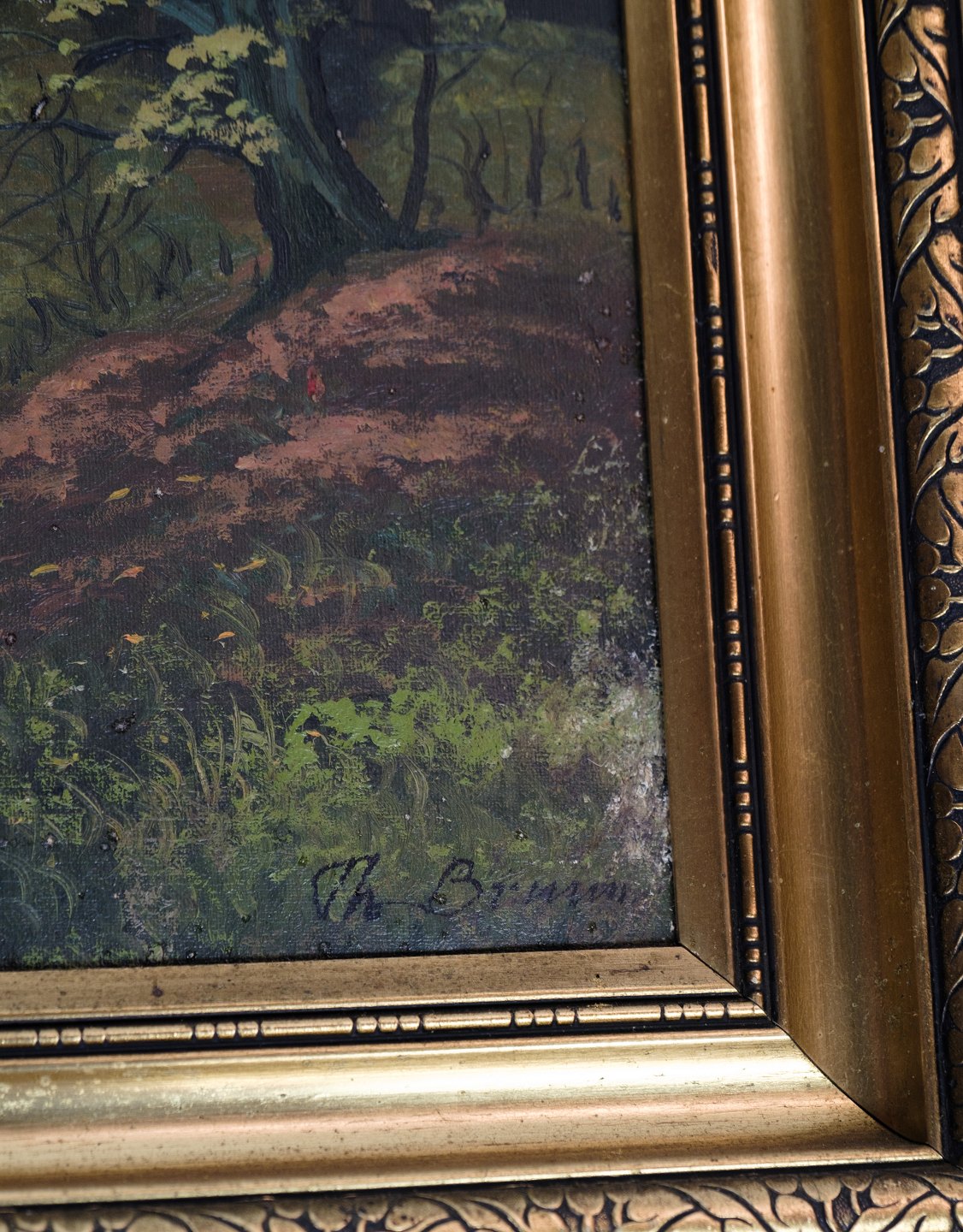 Painting on canvas in gold frame of lake and forest from around the 1930s. Signed Th Brammer