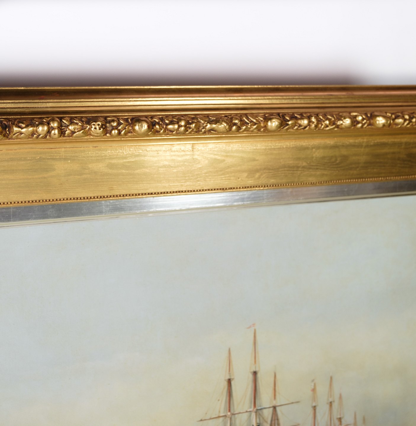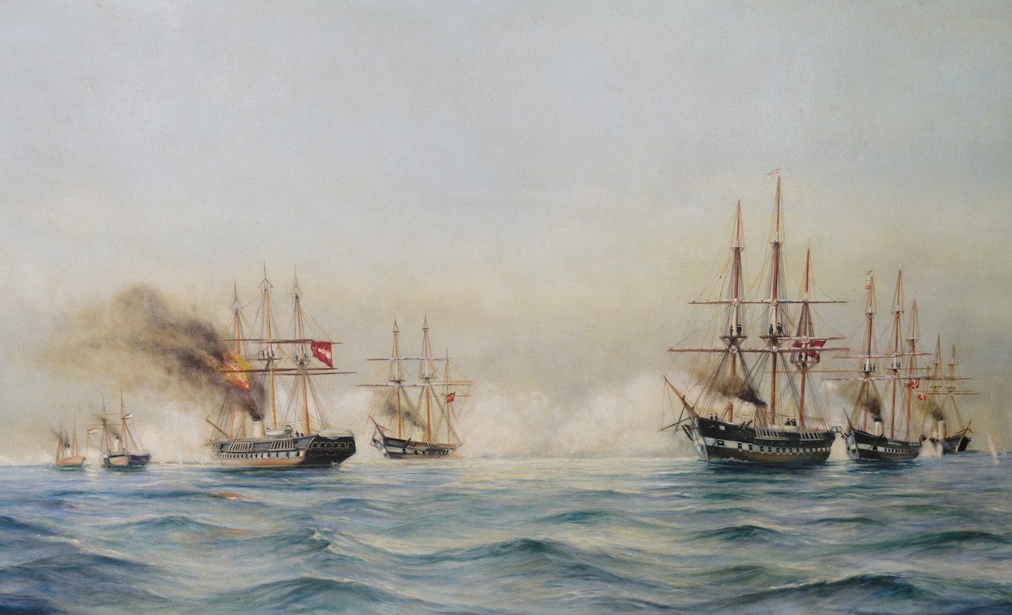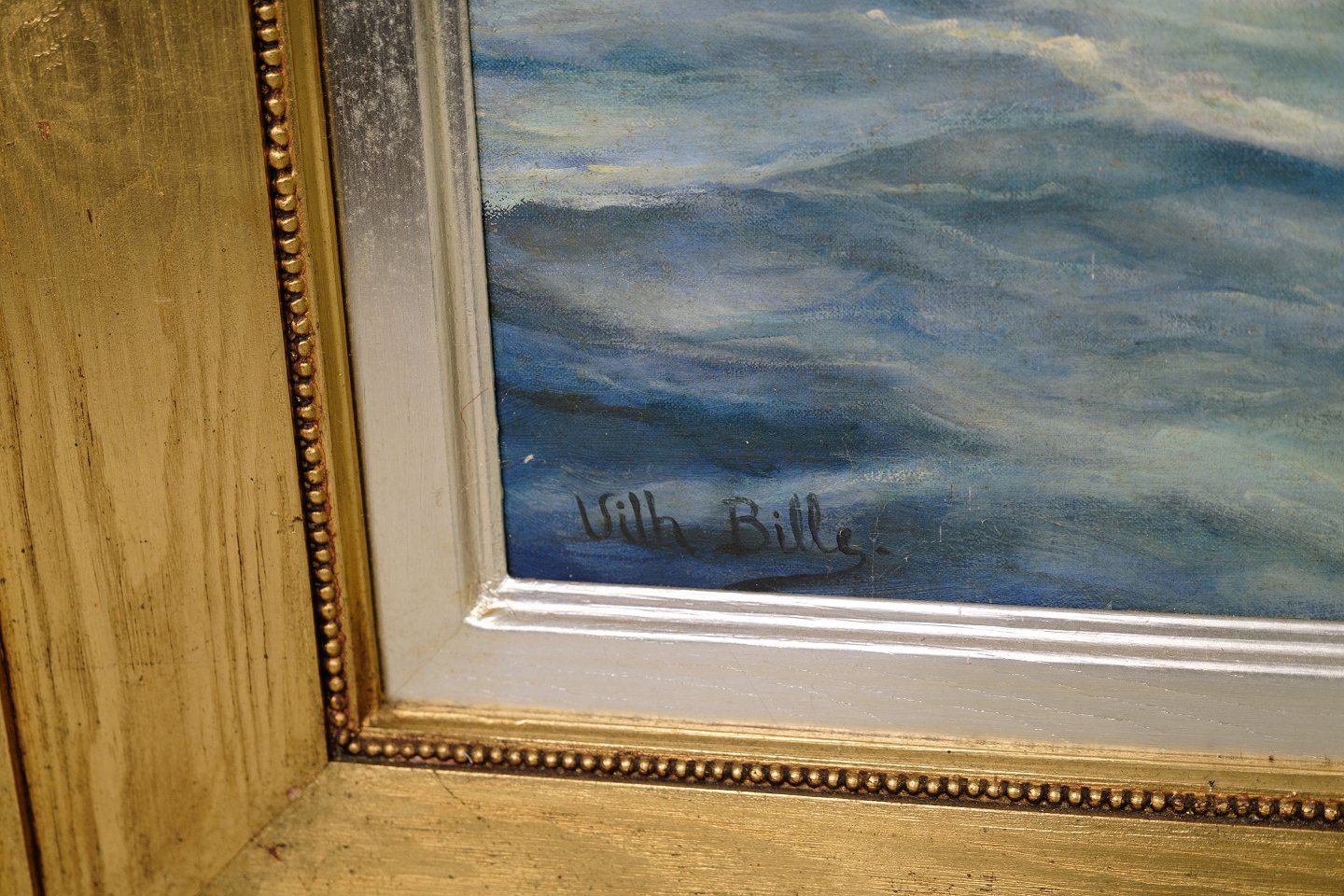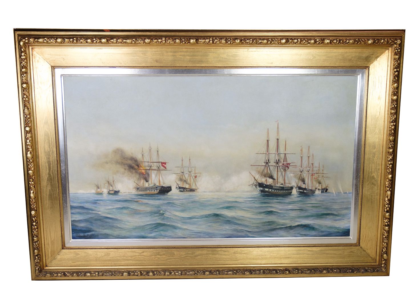 SoldShip painting by Bille, Vilhelm Victor, 1864-1908, marine painter with the motif of "The Battle of Helgoland in 1864". Parents: Marine painter Carl Ludvig B. and Antoinette Emmaline Bonfils, and pupil of the father; must have visited Kunstakad for a short time. Kbh. From the quality of the painting, it looks like something Bille did towards the end of his career as a marine painter. A painting of very high quality and detail with extraordinary technique.