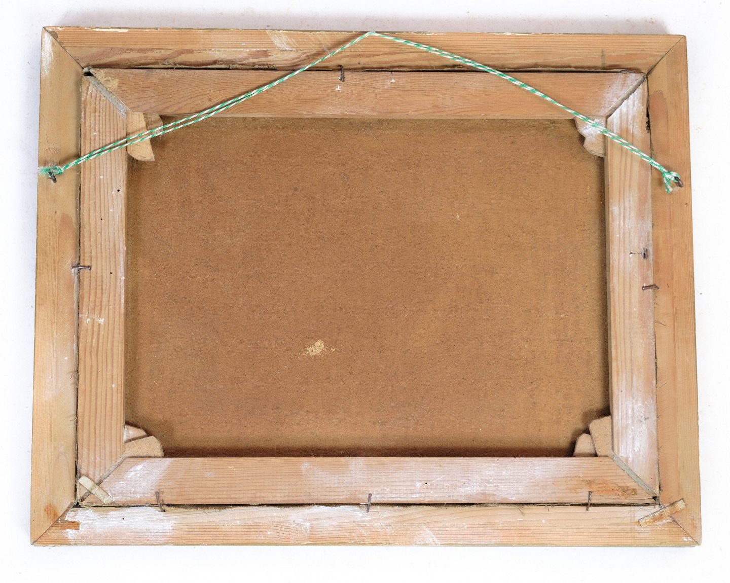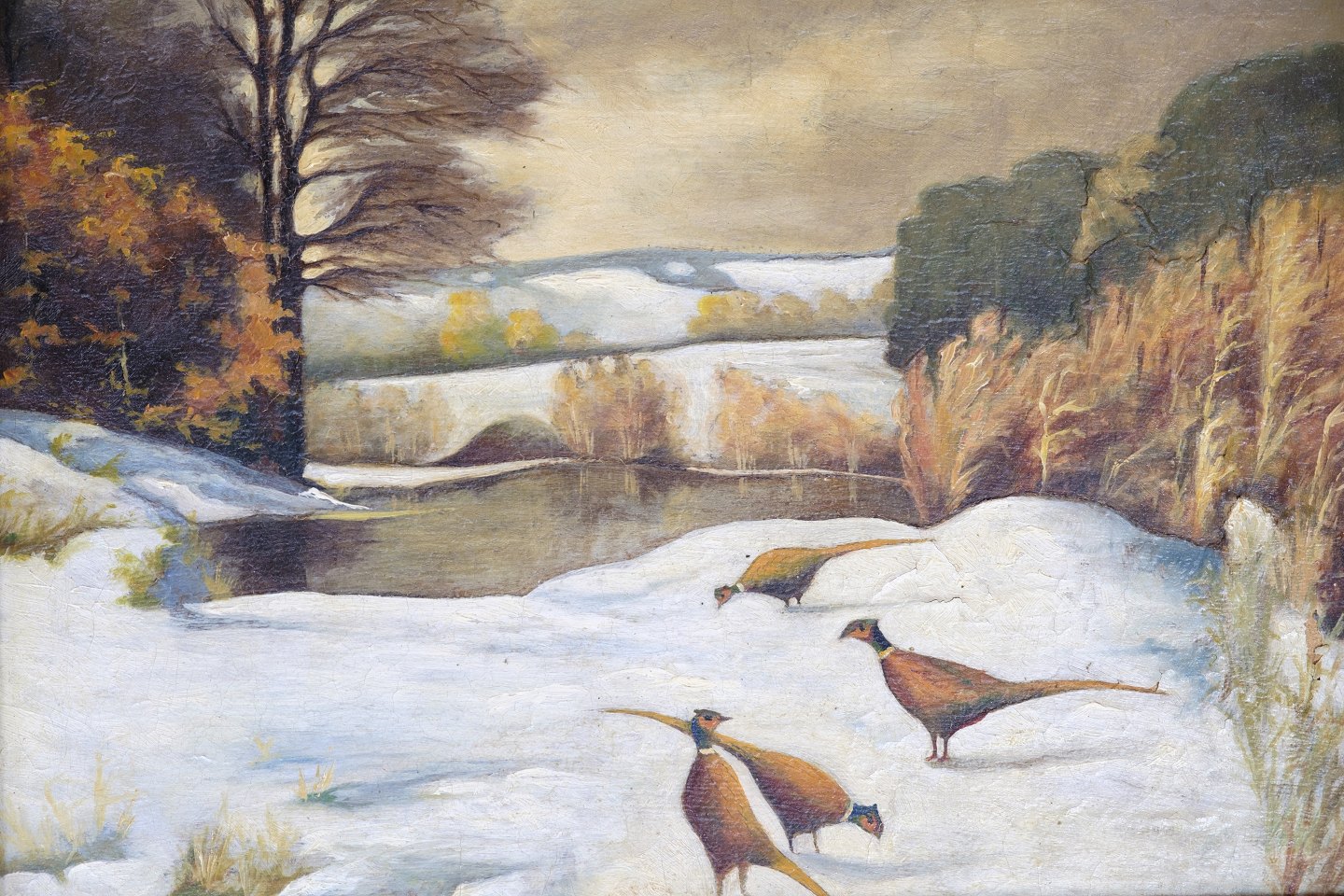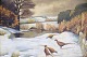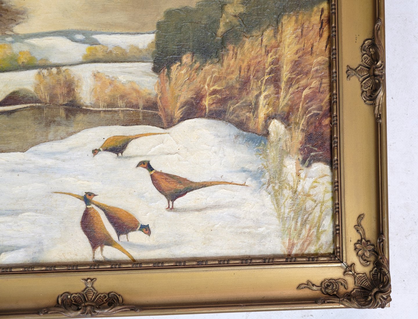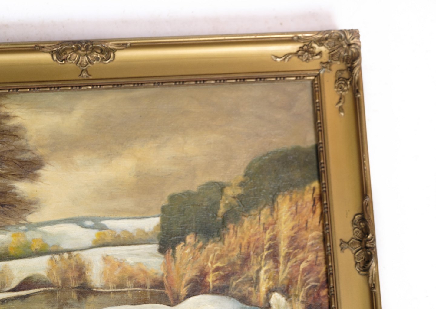 Painting on canvas in antique frame of small houses and landscape with snow from around the 1930s