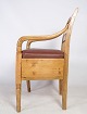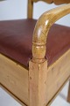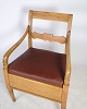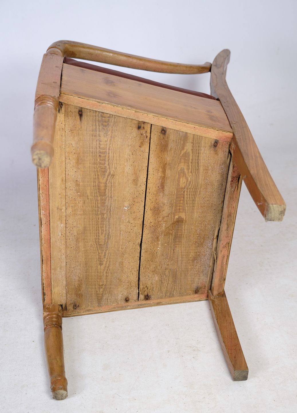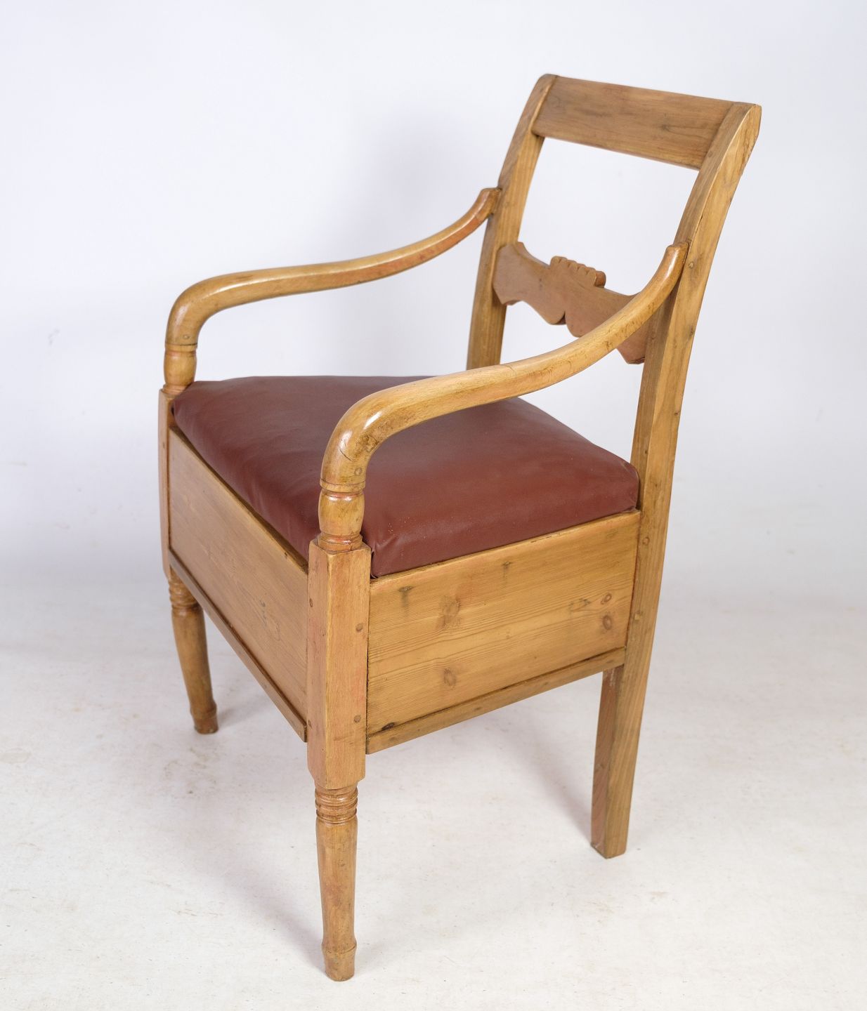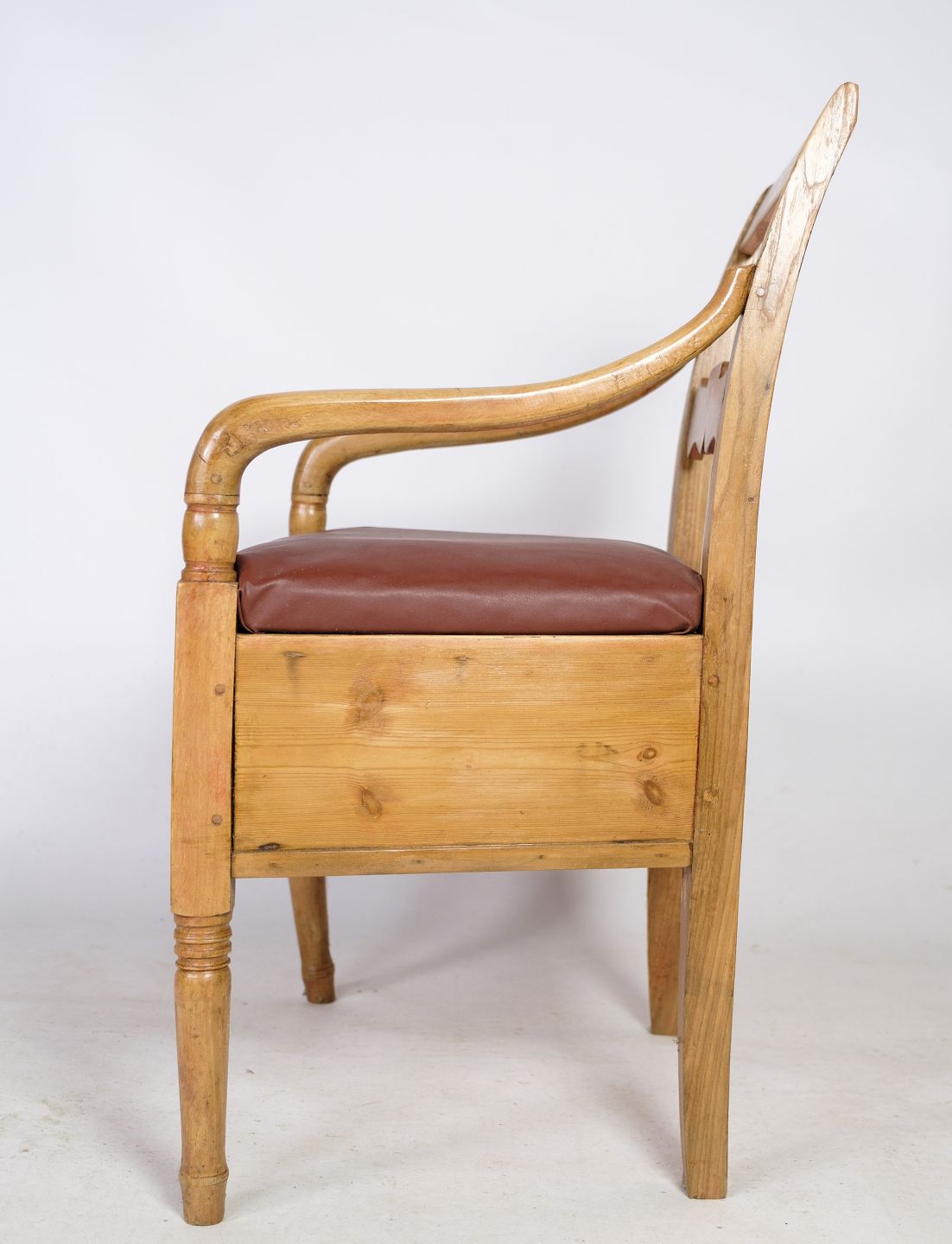 Bonde stol / armstol i fyrretræ med brunt læder fra omkring år 1840'erne. Står i flot istandsat.