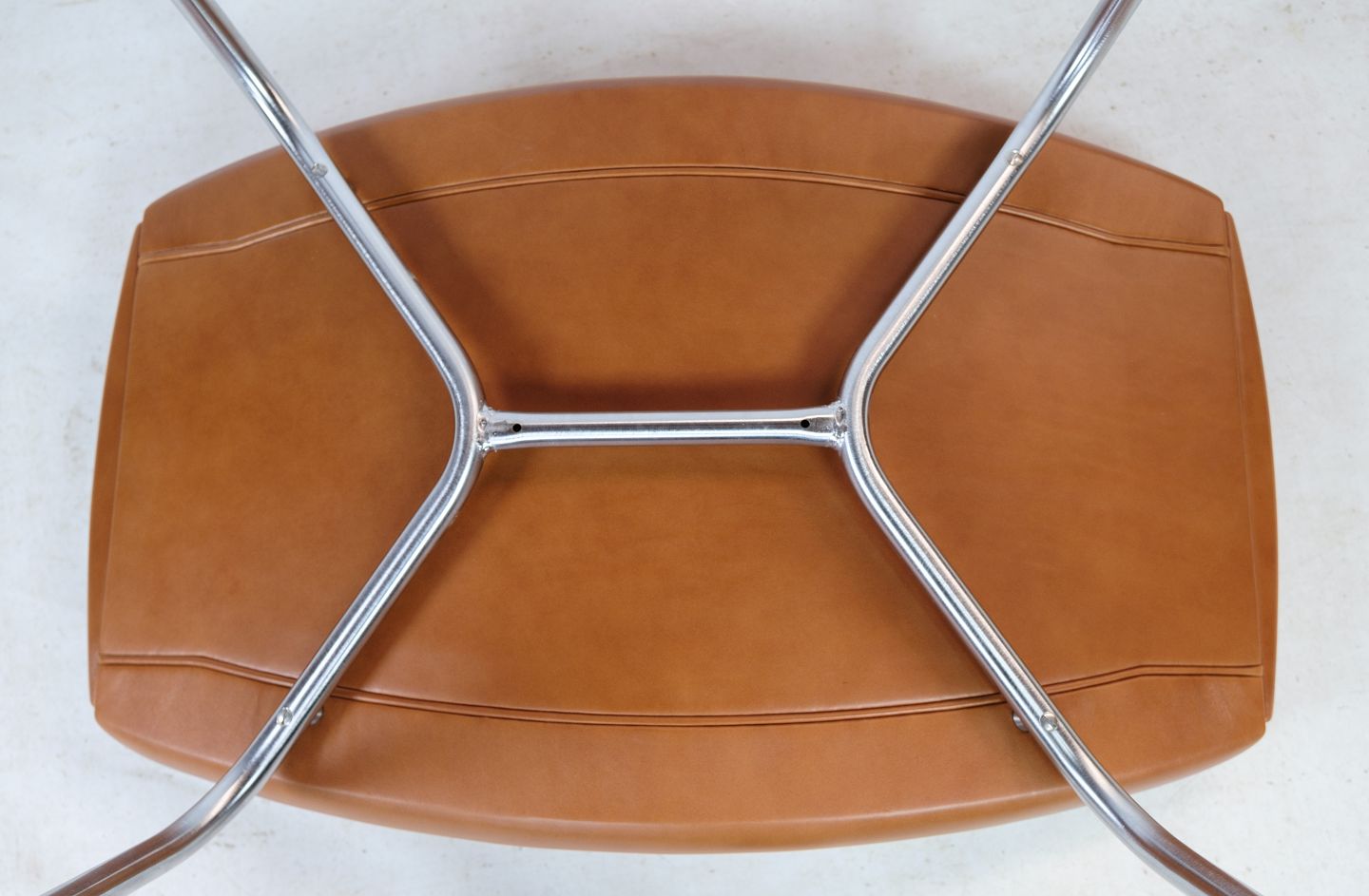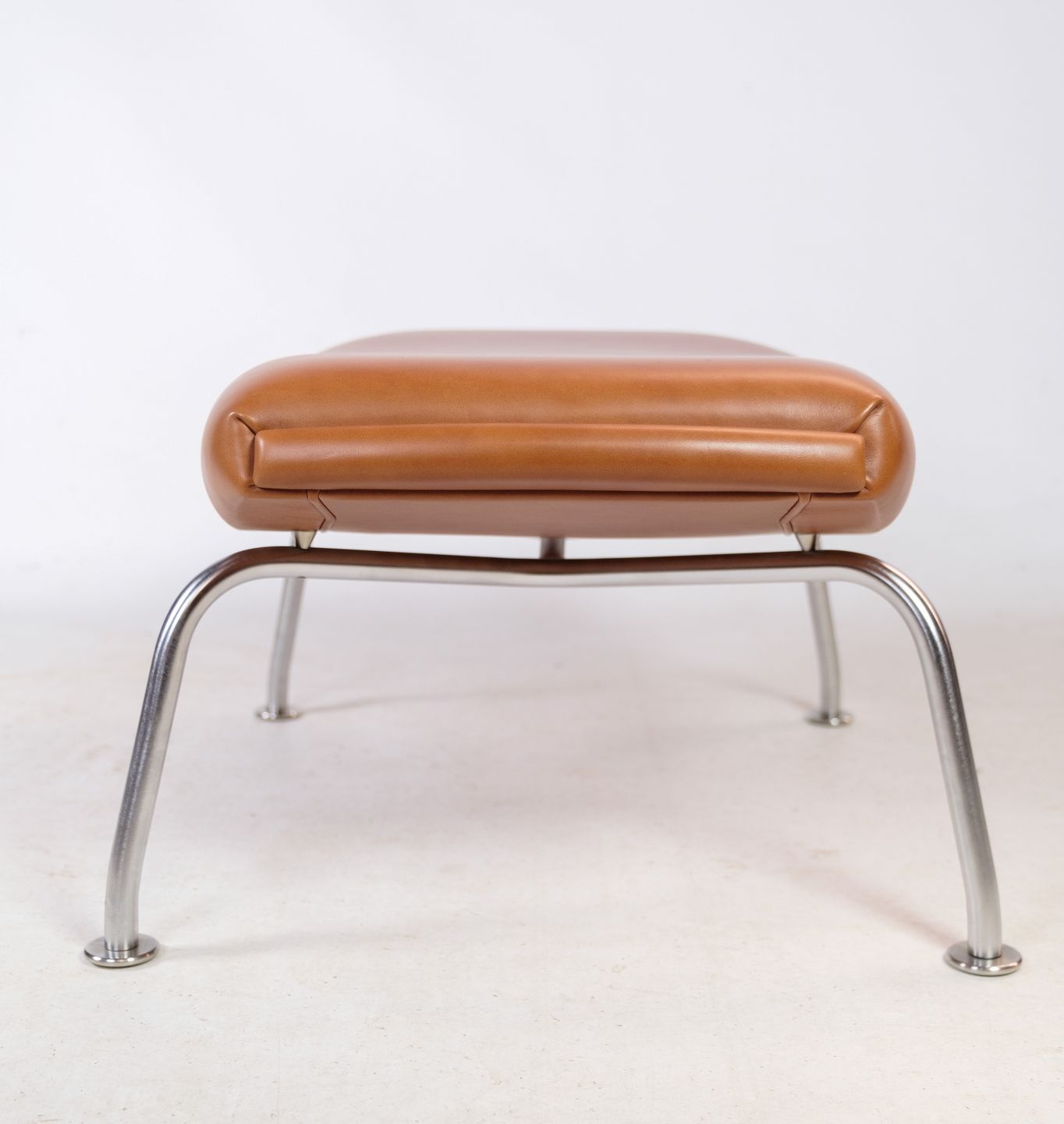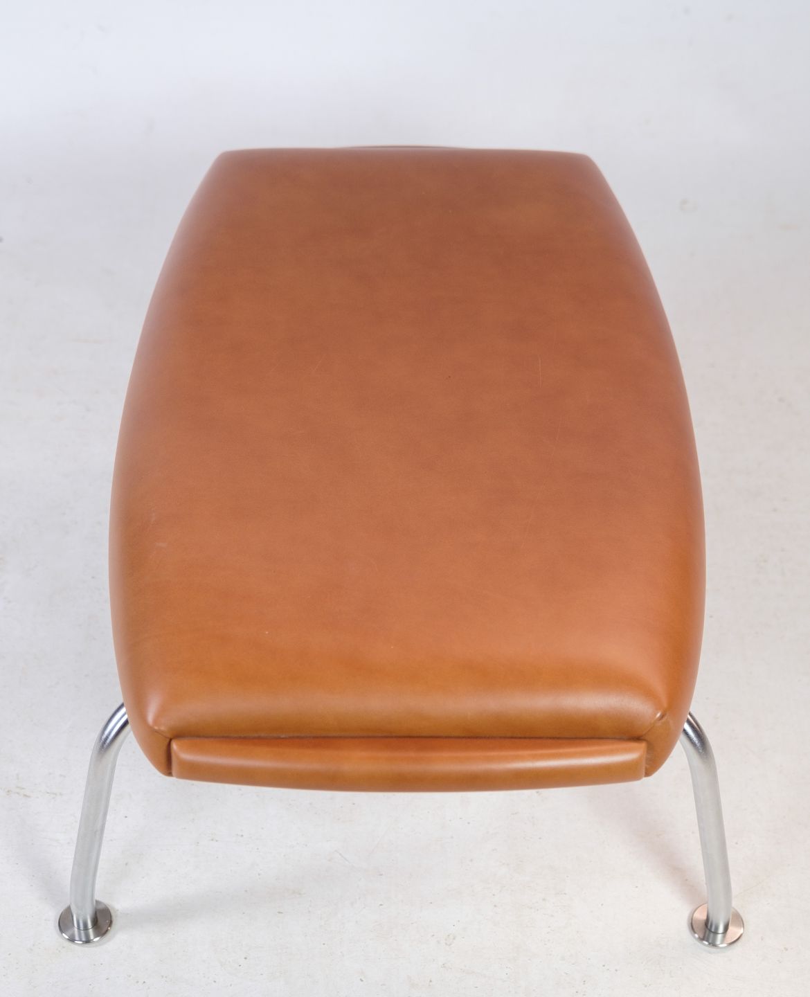 Designs by Hans J. Wegner are characterized by simplicity, functionality and aesthetic appeal, and the Oxford stool is no exception. It is upholstered in beautiful, high-quality cognac-colored leather, which provides both luxury and durability. Inside, the stool is molded with foam to ensure optimal comfort during use.