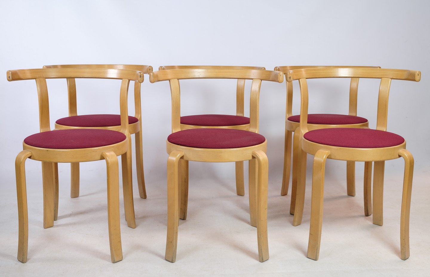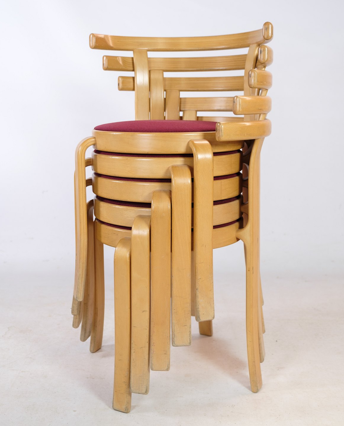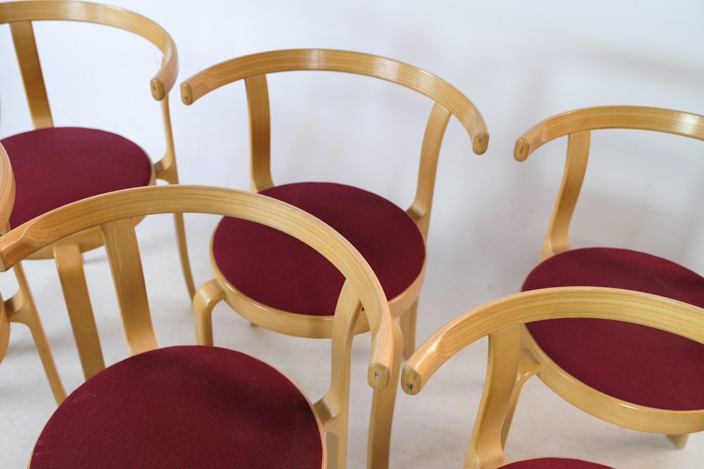 Set of 4/6/8/10/12 chairs, model 8000 Series, designed by Rud Thygesen & Johnny Sørensen in beech wood with red fabric made by Magnus Olesen. The chairs have been produced by Magnus Olesen since 1981