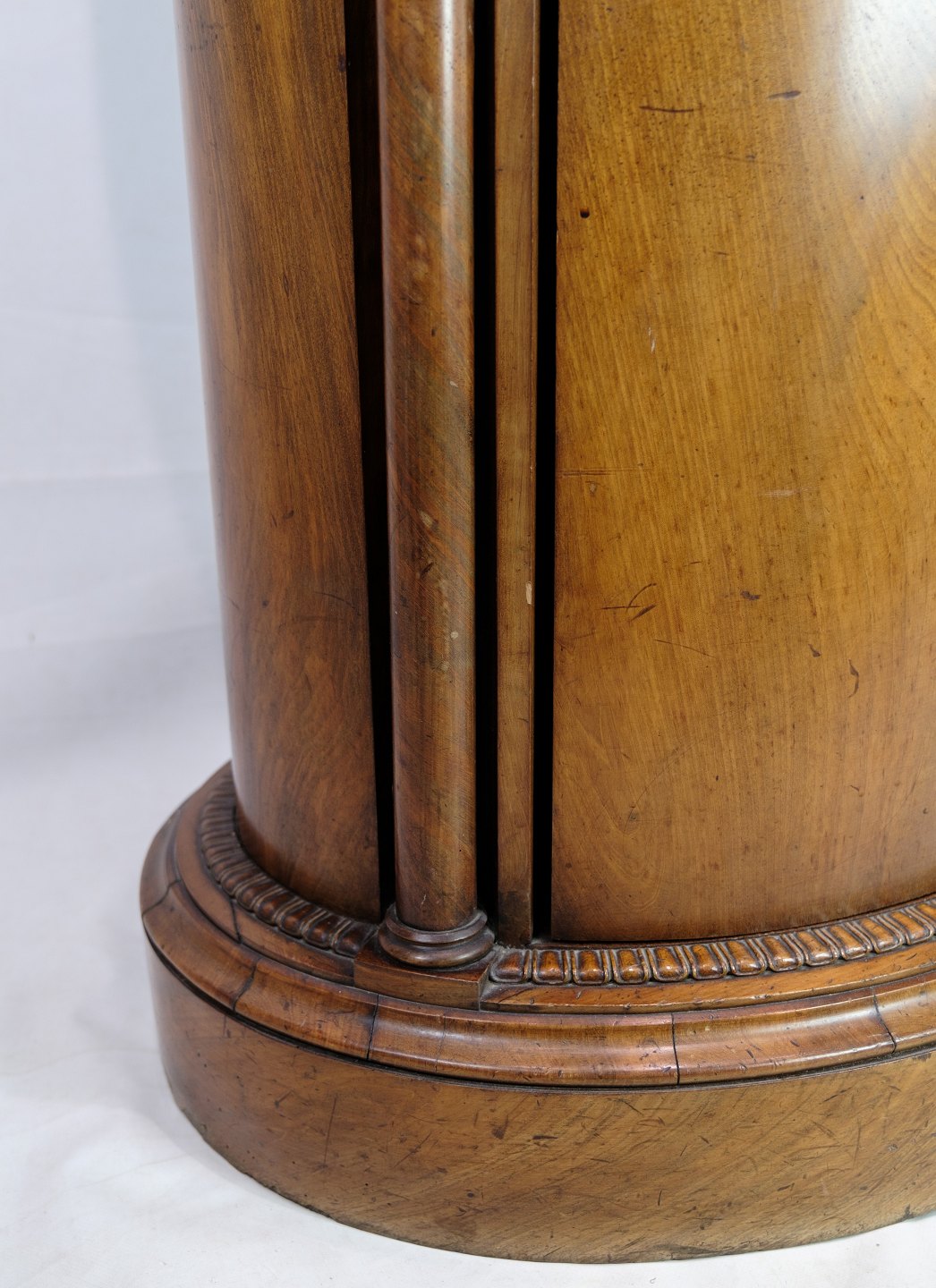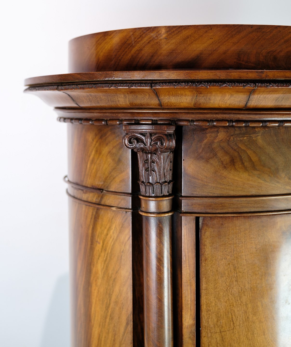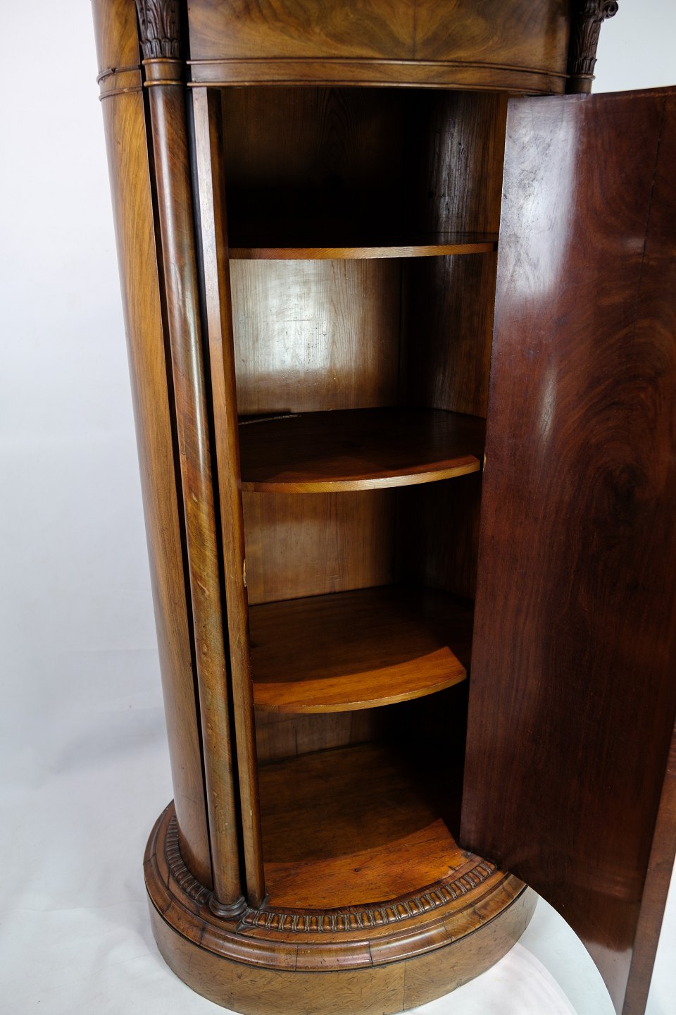 Oval pedestal cabinet decorated with mahogany carvings from around the 1820s.