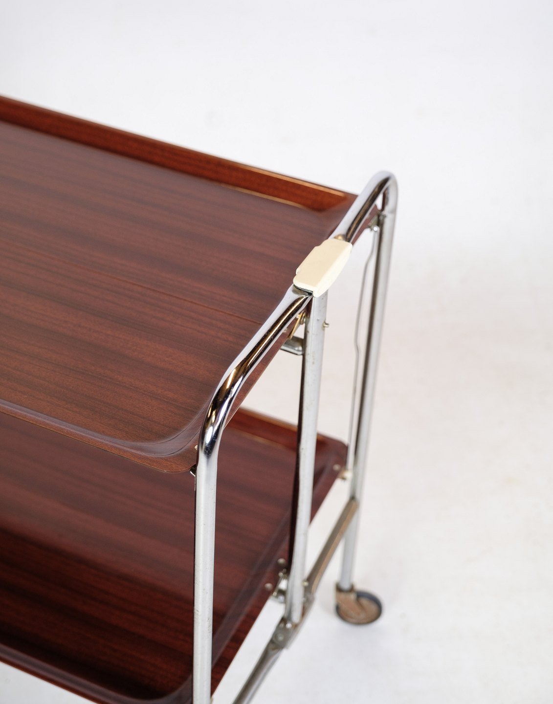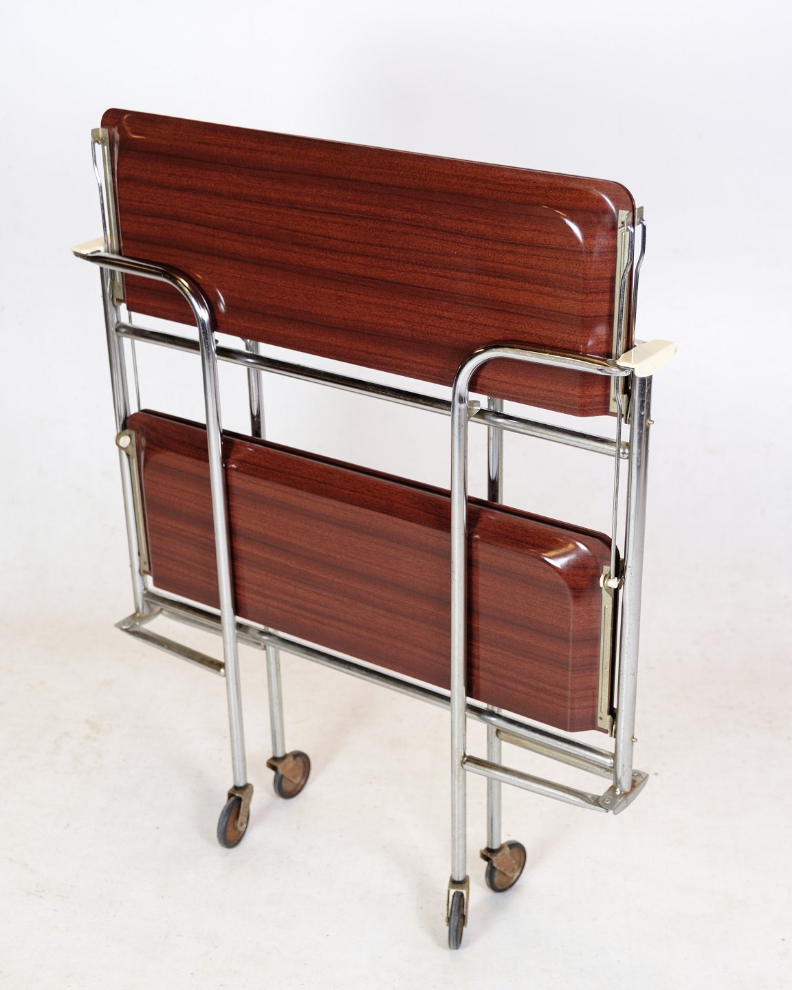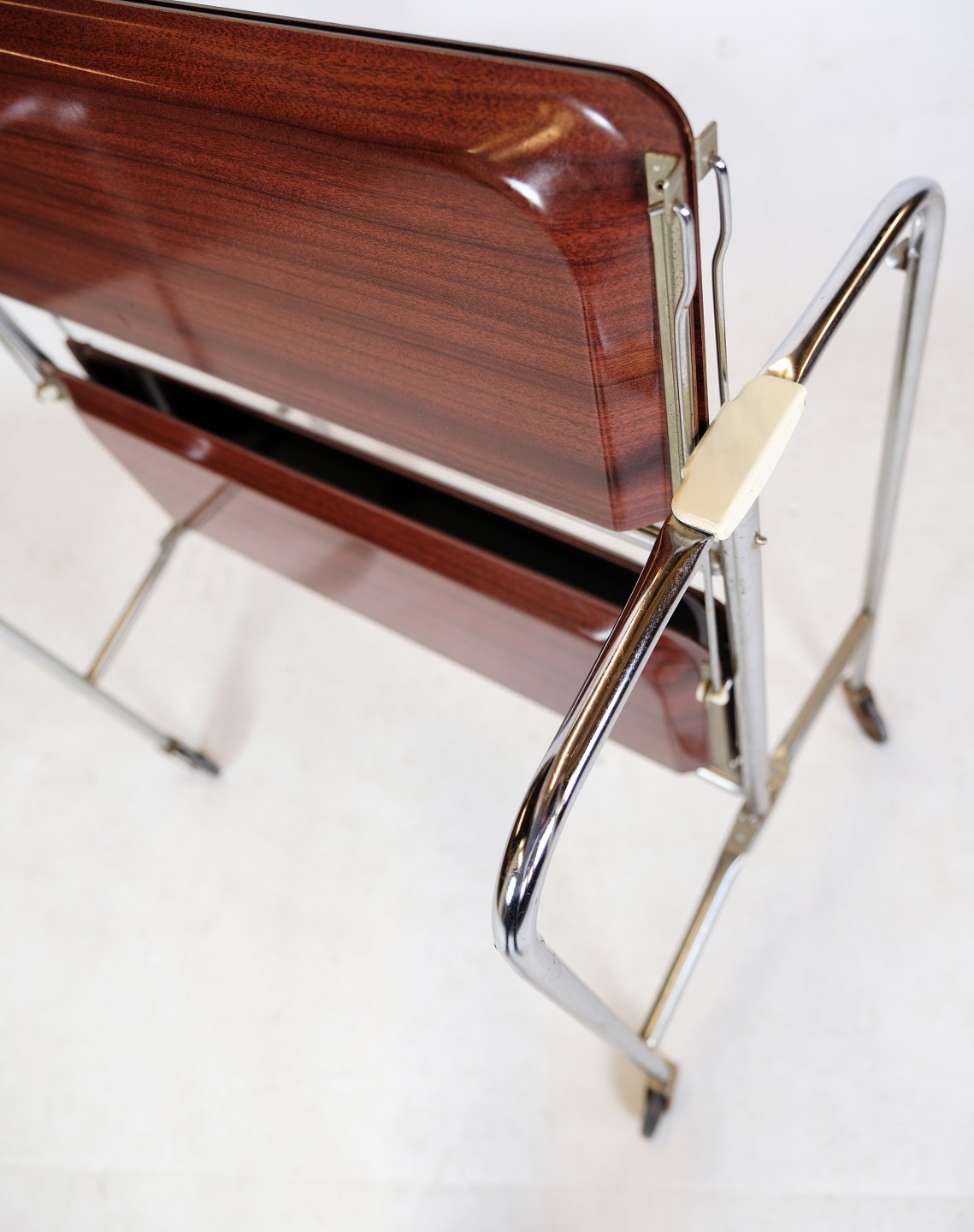 SoldRolling table with imitation mahogni surface with chromed metal frame and original wheels.