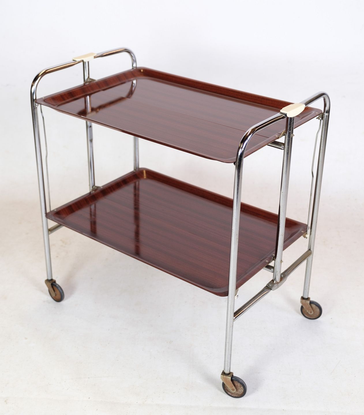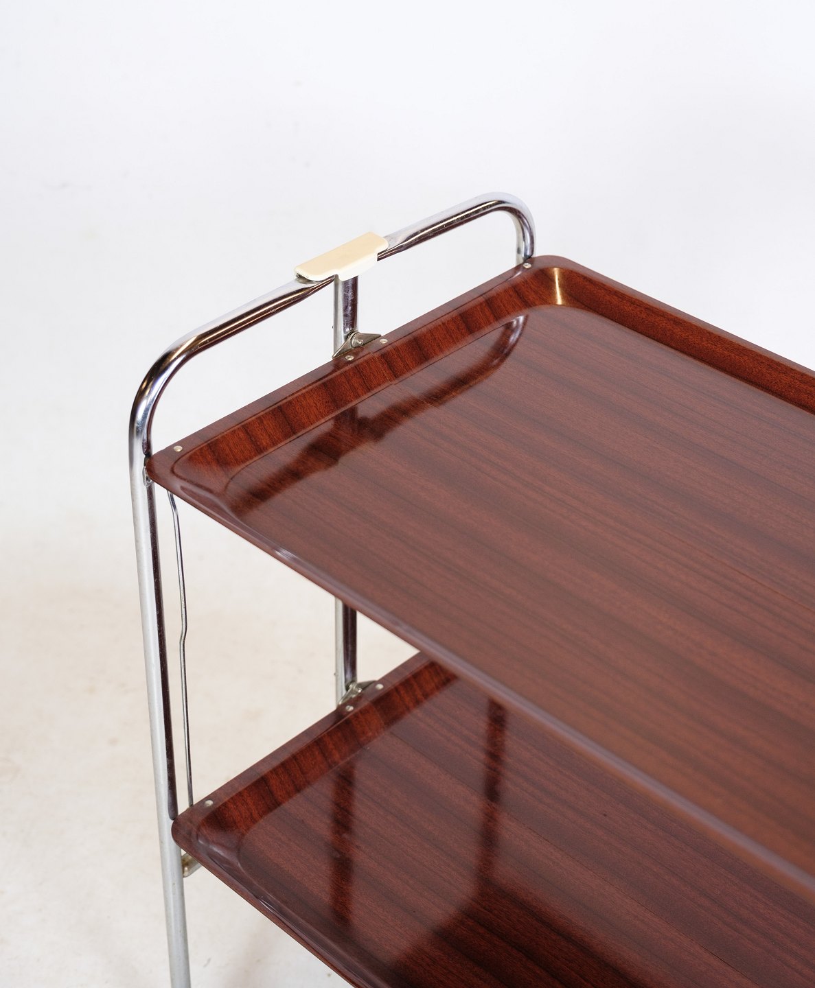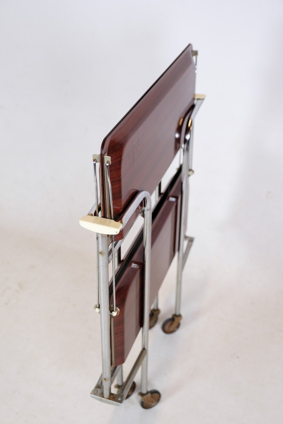 SoldRolling table with imitation mahogni surface with chromed metal frame and original wheels.