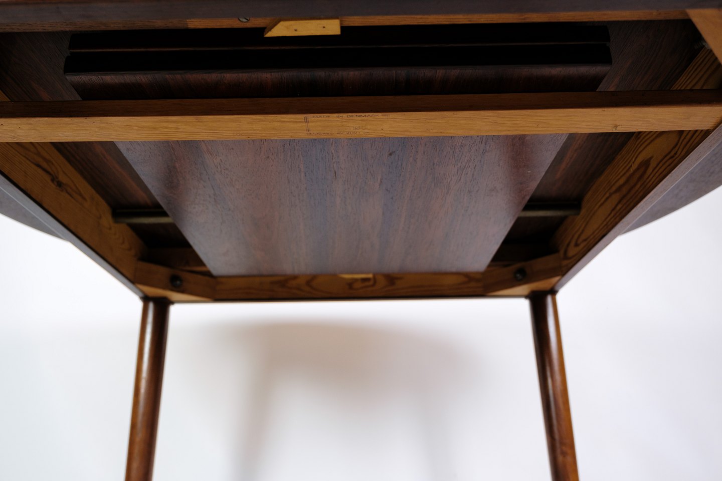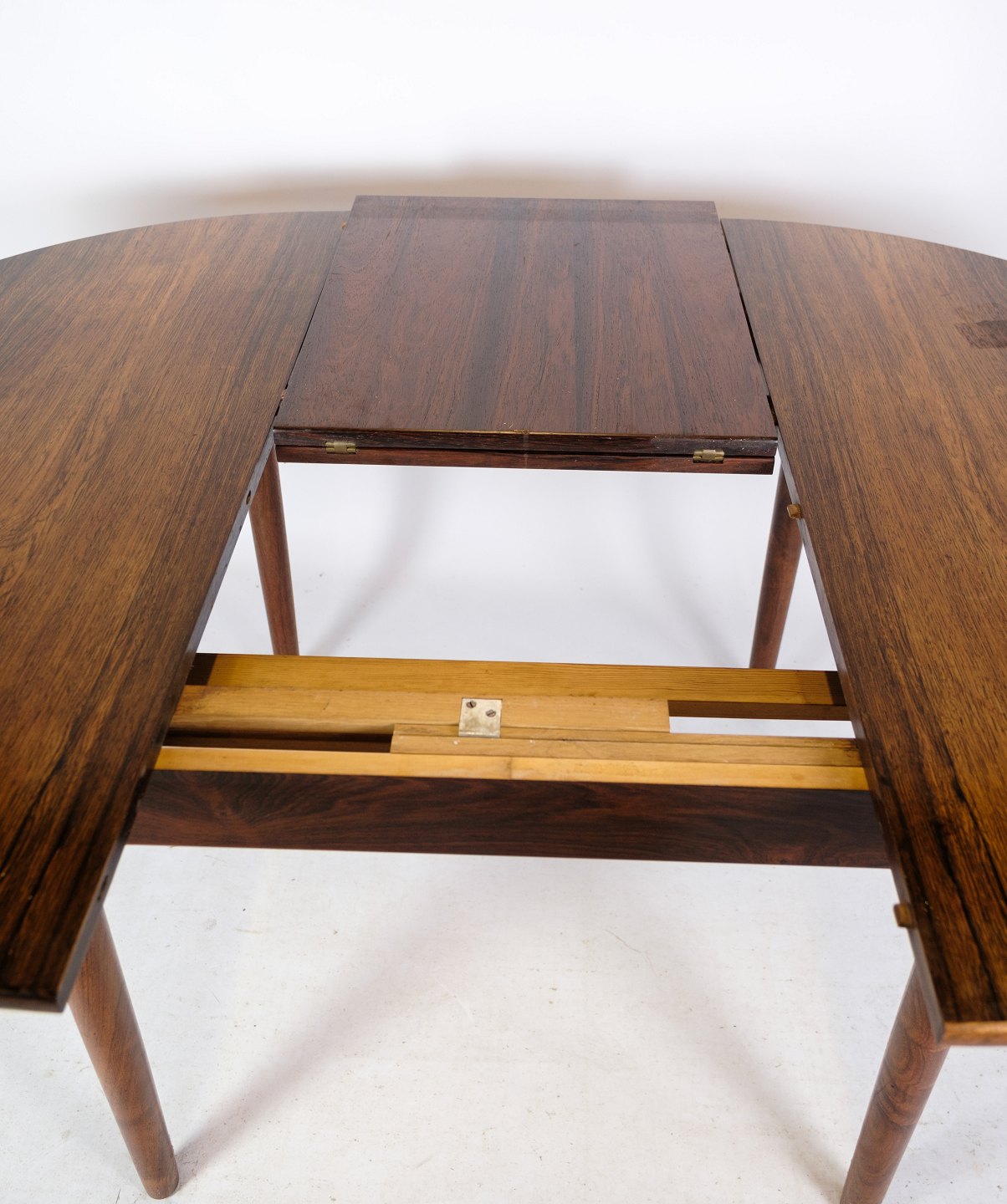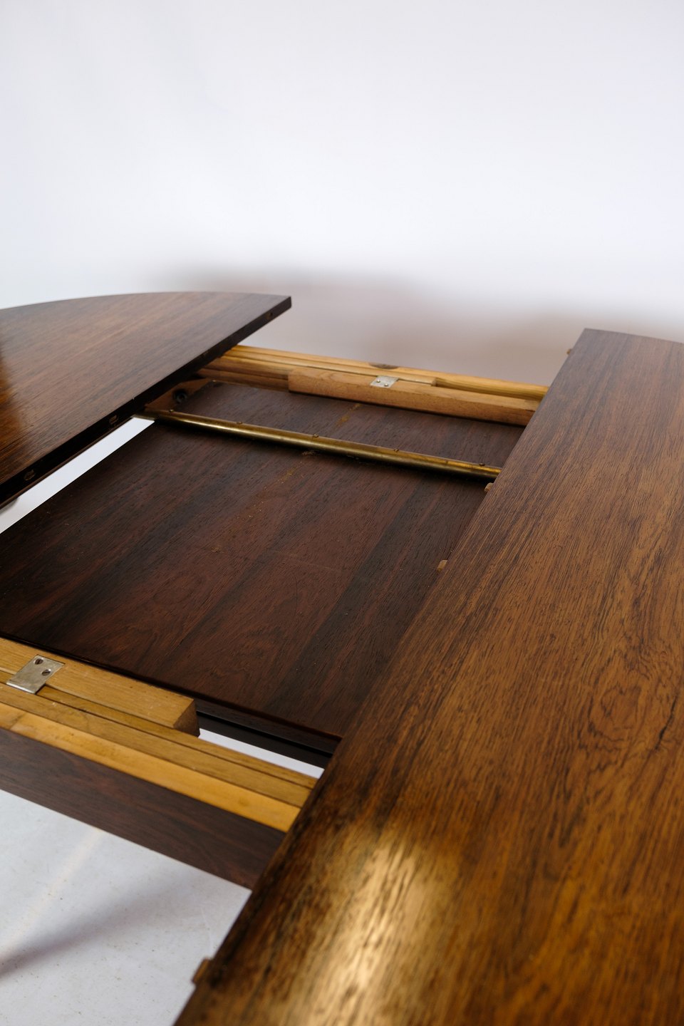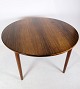 SoldTeak dining table with built-in additional plate and round legs of Danish design from around the 1960s.