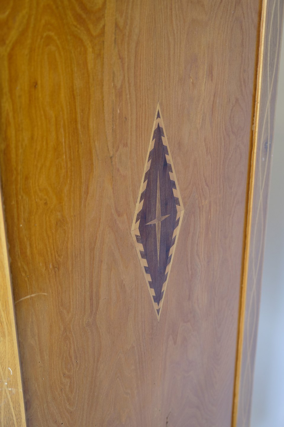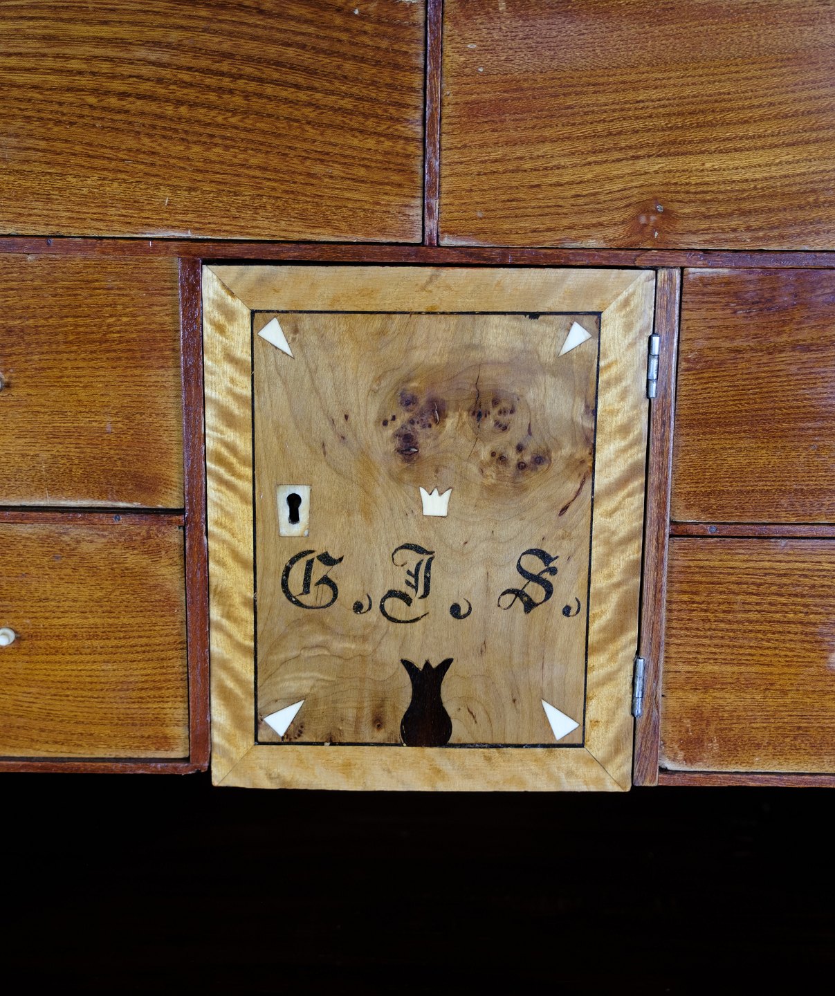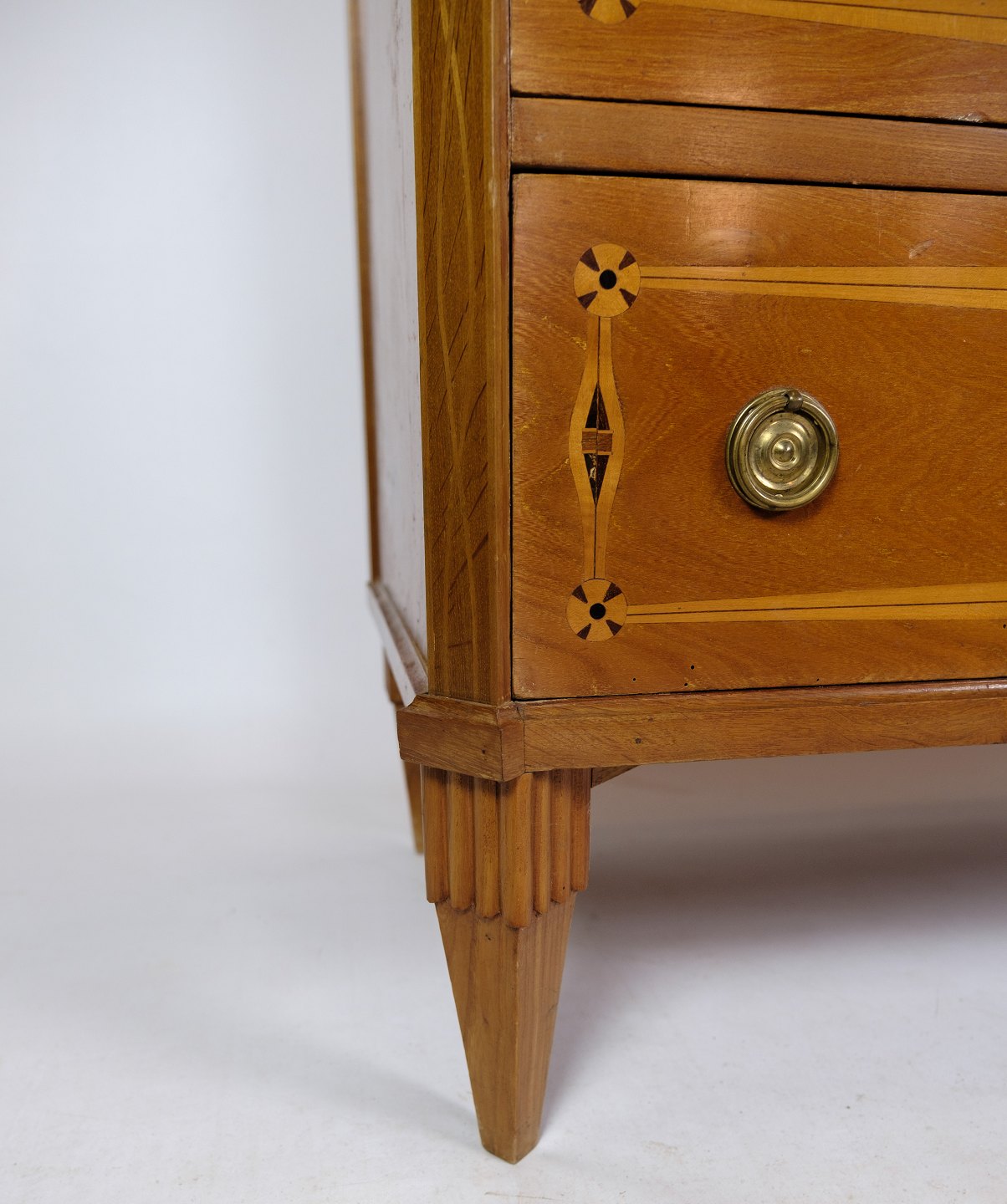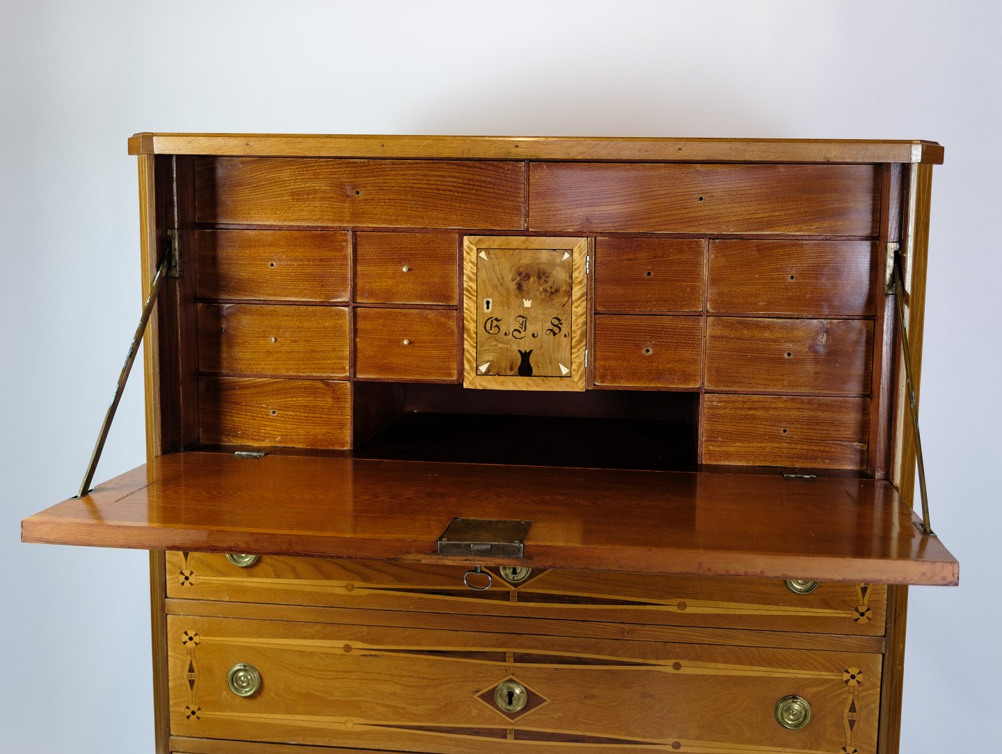 Sekretær af lyst mahogni udsmykket med dekorationer af Intarsia af frugt træ og messing håndtag fra omkring 1810'erne.