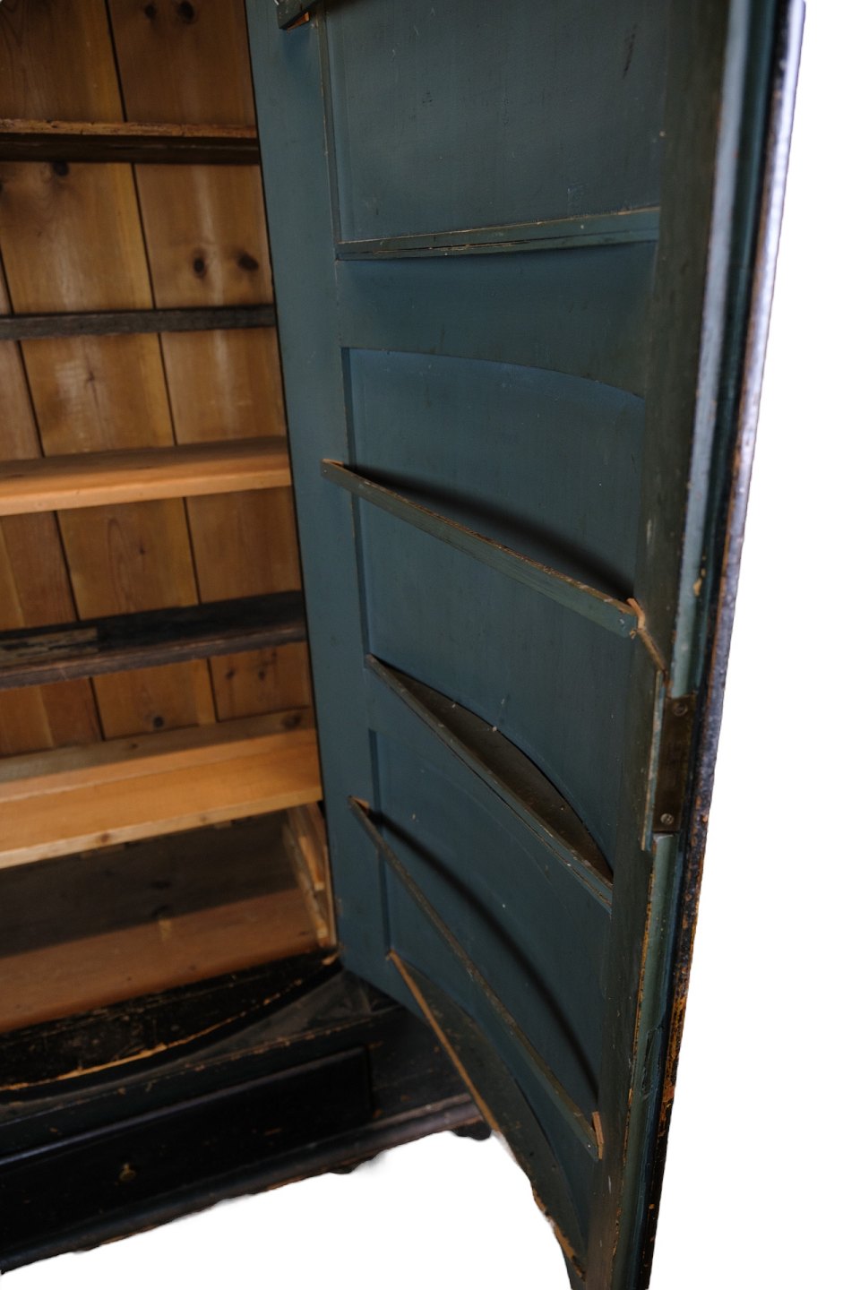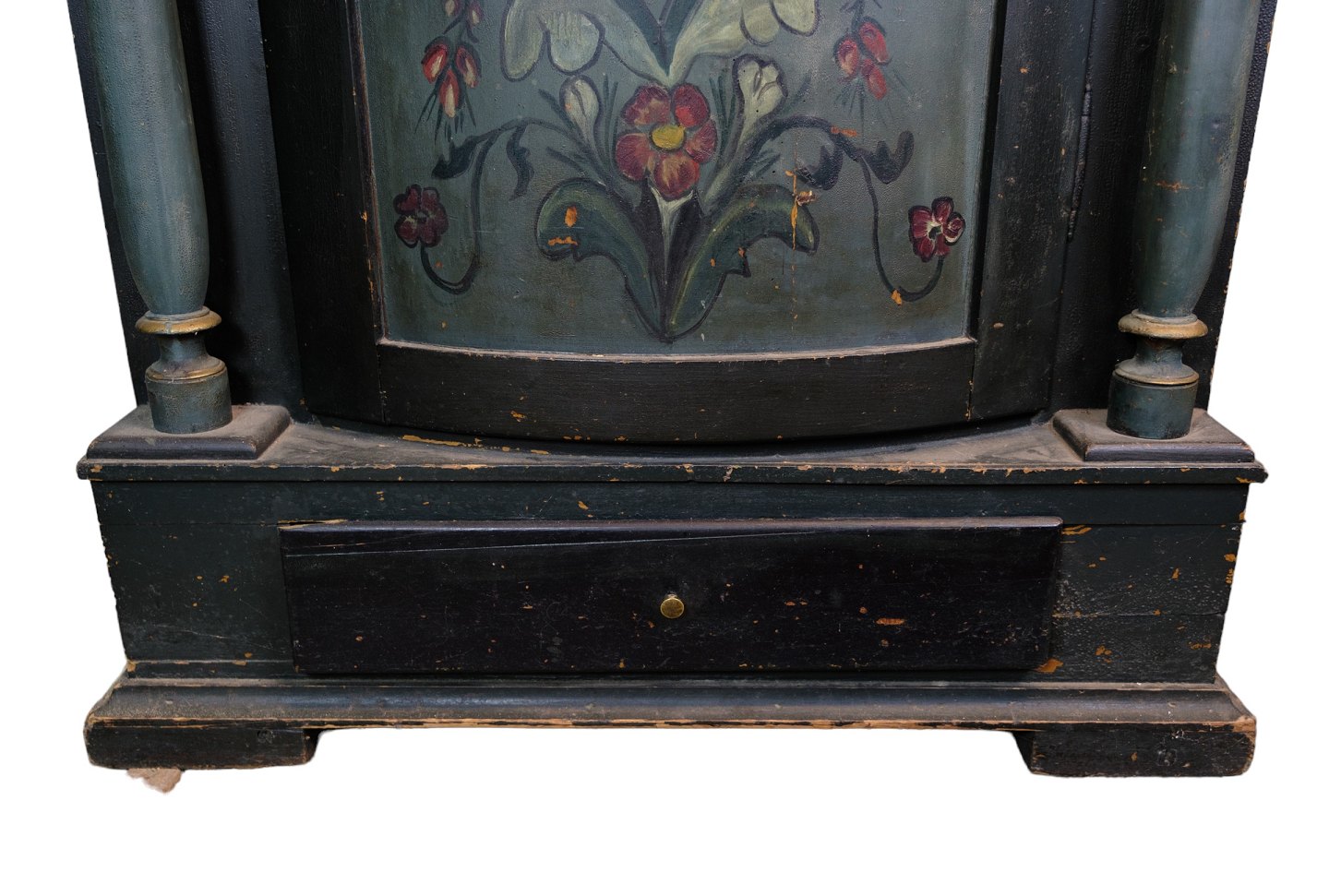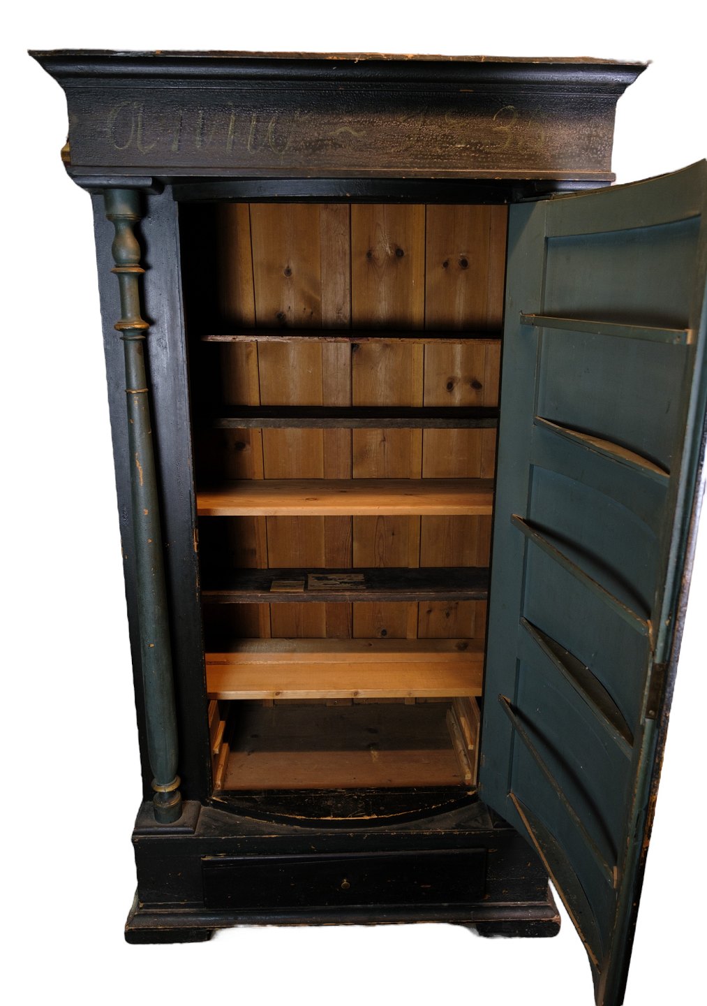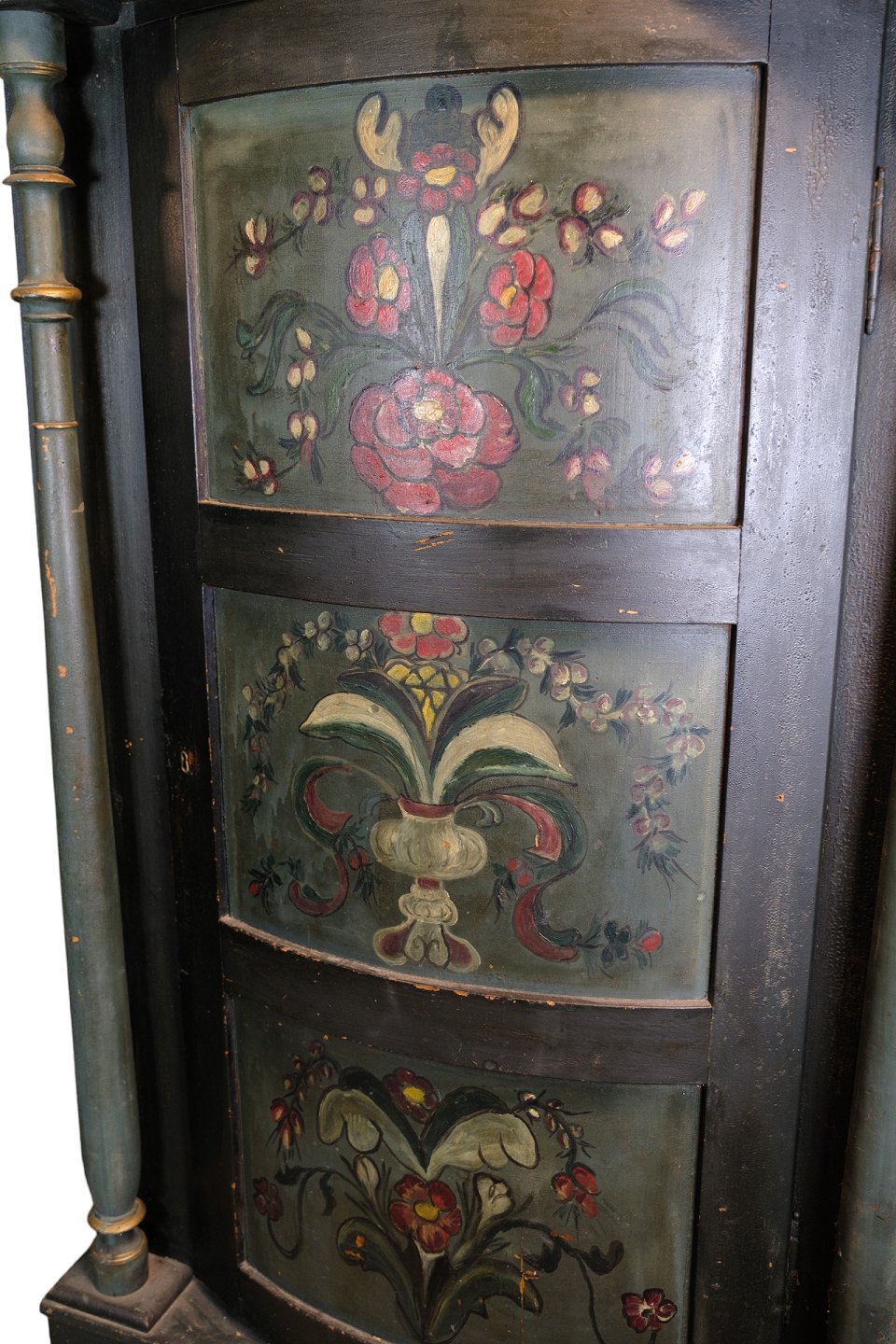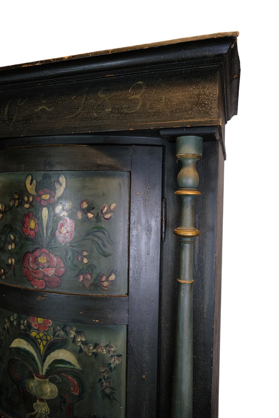 Malede Hedeboskab (Roskildeskab) med søjler og blomster dekoration med låge og indvendig hylder fra år 1836.