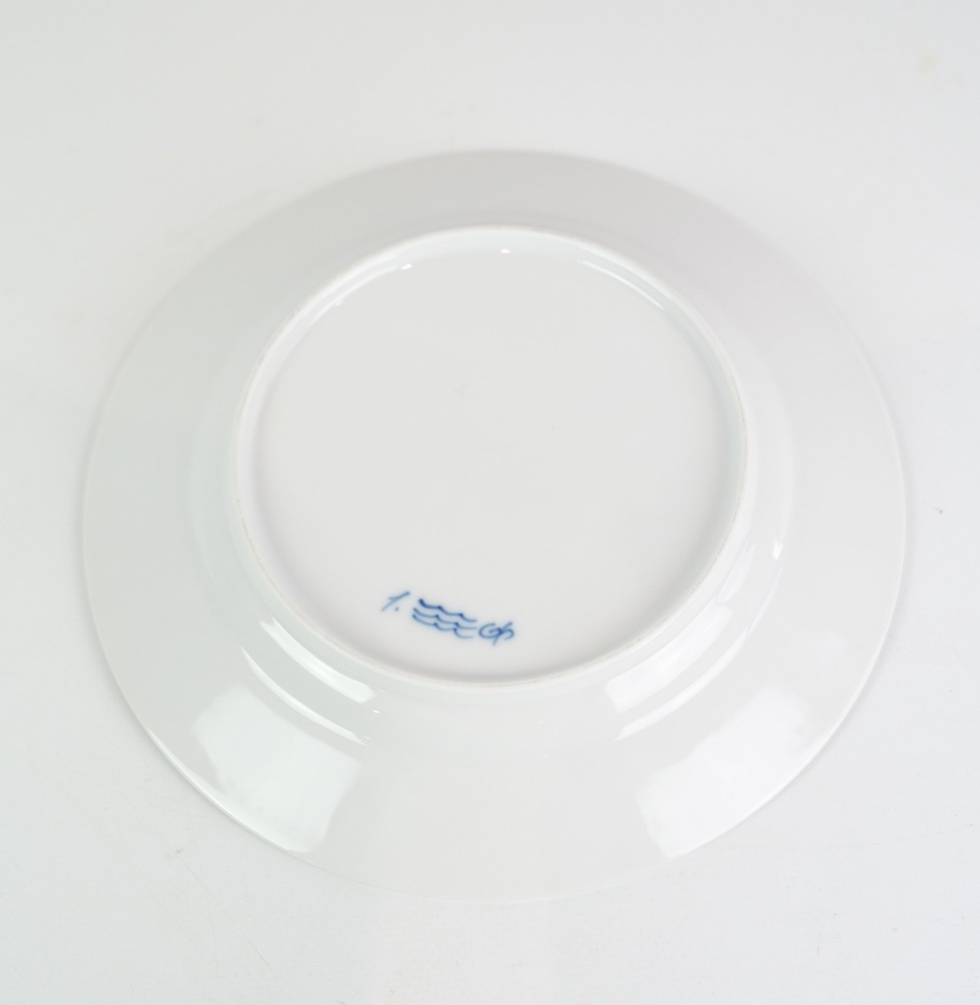 Denne sidetallerken bærer det karakteristiske Musselmalet-mønster, der består af delikate blåmønstre, der pryder tallerkenens overflade. Dette mønster er blevet synonymt med Royal Copenhagen og dansk porcelænstradition.