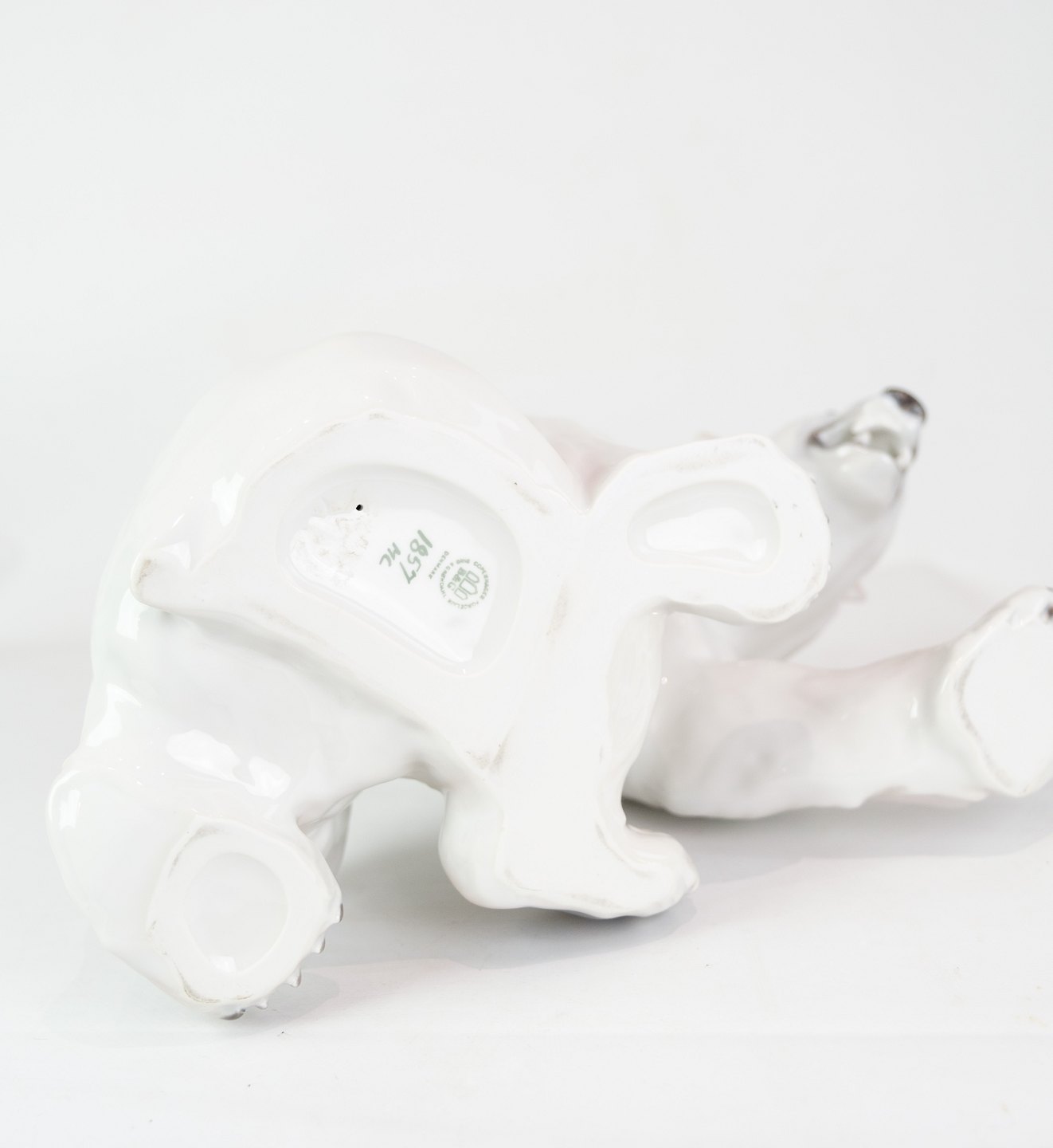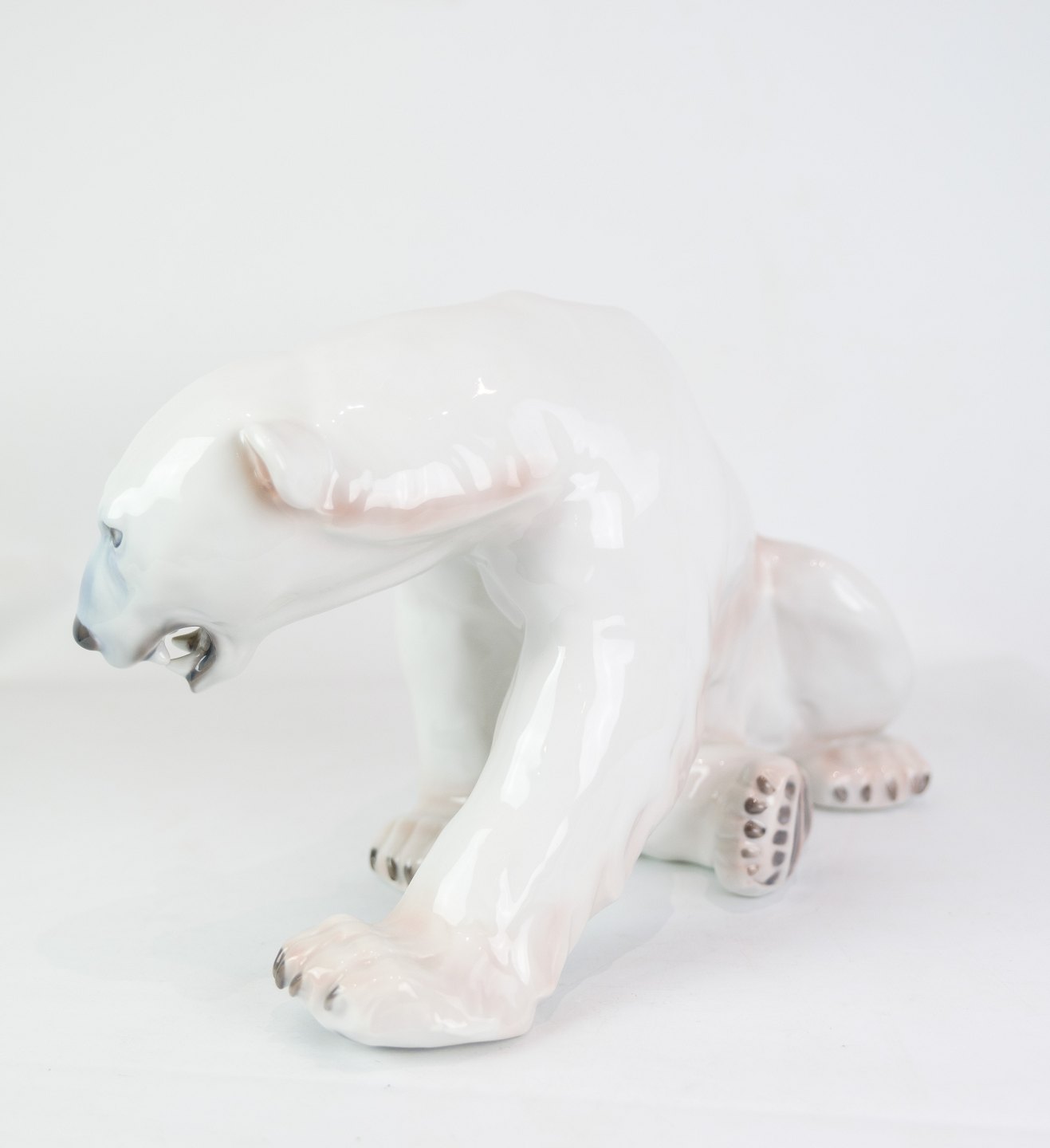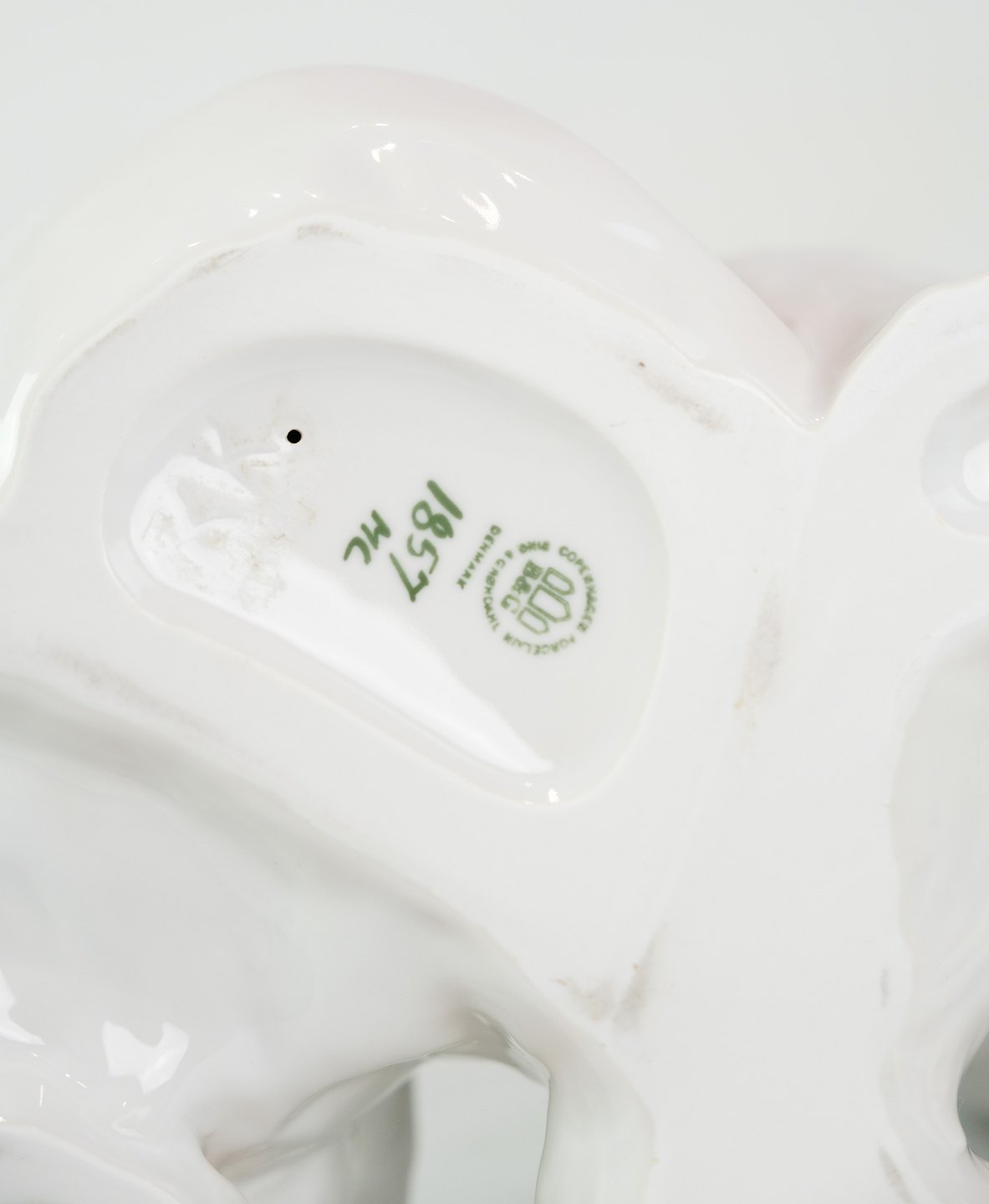 Bing & Grøndahl (B&G) The Polar Bear with number 1857, also known as "Big Polar Bear" or "Knud Kyhn Polar Bear," is an impressive porcelain figure designed by the renowned Danish ceramist Knud Kyhn. This figure is often related to Bing & Grøndahl and Royal Copenhagen, as Royal Copenhagen later took over Bing & Grøndahl.