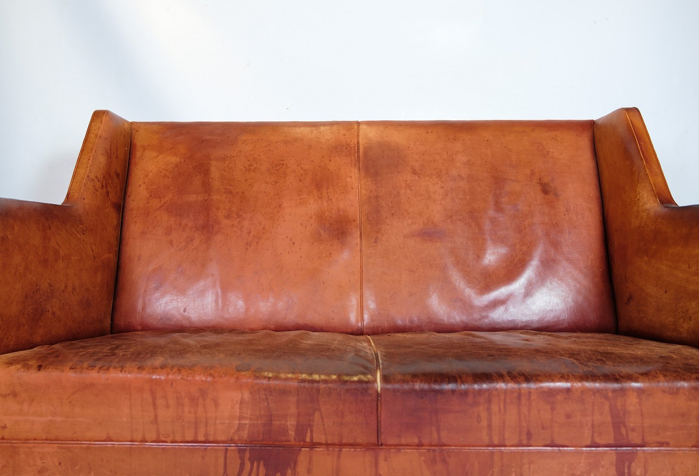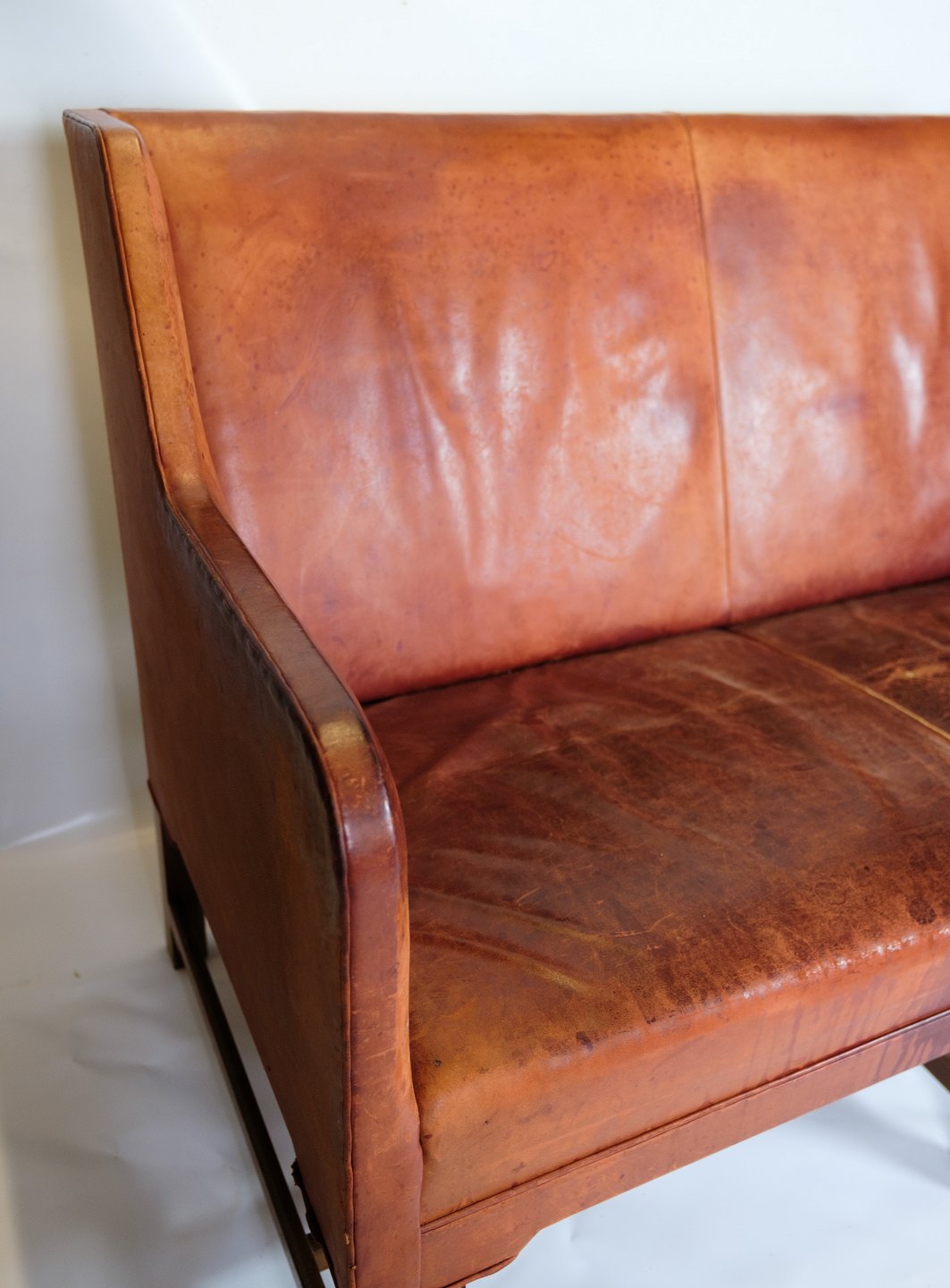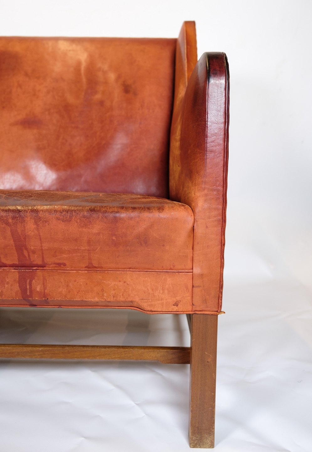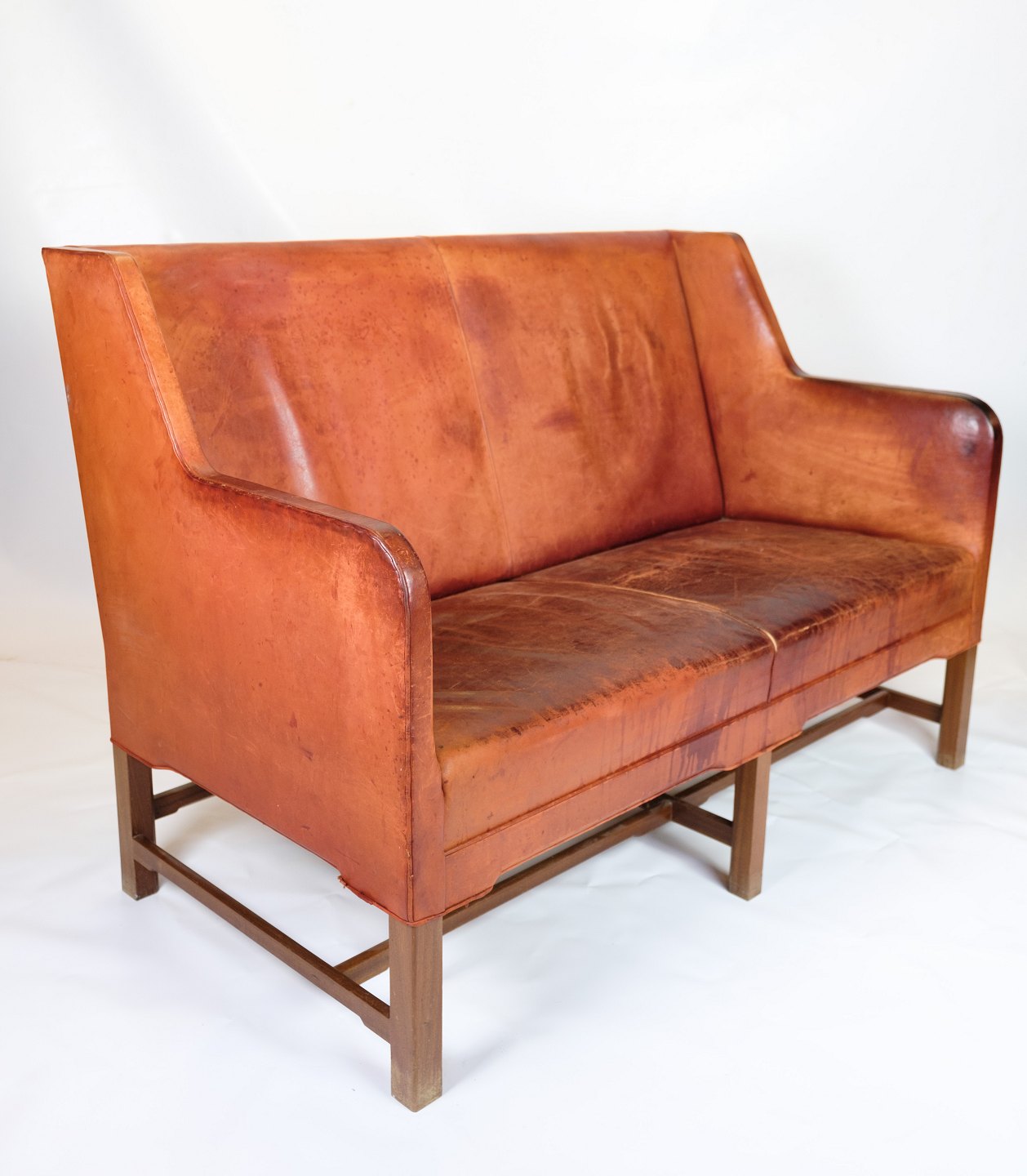 Please contact us for price informationThe vintage design two-seater sofa model 5011 created by Kaare Klint. This iconic piece is crafted in original cognac leather and features a distinctive six-legged mahogany base. The sofa gained recognition after being showcased at the Copenhagen Cabinetmakers' Guild exhibition in 1935, highlighting its significance in the history of Danish modern design.