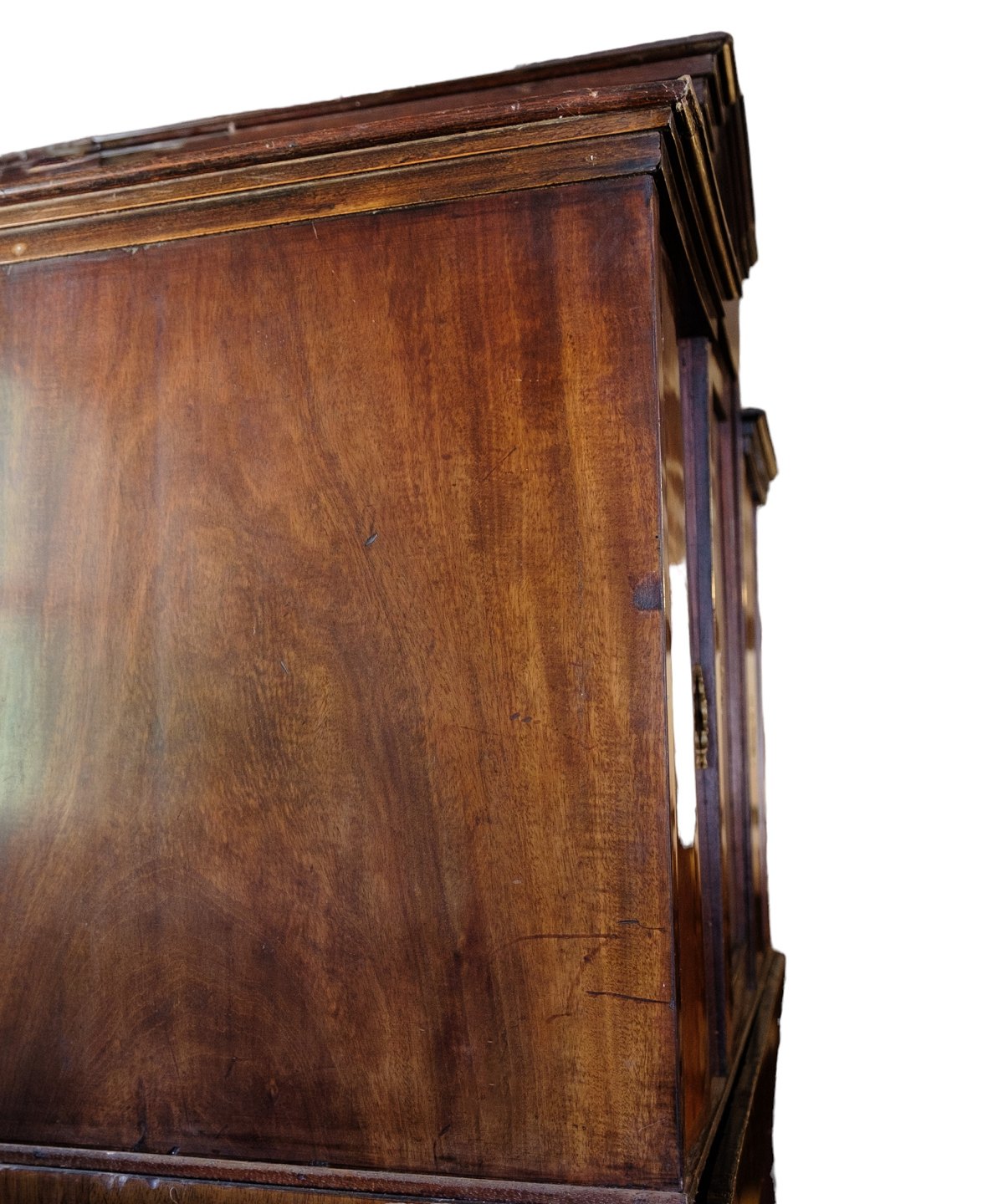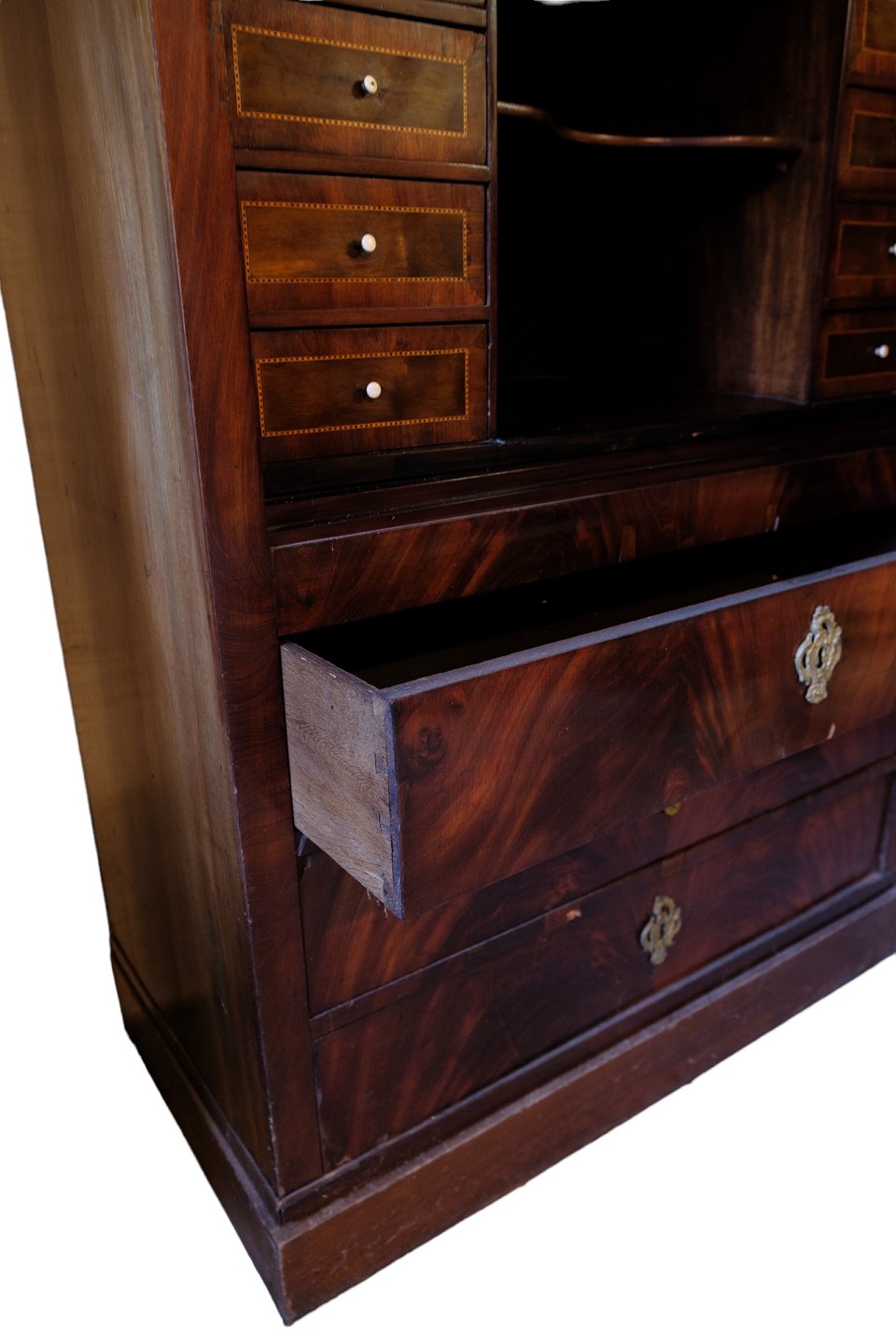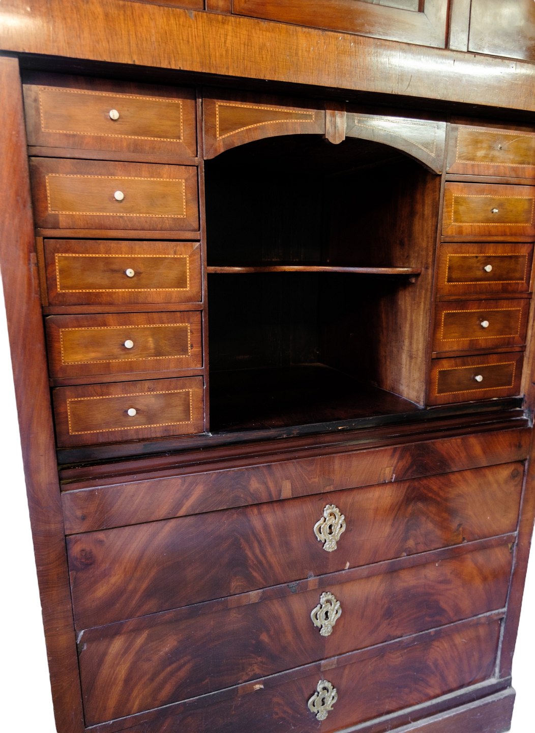 High mahogany secretary with marquetry and brass fittings from around the 1840s.