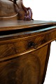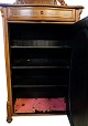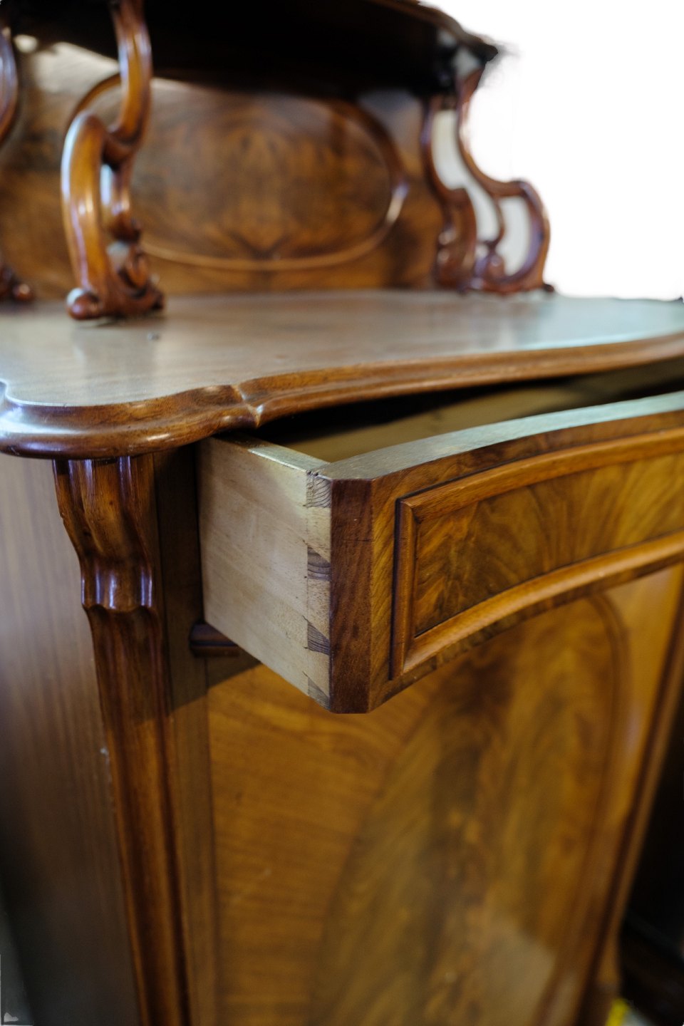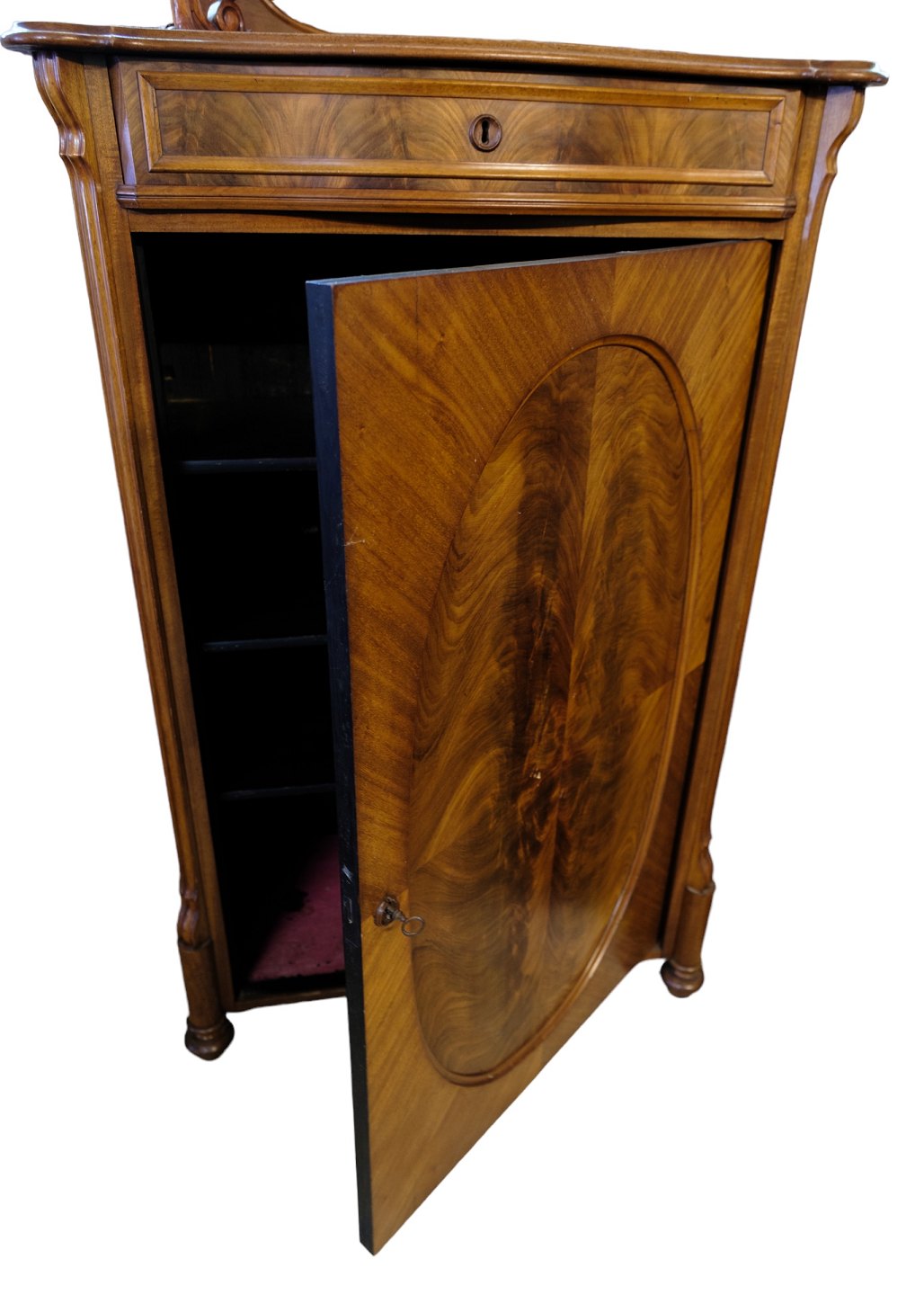 Mahogany cabinet with door and 3 shelves decorated with wood carvings and intarsia from around the 1880s.