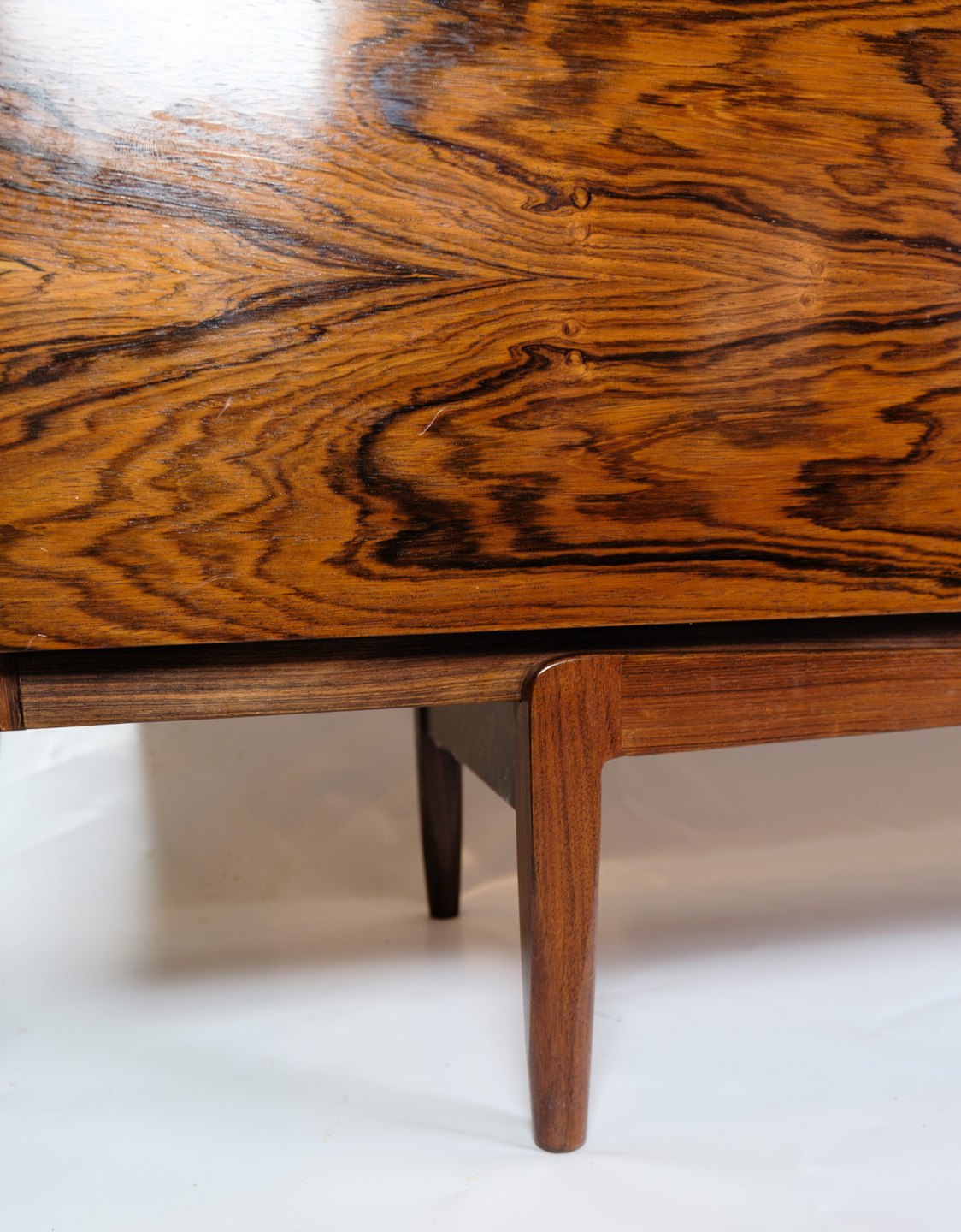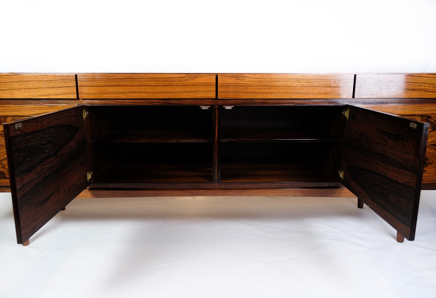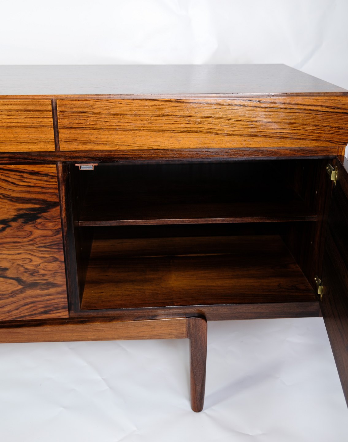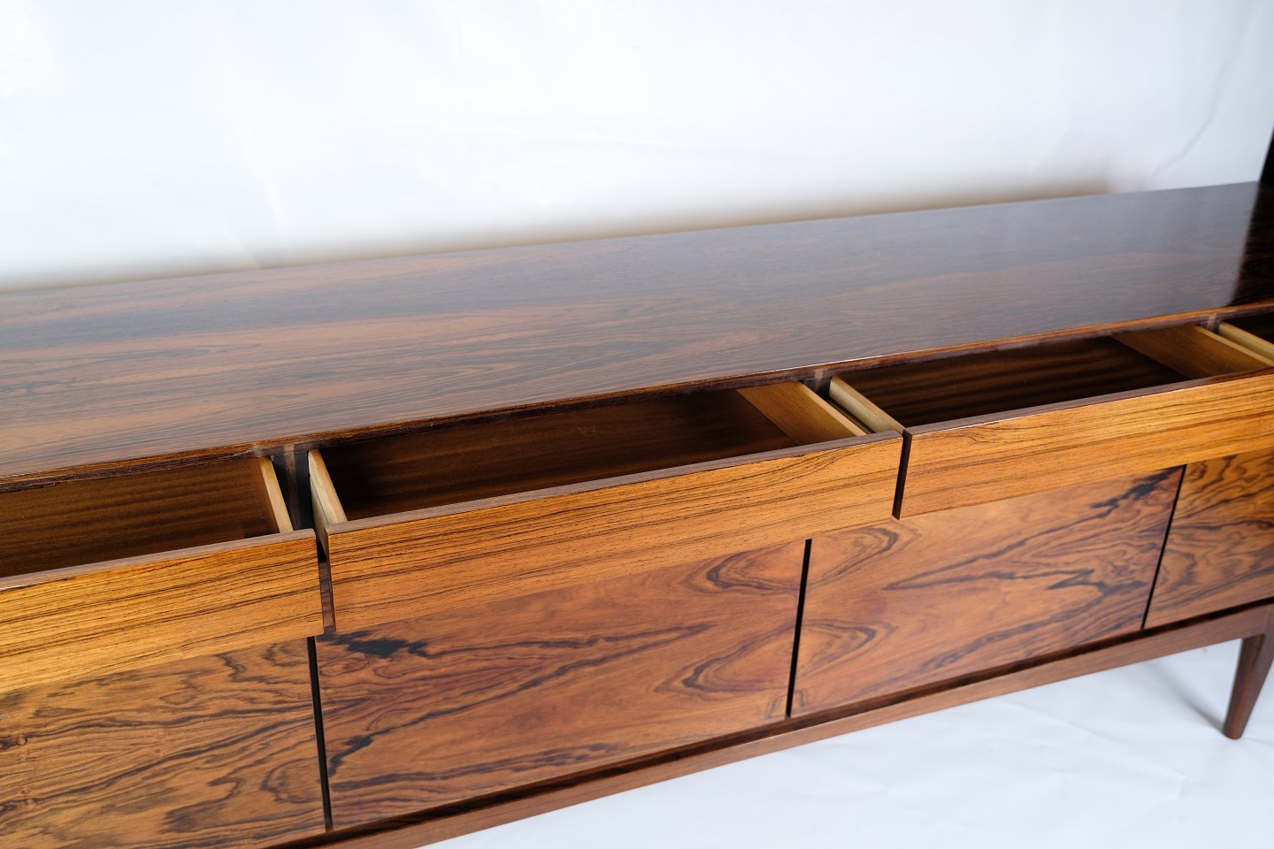 A rosewood sideboard designed by Ib Kofod-Larsen, model FA66, manufactured by Faarup Møbelfabrik in the 1960s, is a true gem of craftsmanship. This low, free-standing sideboard is distinguished by its excellent workmanship in rosewood veneer with an enchanting structure.
