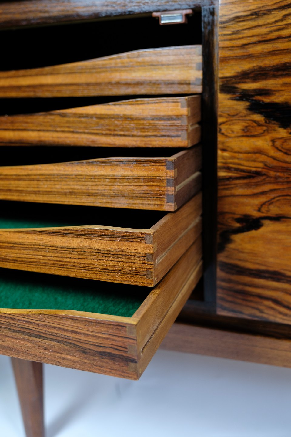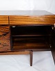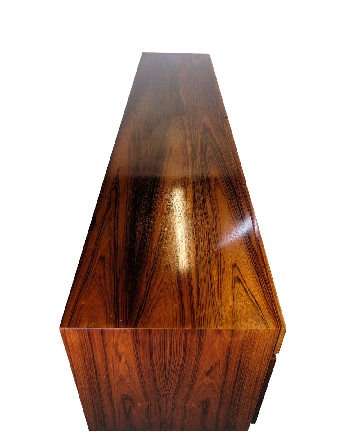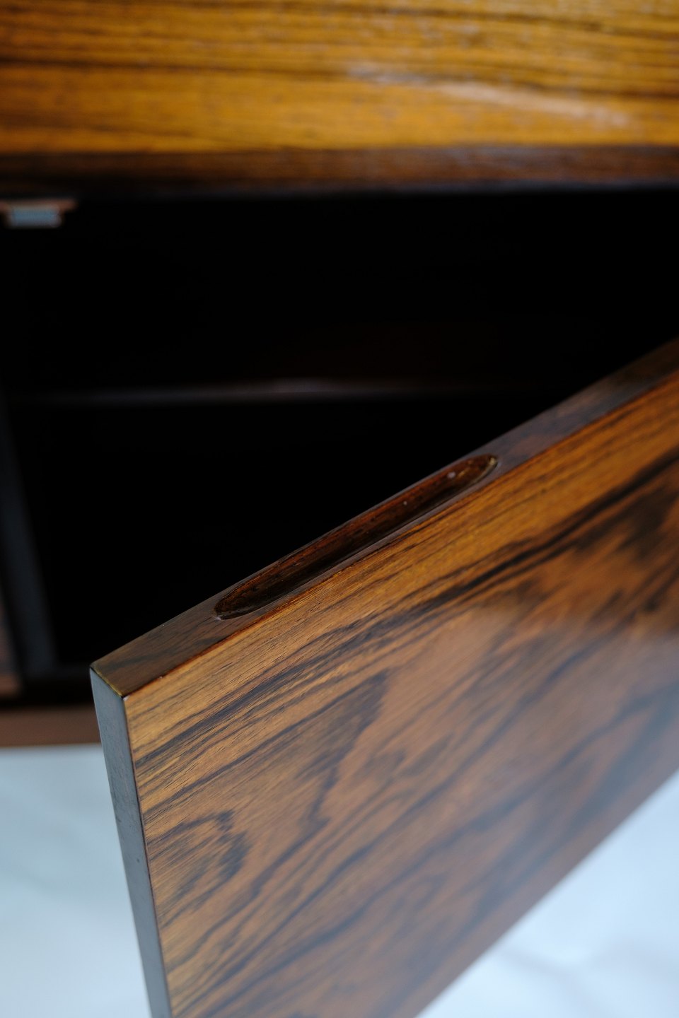 A rosewood sideboard designed by Ib Kofod-Larsen, model FA66, manufactured by Faarup Møbelfabrik in the 1960s, is a true gem of craftsmanship. This low, free-standing sideboard is distinguished by its excellent workmanship in rosewood veneer with an enchanting structure.