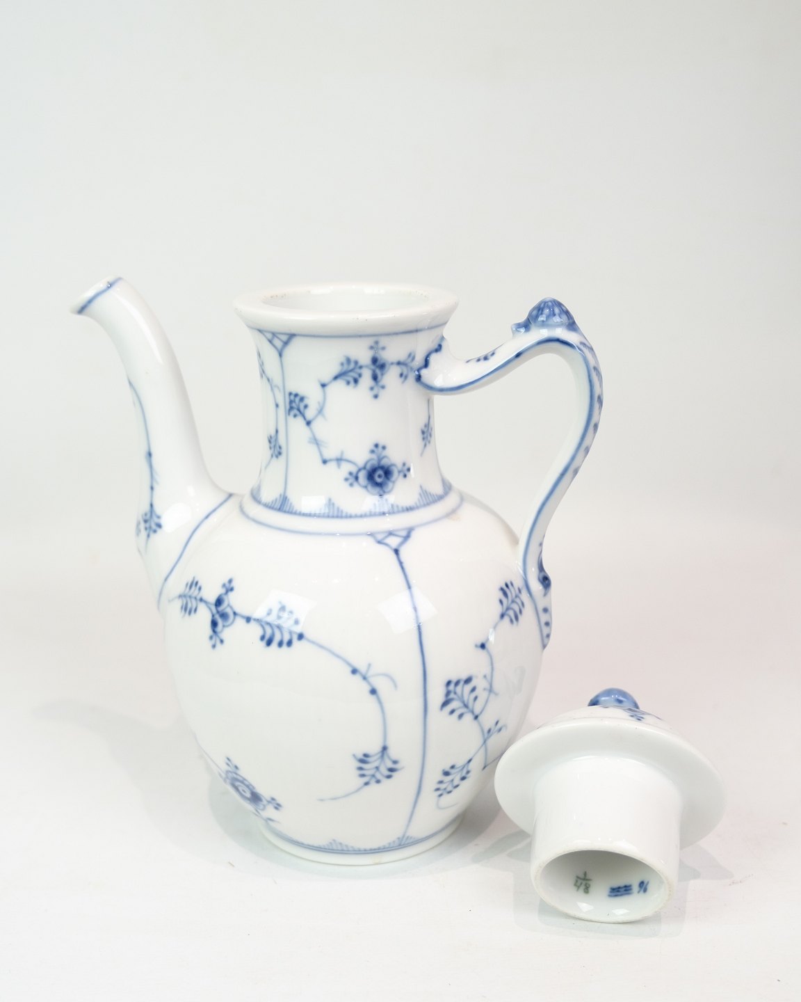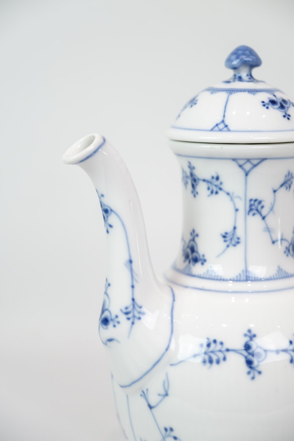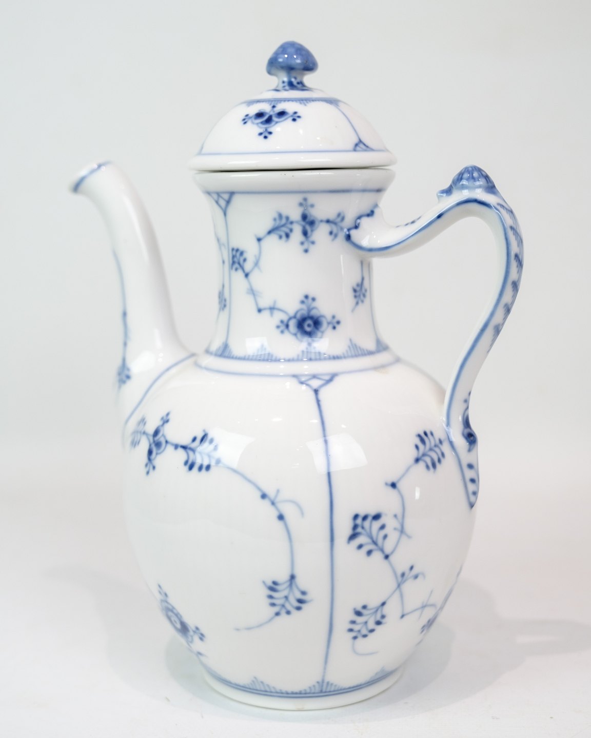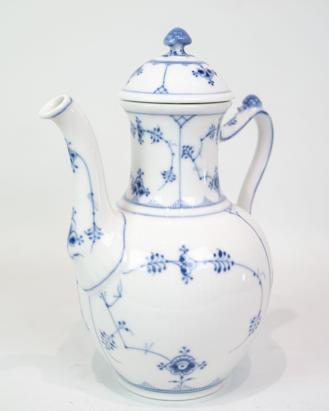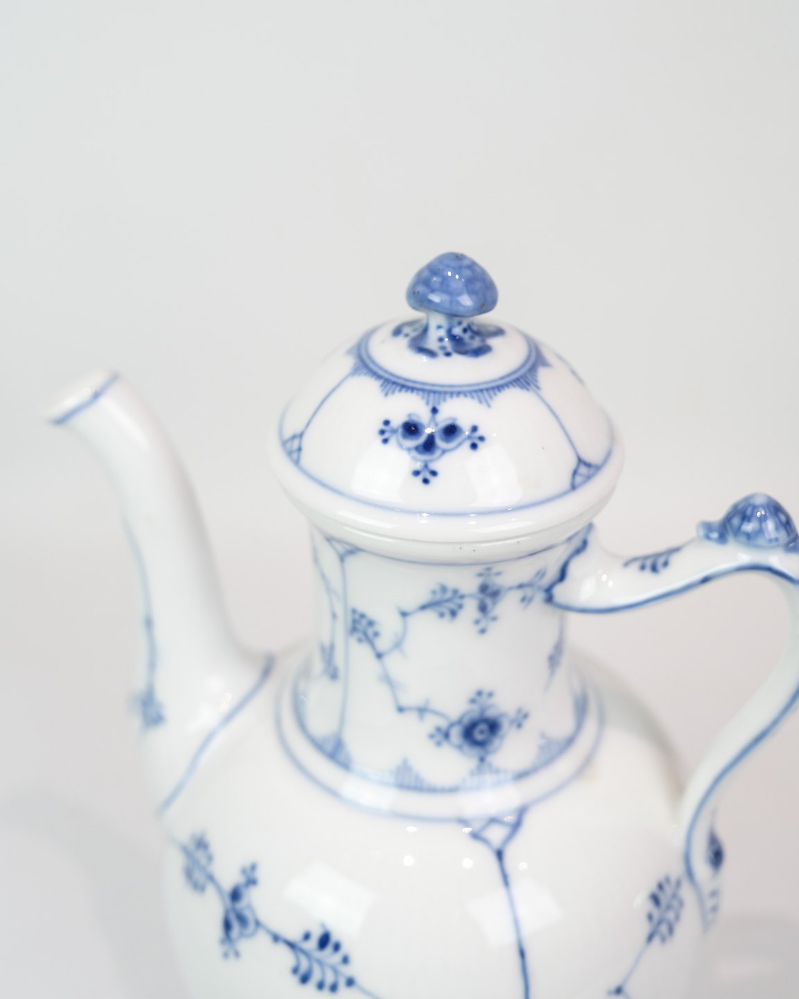 The coffee pot is a Model 1/48 in the Mussemalet Riflet series, designed by Arnold Krog for Royal Copenhagen. This coffee pot is an iconic piece of Danish porcelain, characterized by its delicate mouse-painted fluted pattern, which is a classic and timeless decoration. Arnold Krog, an important artist for Royal Copenhagen, created this design, which continues to be appreciated for its elegance and craftsmanship. The coffee pot is part of a series that includes other parts of the coffee set, and it represents the fine craftsmanship and aesthetic beauty that Royal Copenhagen is known for.