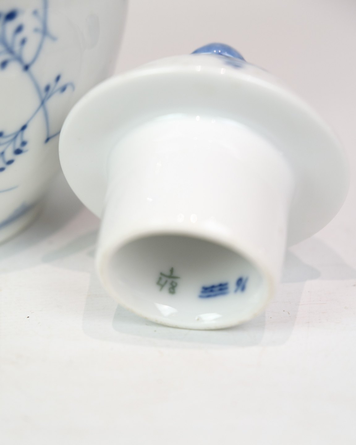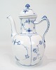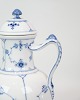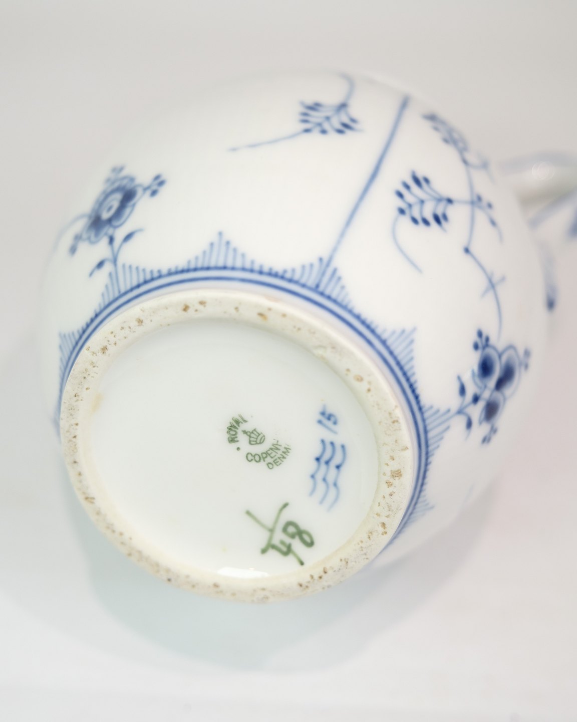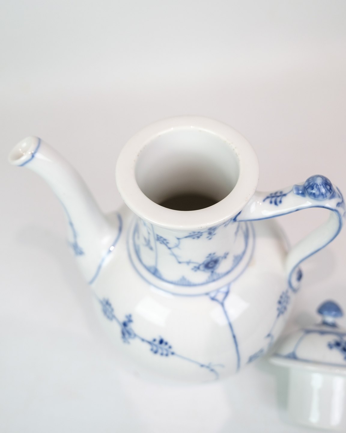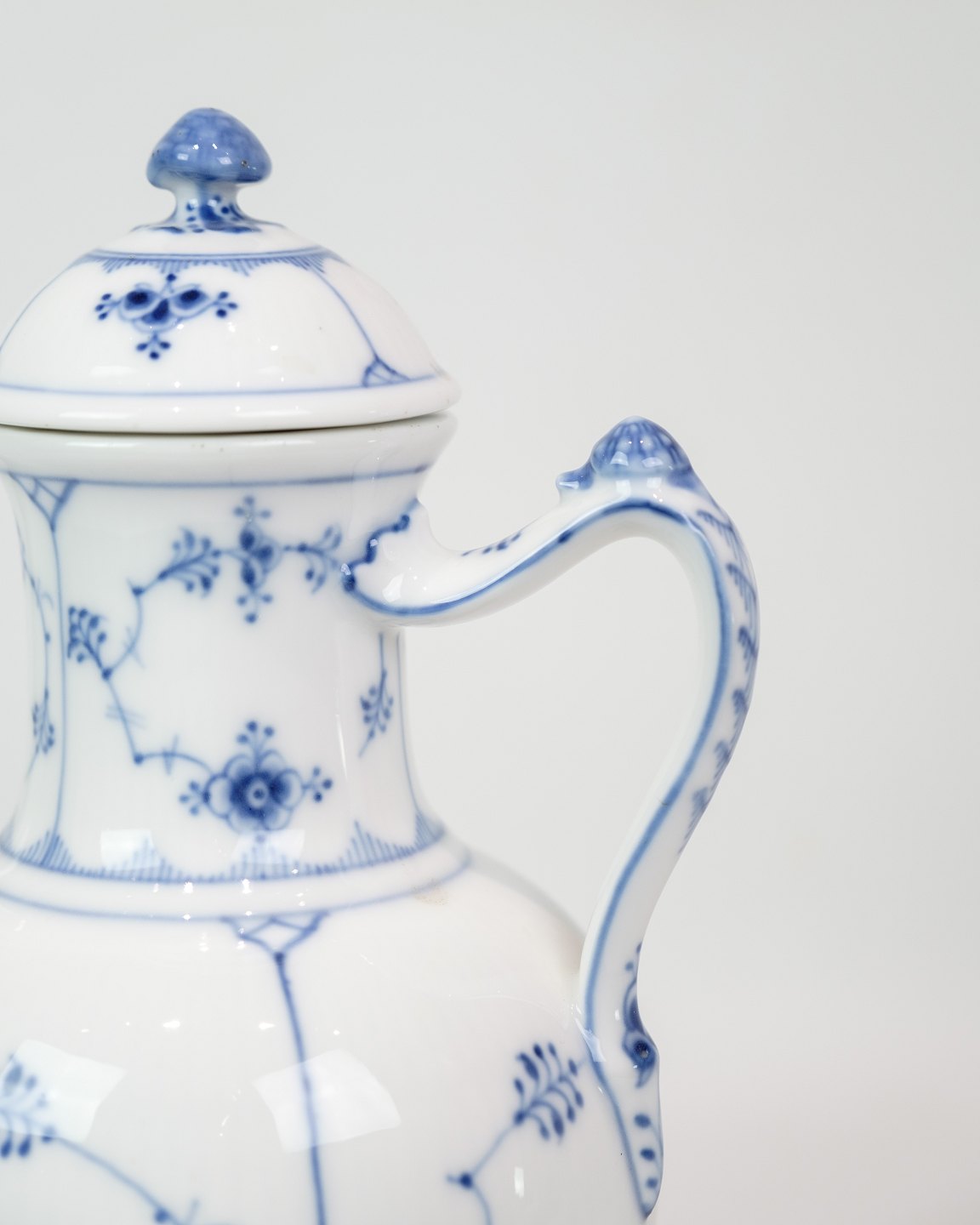 The coffee pot is a Model 1/48 in the Mussemalet Riflet series, designed by Arnold Krog for Royal Copenhagen. This coffee pot is an iconic piece of Danish porcelain, characterized by its delicate mouse-painted fluted pattern, which is a classic and timeless decoration. Arnold Krog, an important artist for Royal Copenhagen, created this design, which continues to be appreciated for its elegance and craftsmanship. The coffee pot is part of a series that includes other parts of the coffee set, and it represents the fine craftsmanship and aesthetic beauty that Royal Copenhagen is known for.