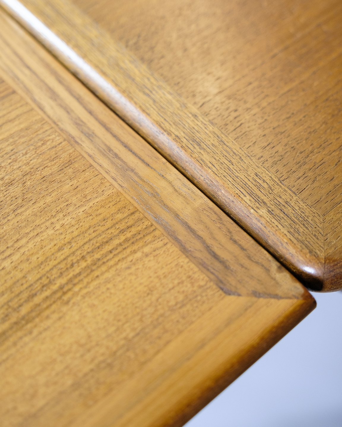 The teak dining table, created by the talented furniture designer Johannes Andersen and manufactured by Uldum Møbelfabrik in 1960, is an impressive piece of Danish furniture art. With its elegant design and craftsmanship, it makes a beautiful and functional addition to any dining area.