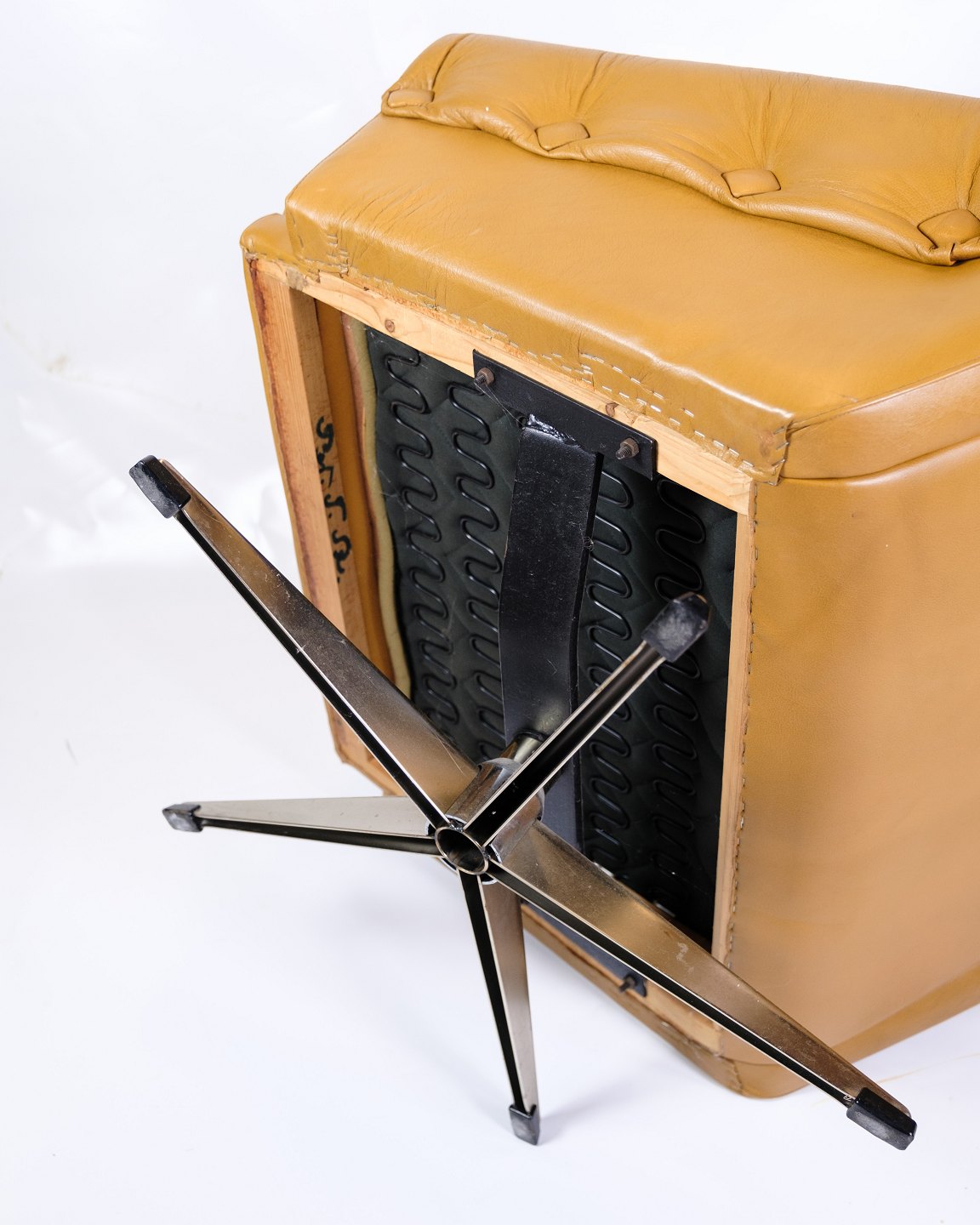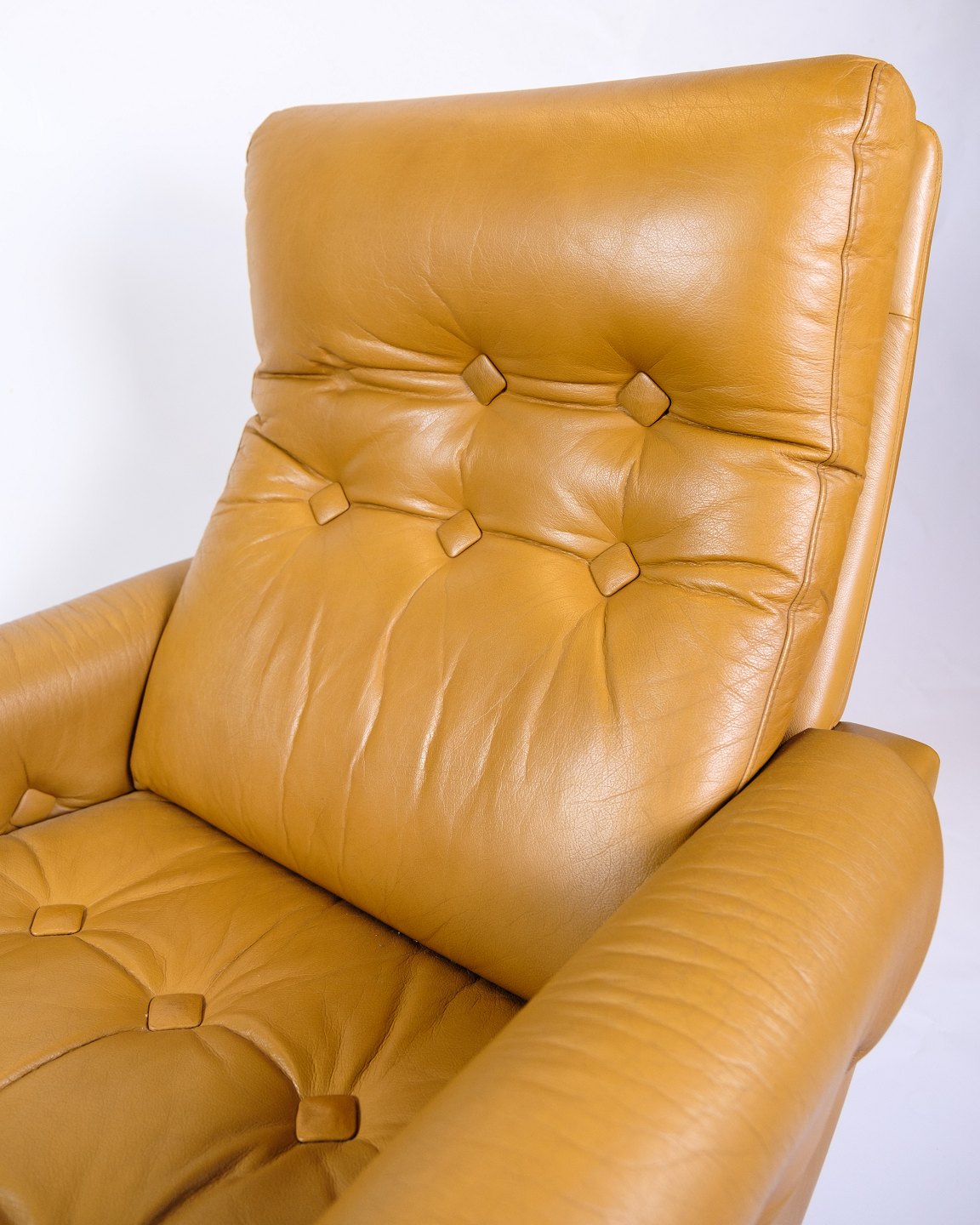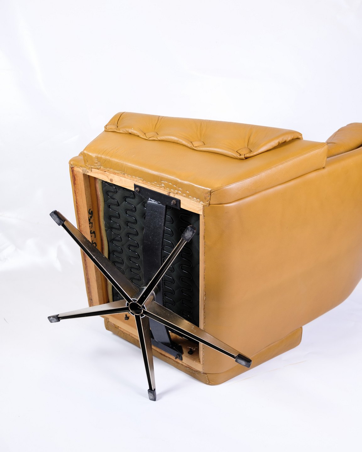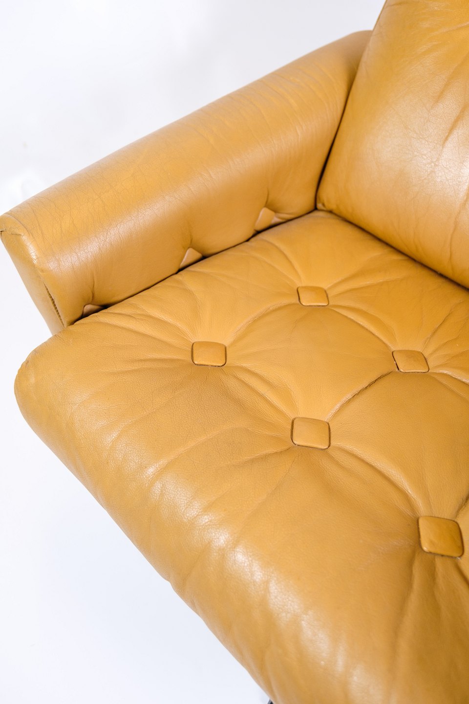 The armchair in brown leather, an example of Danish design from the 1980s, radiates both comfort and style. The deep, warm color of brown leather gives the chair a sophisticated look, while the soft leather adds a luxurious feel to any decor.